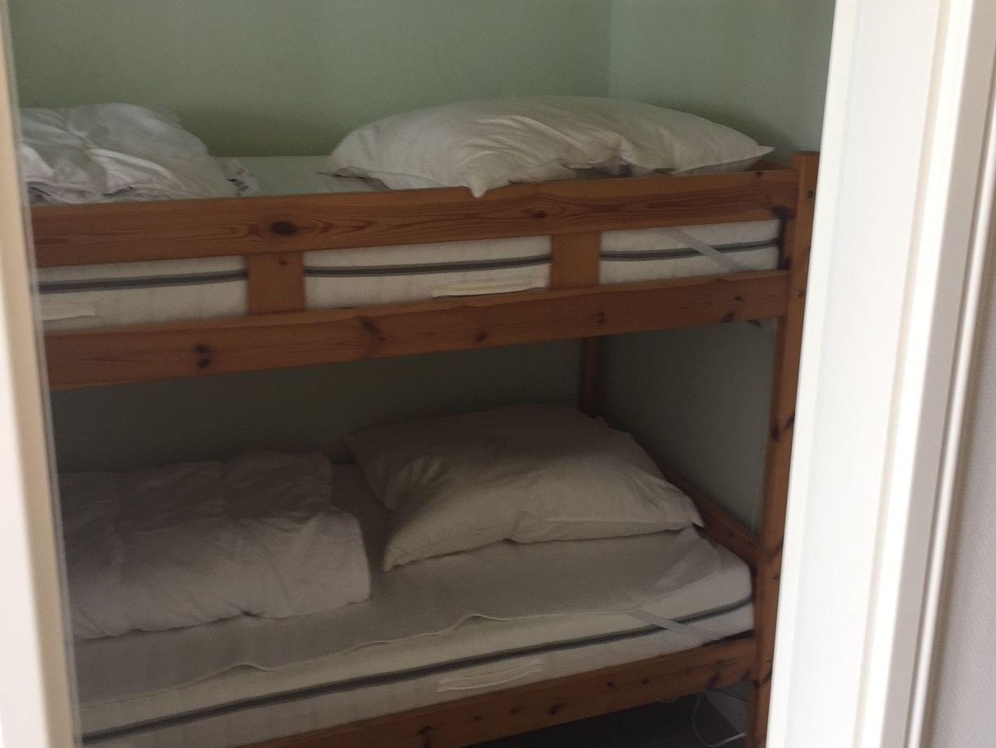 Zusätzlich zum komfortablen Doppelbett im Wohnbereich gibt es ein weiteres kleines, innen liegendes Zimmer mit zwei Schlafmöglichkeiten für Kinder oder Gäste. Ein Etagenbett mit neuen Matratzen steht hier für erholsame Nächte bereit.