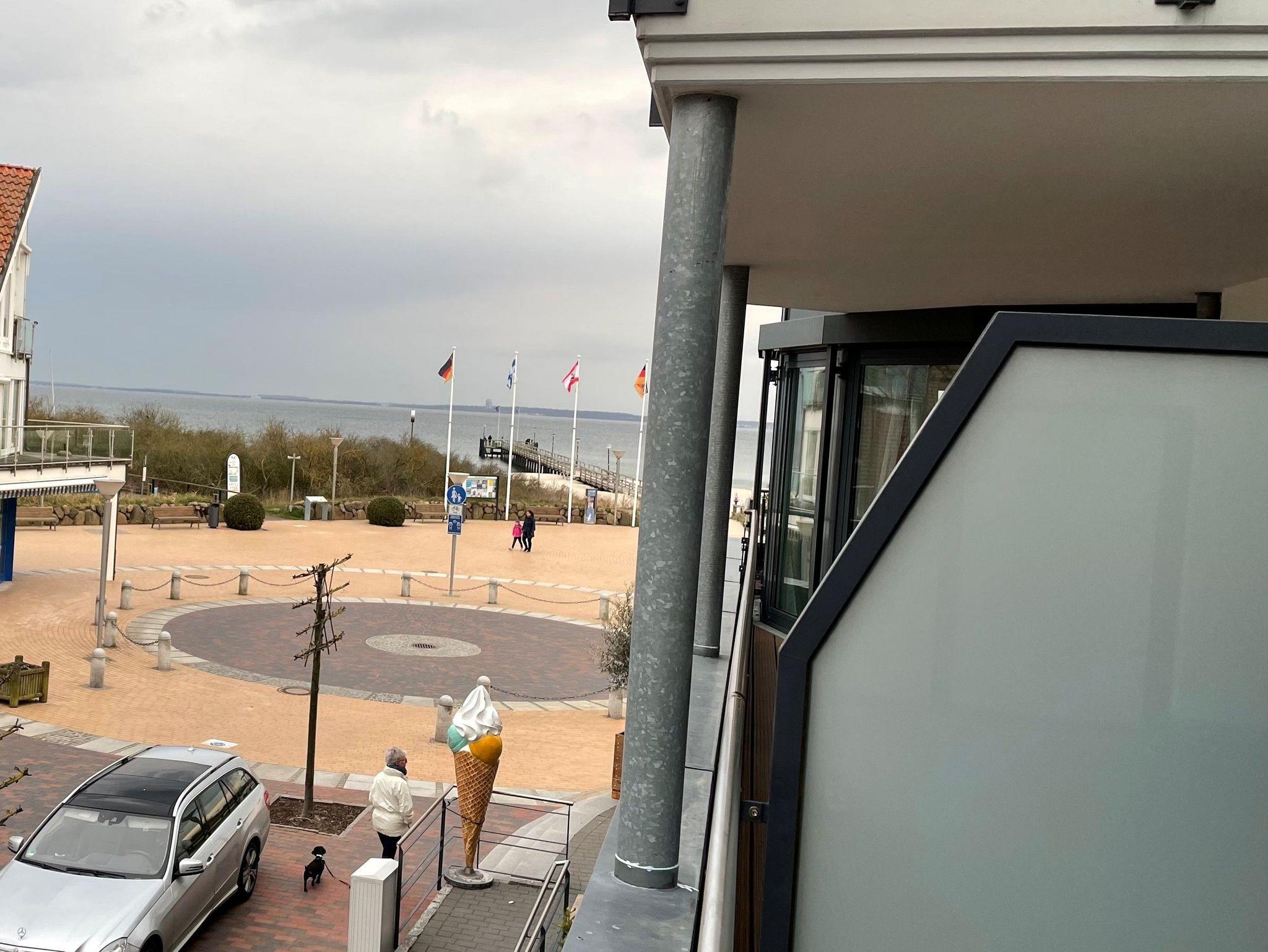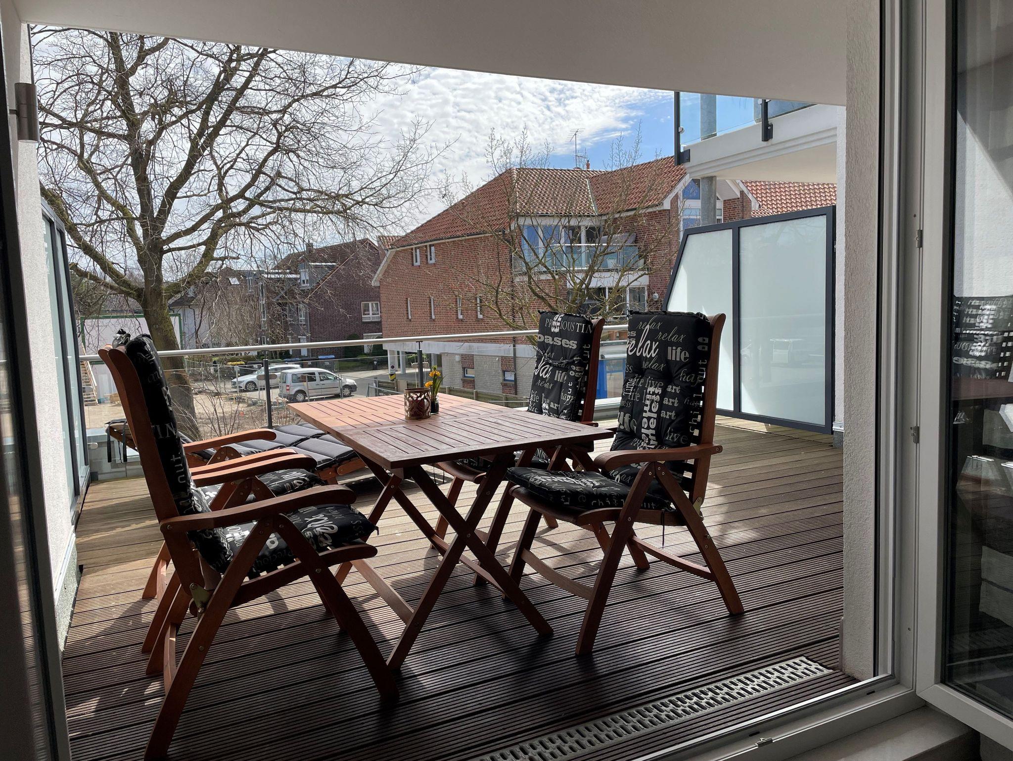 Die Beschattung durch elektrische Rollläden ist inklusive. Der mit ca. 11 m² große halbüberdachter Balkon mit einem seitlichen Blick auf die Ostsee wurde mit Bangkirai belegt. Eine Sitzgruppe bestehend aus einem Tisch mit 4 Stühlen und zwei Liegen sorgt für einen schönen Urlaubstag. Der Balkon ist leider nicht mit Rollstuhl befahrbar.
