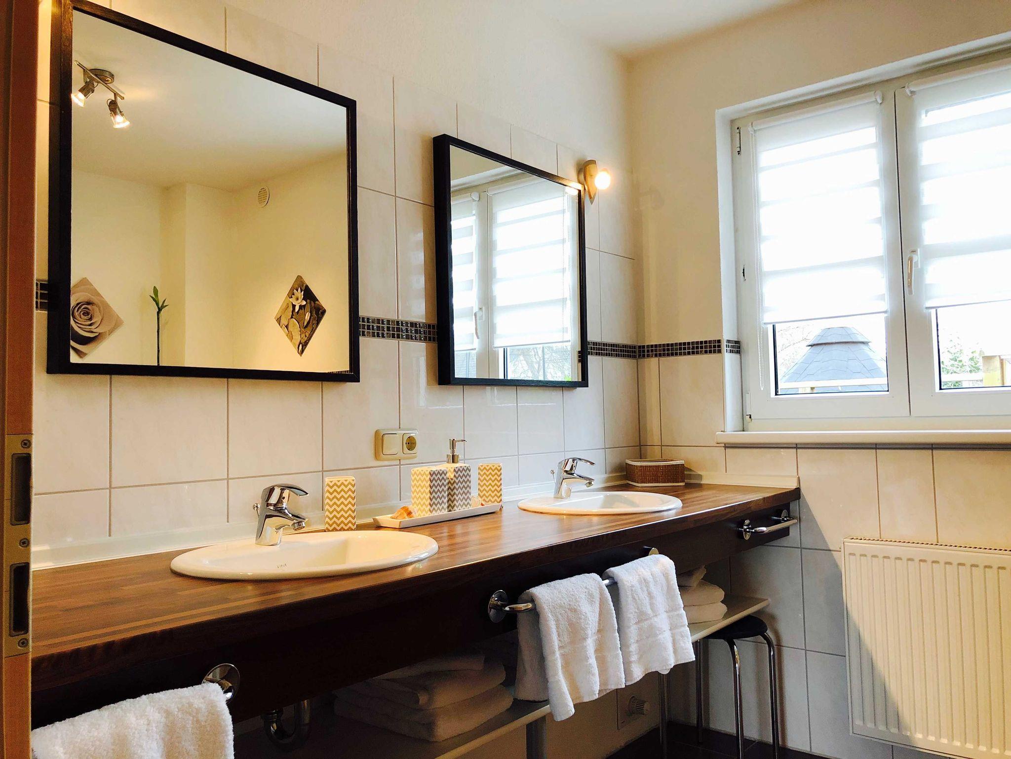 Bad: Dusche, WC, Doppelwaschbecken, Kosmetik- / Rasierspiegel, Haarfön, Fußbodenheizung, Handtücher sind inklusive.
