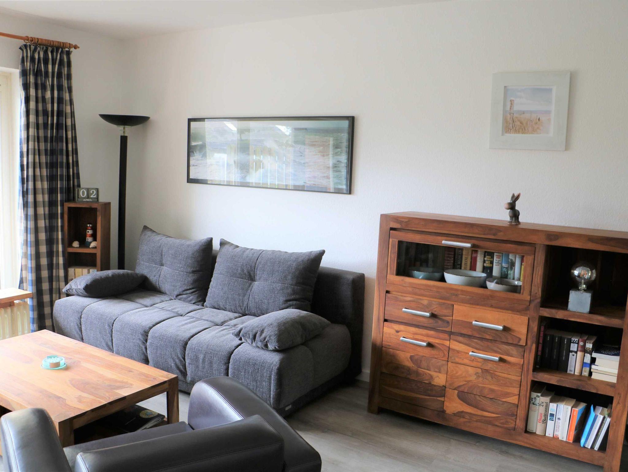 Die gemütliche 2-Zimmer-Wohnung ist zweckmäßig eingerichtet ? das gilt für das Mobiliar, Haushaltszubehör und für die elektrischen Geräte. Die Einbauküche verfügt über einen Geschirrspüler. Im großen Schrank im Flur, sowie in der Kommode im Schlafzimmer, gibt es genug Platz für das Urlaubsgepäck. Hinweis an Senioren: da das Schlafzimmer recht schmal ist, kann man in das 1,60 m breite Bett nur von vorn einsteigen! Als Alternative steht das Schlafsofa im Wohnzimmer zur Verfügung. Von der Terrasse mit Strandkorb hat man den Kinderspielplatz im Garten gut im Blick.