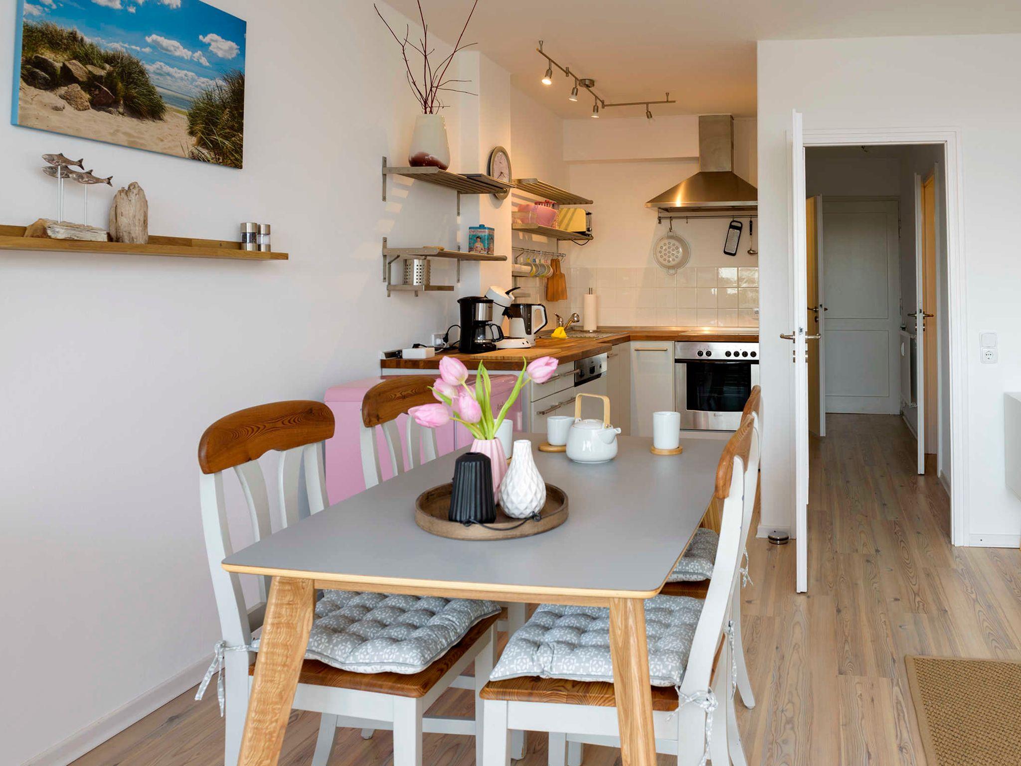 Die zum Wohnraum offene Küche ist komplett ausgestattet: Herd mit Backofen, Geschirrspülmaschine, Kühl-/Gefrierkombi, Kaffeefilter- sowie Padmaschine, Sodastream etc. Reinigungsmittel und Geschirrhandtücher liegen bereit.