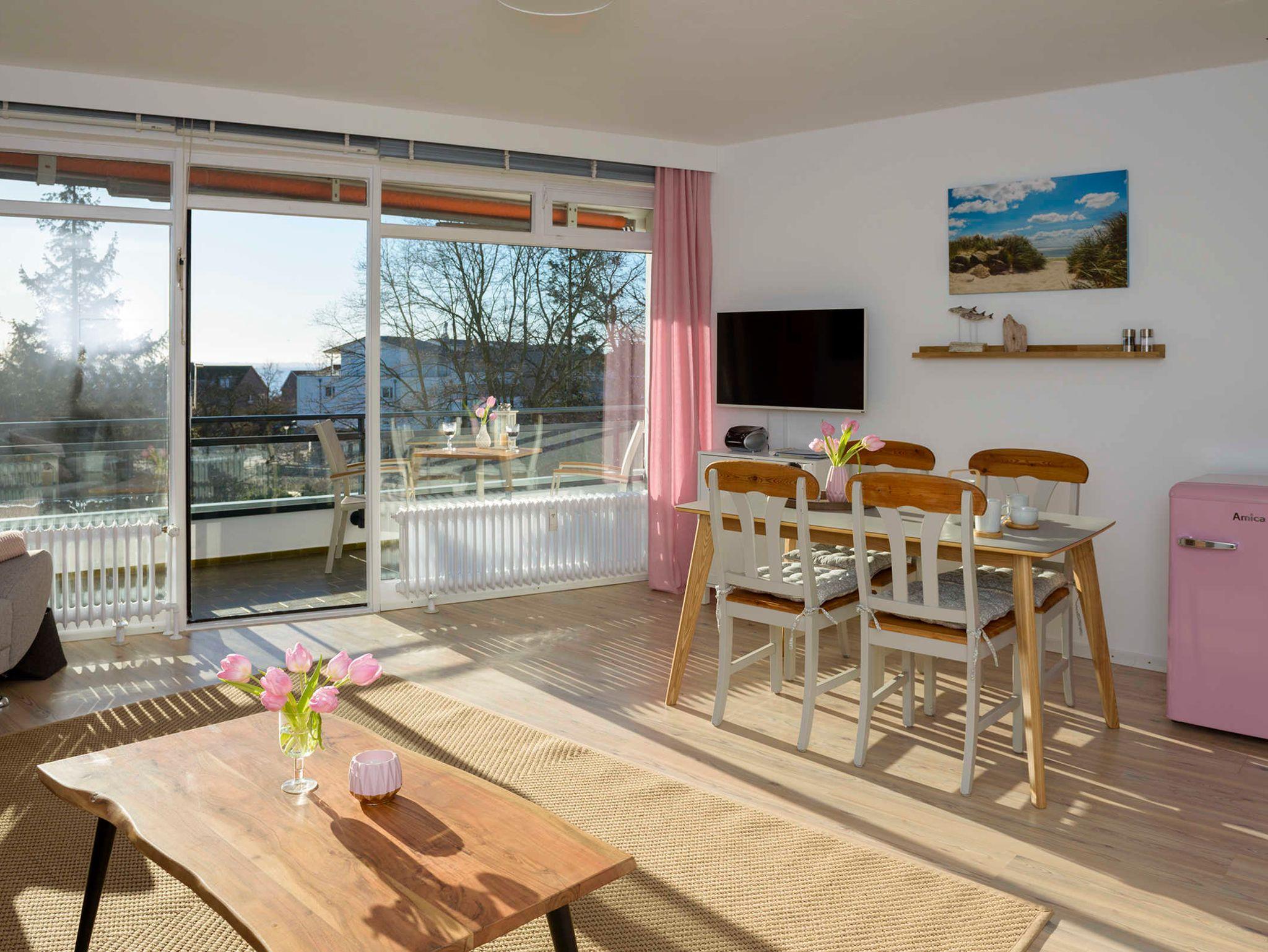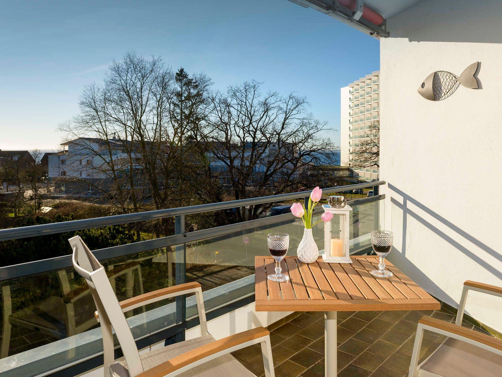 Vom Wohnzimmer treten unsere Gäste auf die mit Balkonmöbeln ausgestattete Loggia in Südlage. Von hier kann man sogar die Ostsee sehen!
