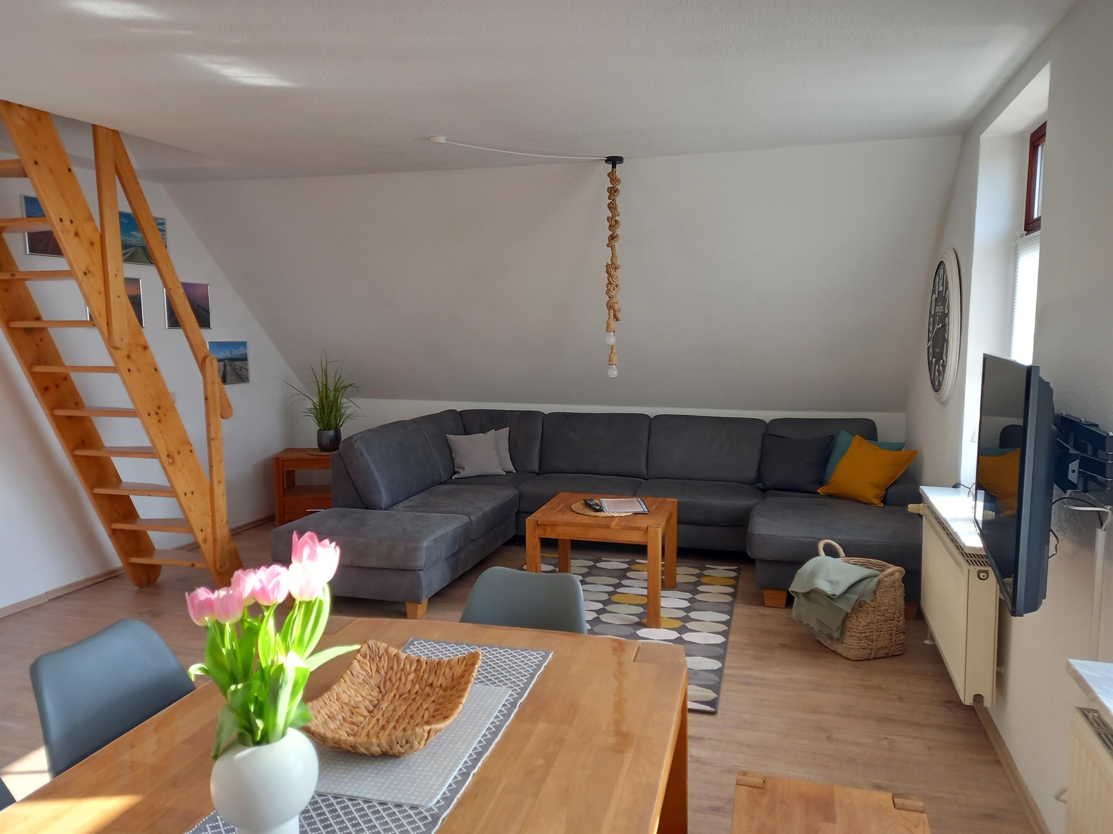 Die 62m² große komfortabel eingerichtete Wohnung liegt im ersten Stock. Kostenfreies WLAN ist verfügbar. Das Wohnzimmer ist mit einer Sitzecke, Essbereich, SAT-TV ausgestattet. Vom Wohnbereich führt eine Treppe nach oben zur Chillout Zone, die zum entspannten relaxen einlädt und den Wohnraum erweitert. Die gut ausgestattete Küche, in der sich auch ein Esstisch befindet, ist zusätzlich mit Geschirrspüler, Mikrowelle und einer Senseo Kaffeemaschine ausgestattet. 1 Schlafzimmer enthält ein Doppelbett. 1 Schlafzimmer enthält 2 Einzelbetten. Bei Bedarf stehen ein Reisebabybett sowie ein Hochstuhl für die Kleinen zur Verfügung. Im Wohnzimmer ist des weiteren eine Schlafcouch vorhanden, die ggf. genutzt werden kann. Vom Balkon aus hat man Blick auf die Ostsee. Das Duschbad / WC verfügt über eine Waschmaschine mit Trockner.