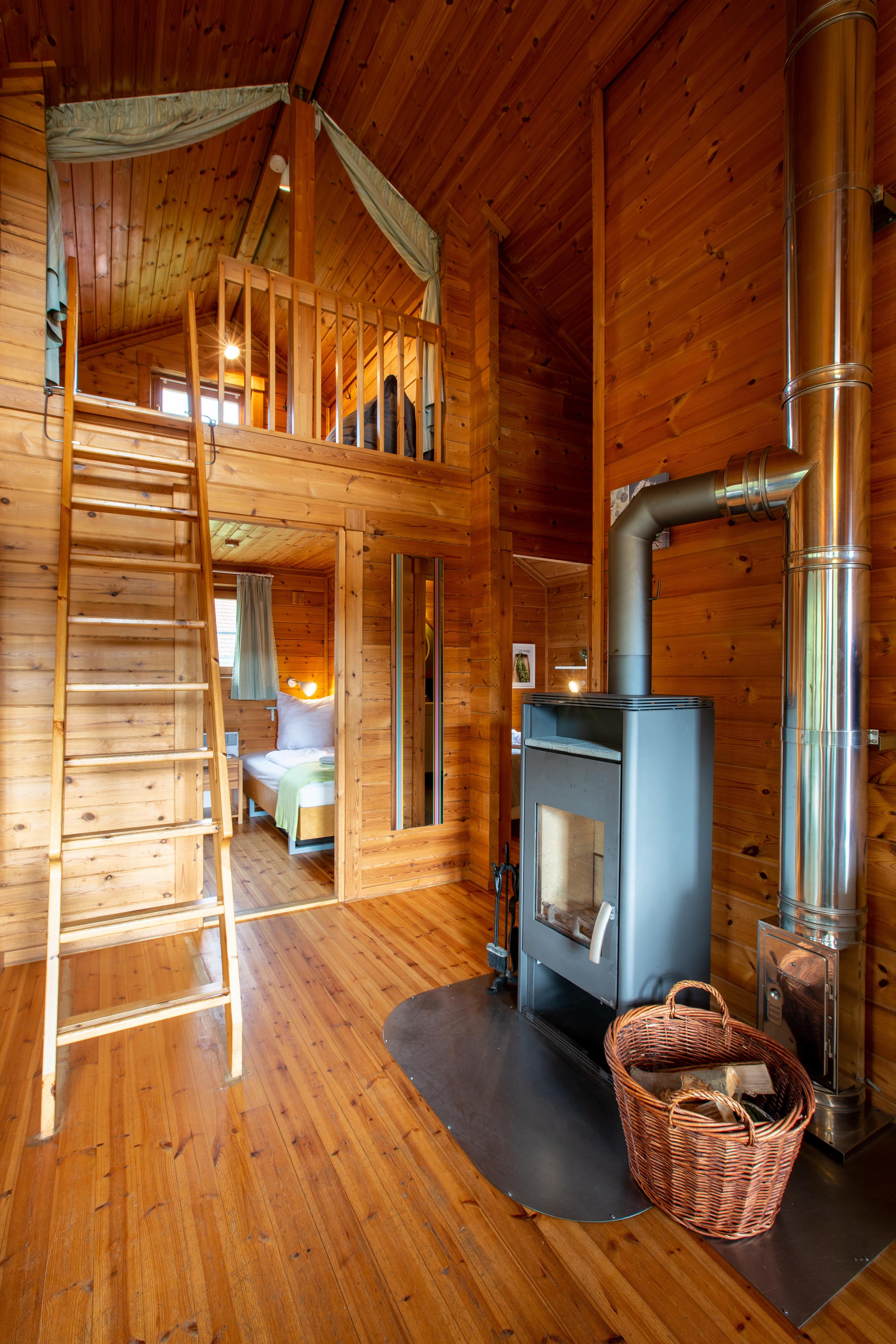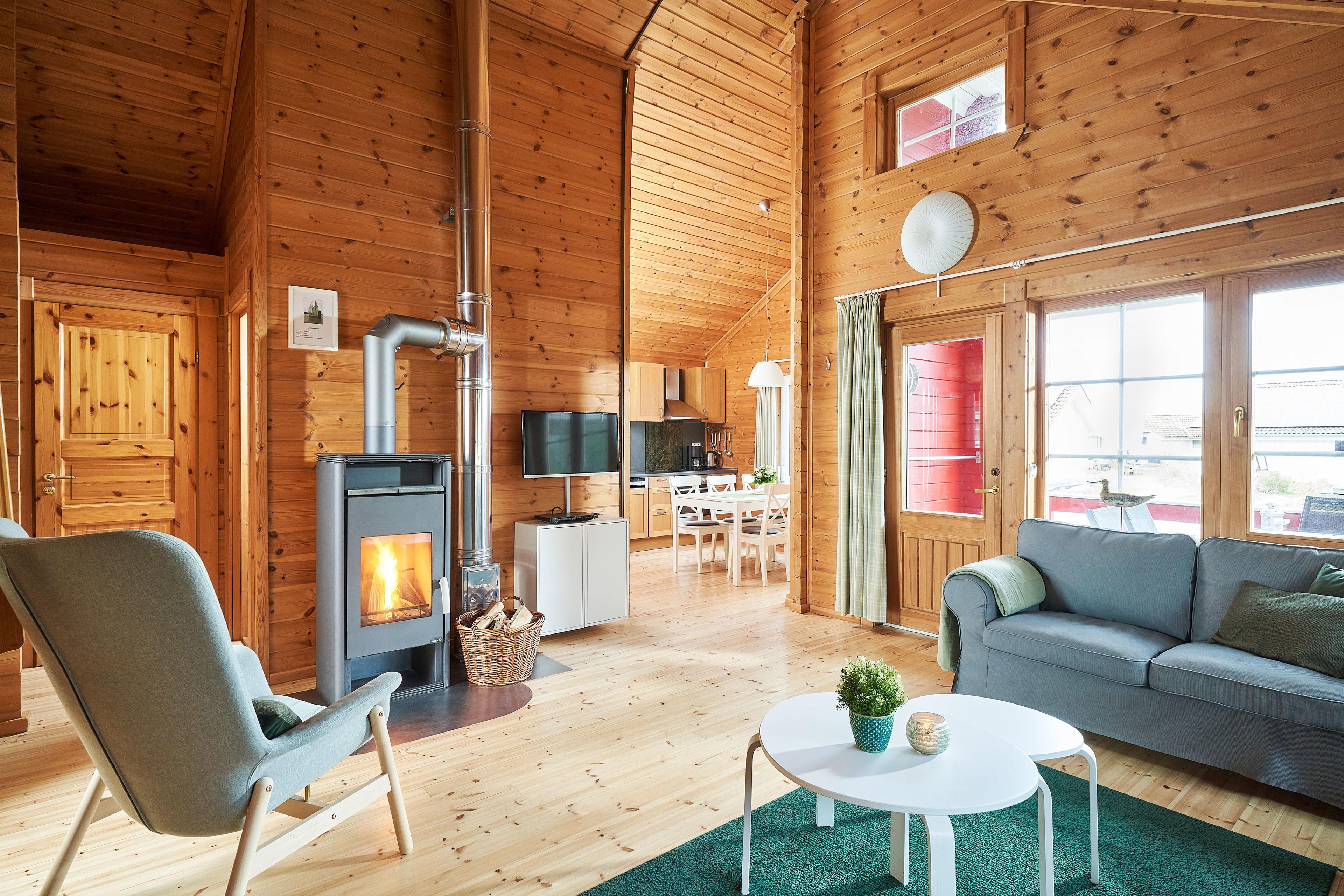 Die Schärenhäuser sind mit drei abgeschlossenen Schlafzimmern für sechs Personen ausgelegt. Die Eichenmöbel sowie die Farben Mint und Grün unterstreichen den frischen Landhausstil der Blockhäuser. Die Chill-Empore lädt exklusiv zum Relaxen ein und ist unter anderem mit einem extra Fernseher und Sitzsäcken ausgestattet.