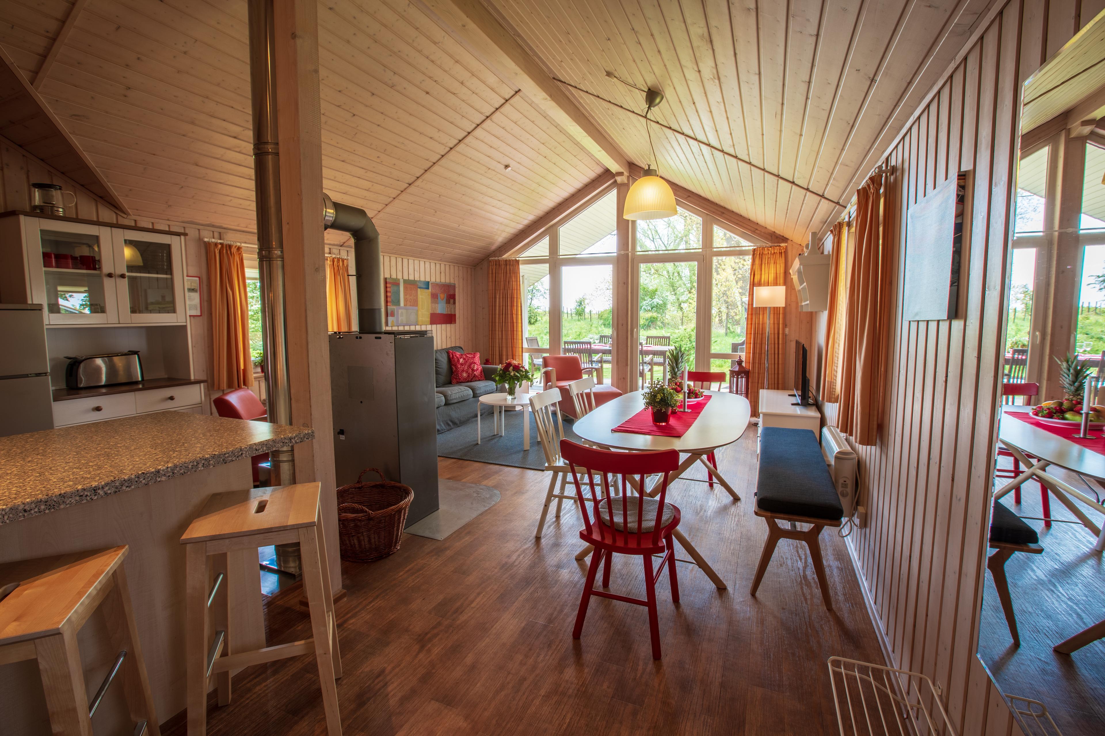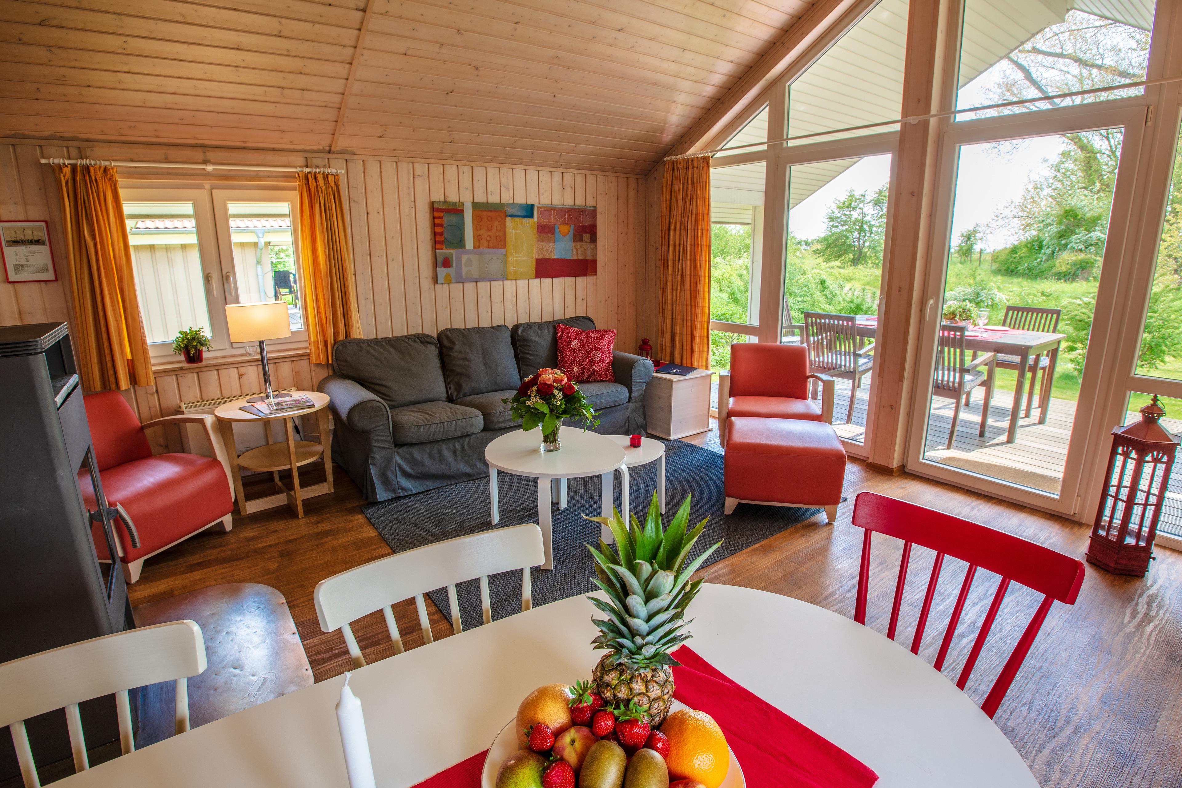 Der Kamin ist auch hier der Mittelpunkt des Wohnbereiches. Das Ambiente des Strandhauses wird durch die Farben rot und weiß kraftvoll und modisch akzentuiert. Der direkte Strandzugang liegt nur wenige Schritte von der Terrasse entfernt. Dieses Haus hat keine eigene Sauna.