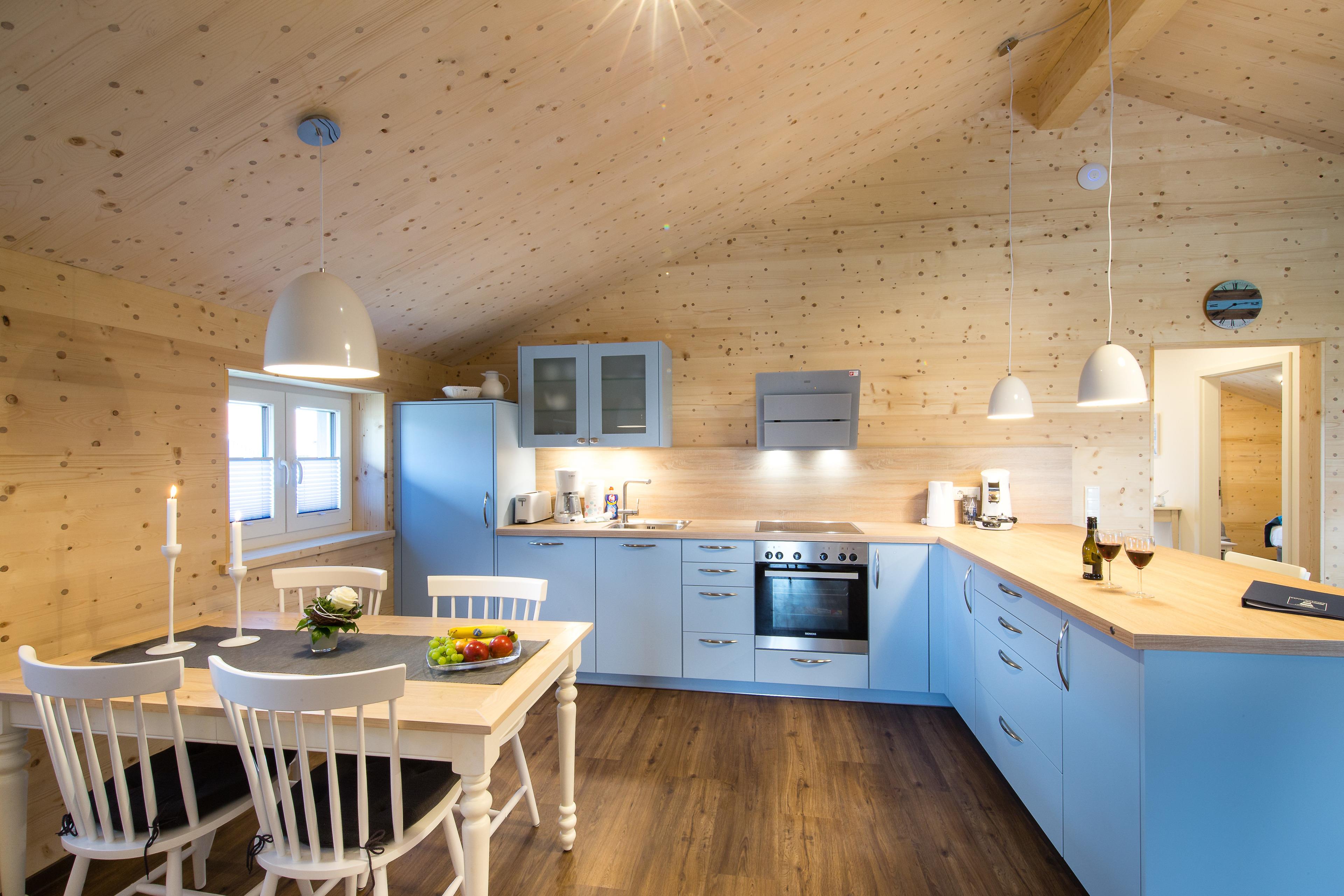 Die Skipperhäuser (Typ A plus) verfügen über zwei separate Schlafzimmer mit Boxspring-Doppelbetten. Der großzügige Wohnraum geht in den offenen Küchen- und Essbereich über. Der Kaminofen bildet das Zentrum des Wohnraumes und lädt zu gemütlichen Abenden ein. Vom Badezimmer mit Dusche gibt es einen direkten Zugang zur Sauna. Die Terrasse mit Zugängen vom Wohn- und einem der Schlafzimmer rundet den Aufenthalt ab.