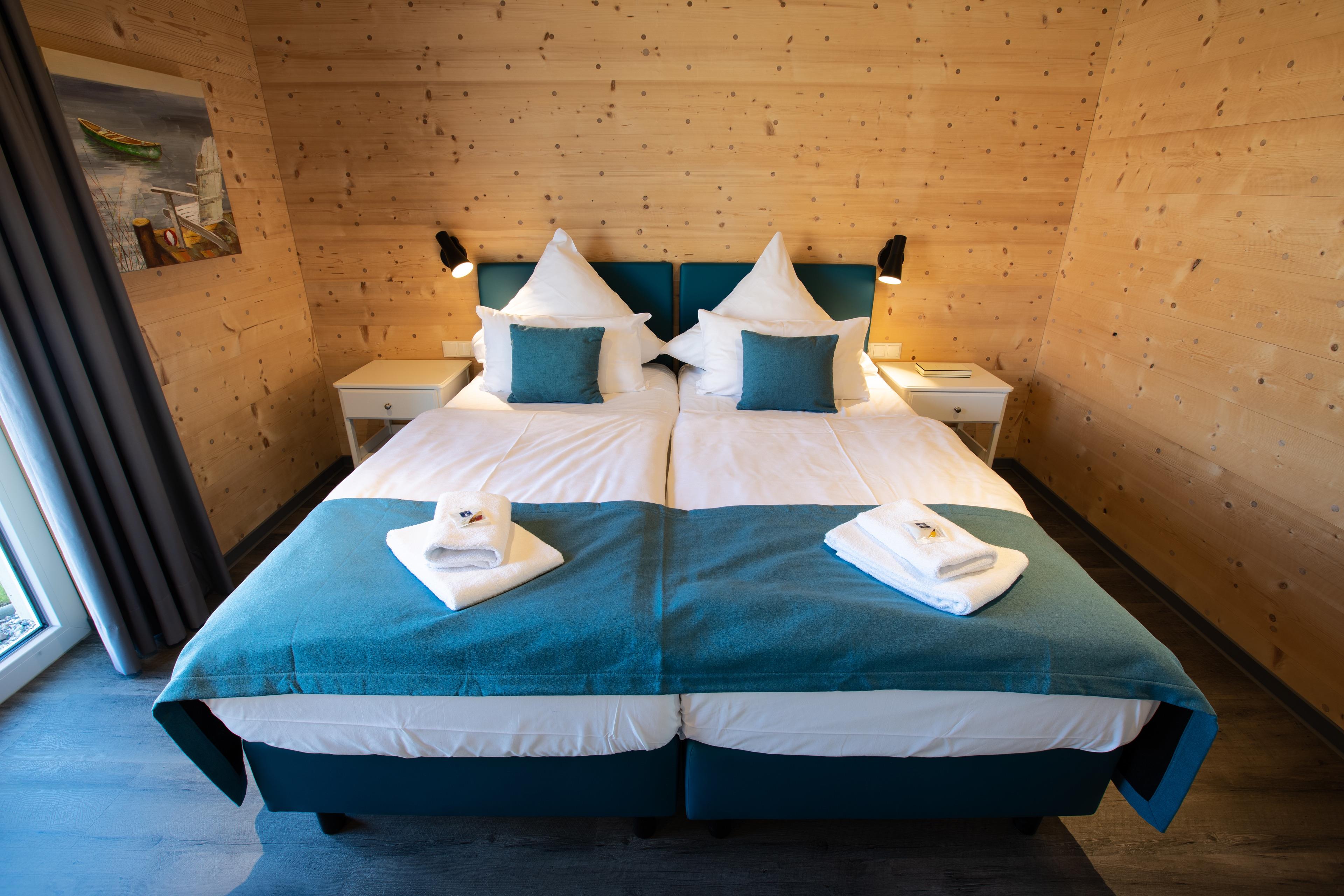 Die Reederhäuser verfügen über zwei separate Schlafzimmer mit Boxspring-Doppelbetten. Dieser Haustyp bietet eine große offene Küche mit Essecke und einen offenen Übergang zum Wohnbereich mit Kaminofen. Ein Vollbad mit Badewanne, Dusche und Sauna sowie ein separates Gäste-WC runden die Ausstattung ab.
