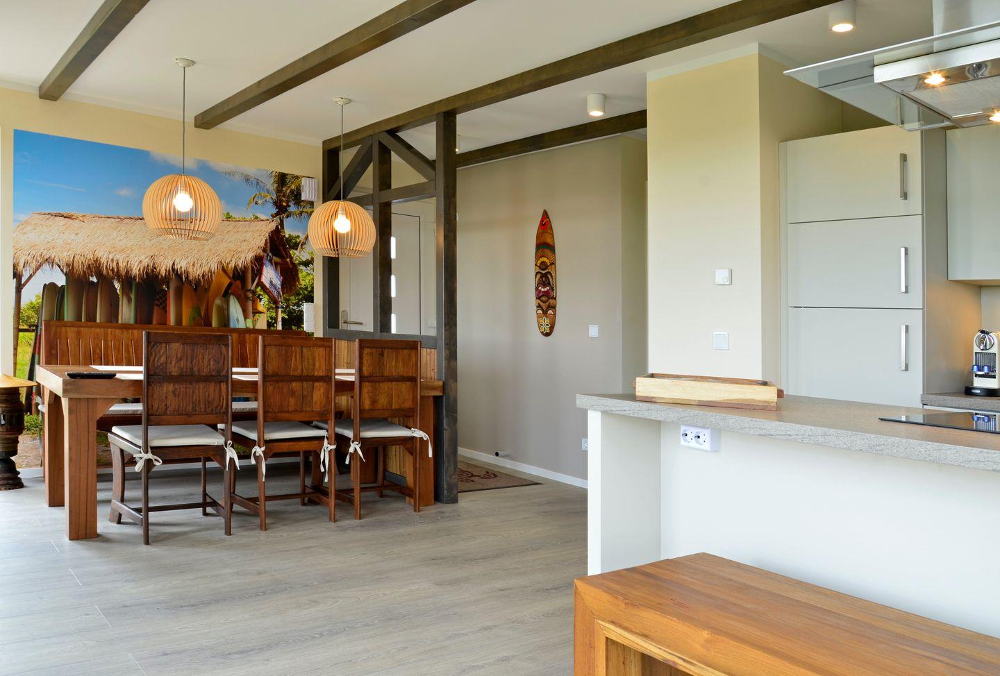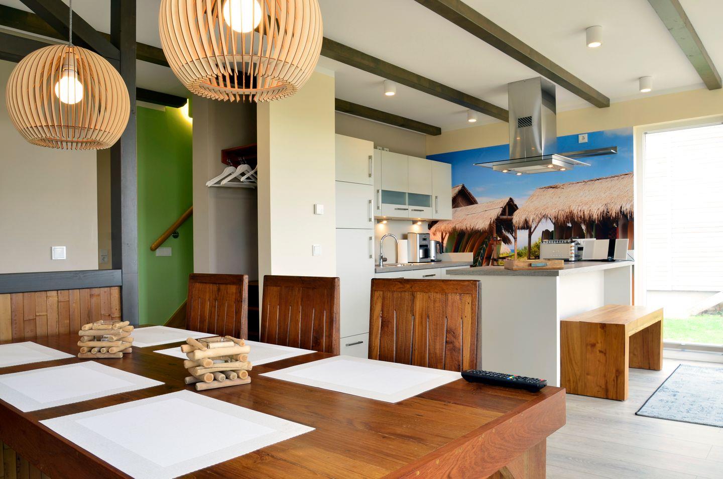 In erster Reihe gelegen und mit direktem Zugang zum Strand, genießen Sie in den Ferienhäusern des Typs A von Terrasse und Balkon eine freie Aussicht auf die Ostsee. Mit einer Wohnfläche von 100 m2 auf zwei Ebenen erwartet Sie Ihre helle und großzügige Unterkunft mit erlesenem Mobiliar und hawaiianischem Flair. Mit drei Schlafzimmern und zwei Badezimmern sind die A-Ferienhäuser ideal für größere Familien und Urlaub mit Freunden geeignet. Zwei Schlafzimmer und ein Duschbad befinden sich im Erdgeschoss, ein weiteres Schlafzimmer sowie ein Vollbad mit Badewanne und Dusche im Obergeschoss. Dazu lädt eine offene, hochwertig ausgestattete Küche zum geselligen Beisammensein ein. Das geräumige Wohnzimmer im 1. Stock mit Kamin und Balkon bietet zusätzlichen Aufenthaltsraum und verwöhnt Sie mit einem traumhaften Ostseeblick.