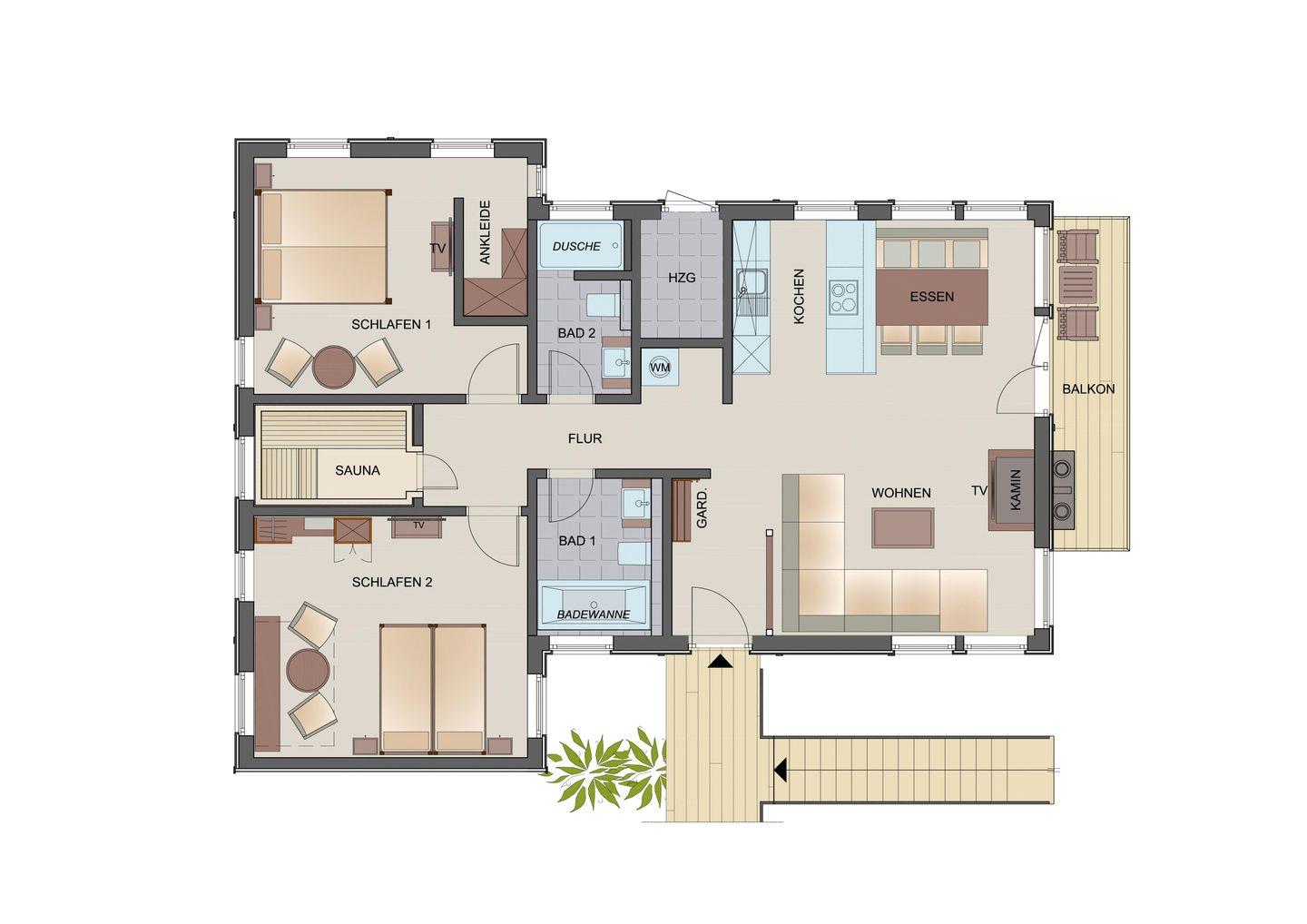 Auf 90 m2 umfassen die Ferienwohnungen D2 zwei Schlafzimmer mit je einem Doppelbett und auf Wunsch mit einem zusätzlichen Bett für eine fünfte Person. Ausgestattet mit zwei Badezimmern, einer offenen Küche mit Esstisch und einer gemütlichen Sofaecke, Kamin und Sauna laden unsere Ferienwohnungen zum entspannten Ostseeurlaub zu jeder Jahreszeit ein. Die Ferienwohnungen im Erdgeschoss besitzen eine große, umlaufende Holzterrasse mit Grill. Im Obergeschoss erwartet Sie ein möblierter Balkon, von dem Sie über das gesamte Feriendorf in Richtung Ostsee blicken.
