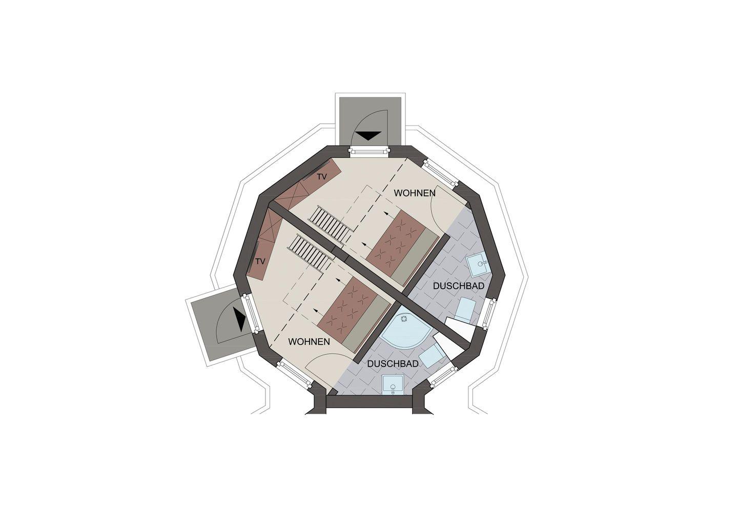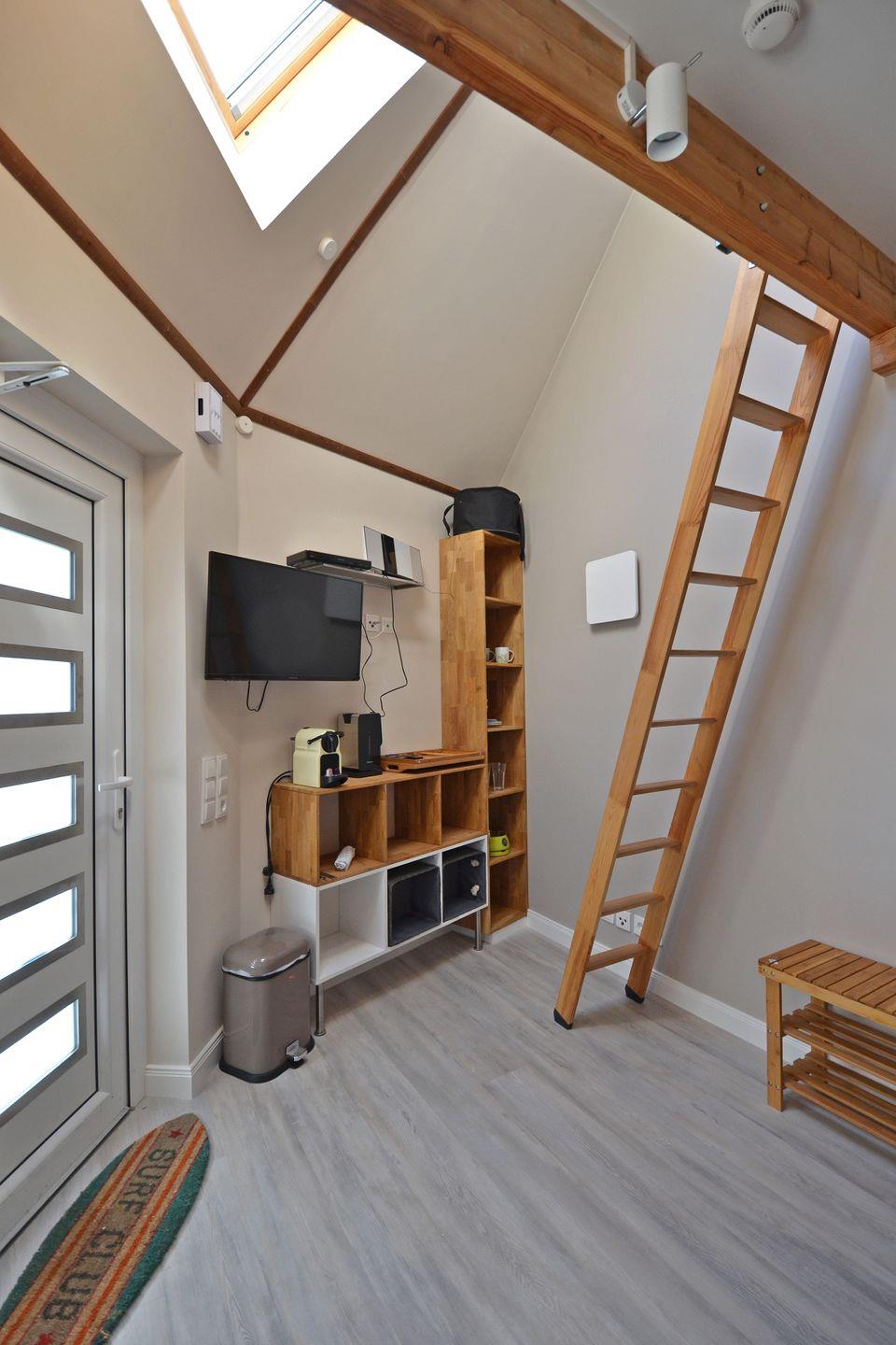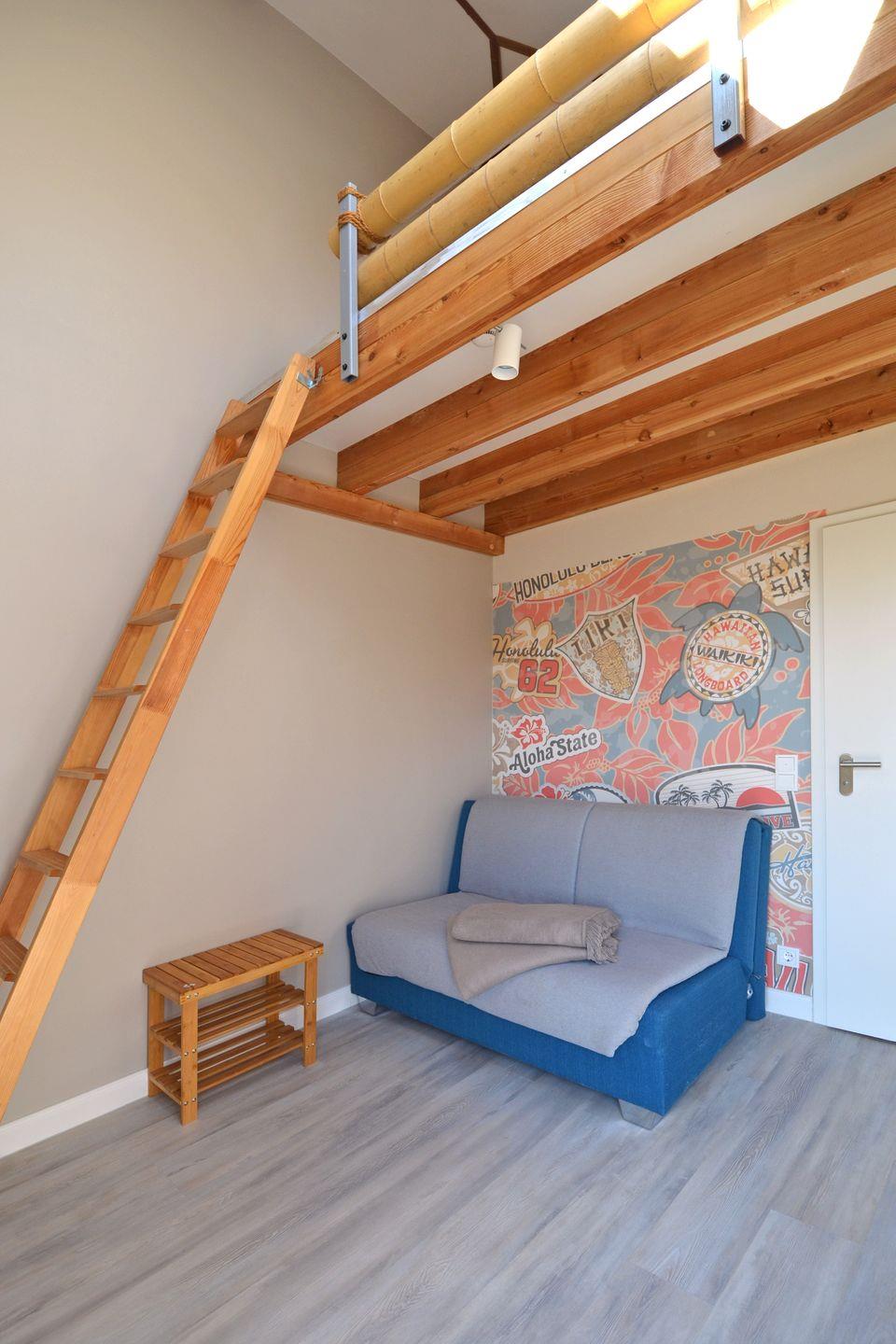 Das Doppelzimmer im Hostel-Stil verfügt über 12,5 m2, ist über zwei Ebenen konzipiert und besitzt einen separaten Eingang. Im unteren Bereich befindet sich ein modernes Duschbad, ein gemütliches Sofa sowie eine Kühlbox. Über eine kleine Treppe erreichen Sie die Schlafempore mit einem Doppelbett.