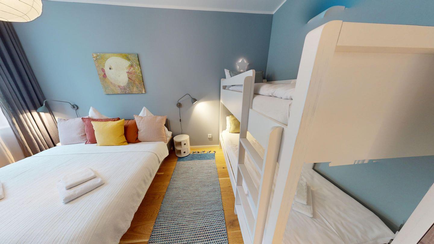 In dieser Wohnung gibt es zwei ruhige Schlafzimmer nach hinten gelegen, eins mit Doppelbett und eins mit Doppelbett und zusätzlichem Etagenbett. Besonders komfortabel sind die beiden Badezimmer, eines mit einer großzügigen Dusche und Badewanne sowie ein kleineres Gästebad mit Dusche.