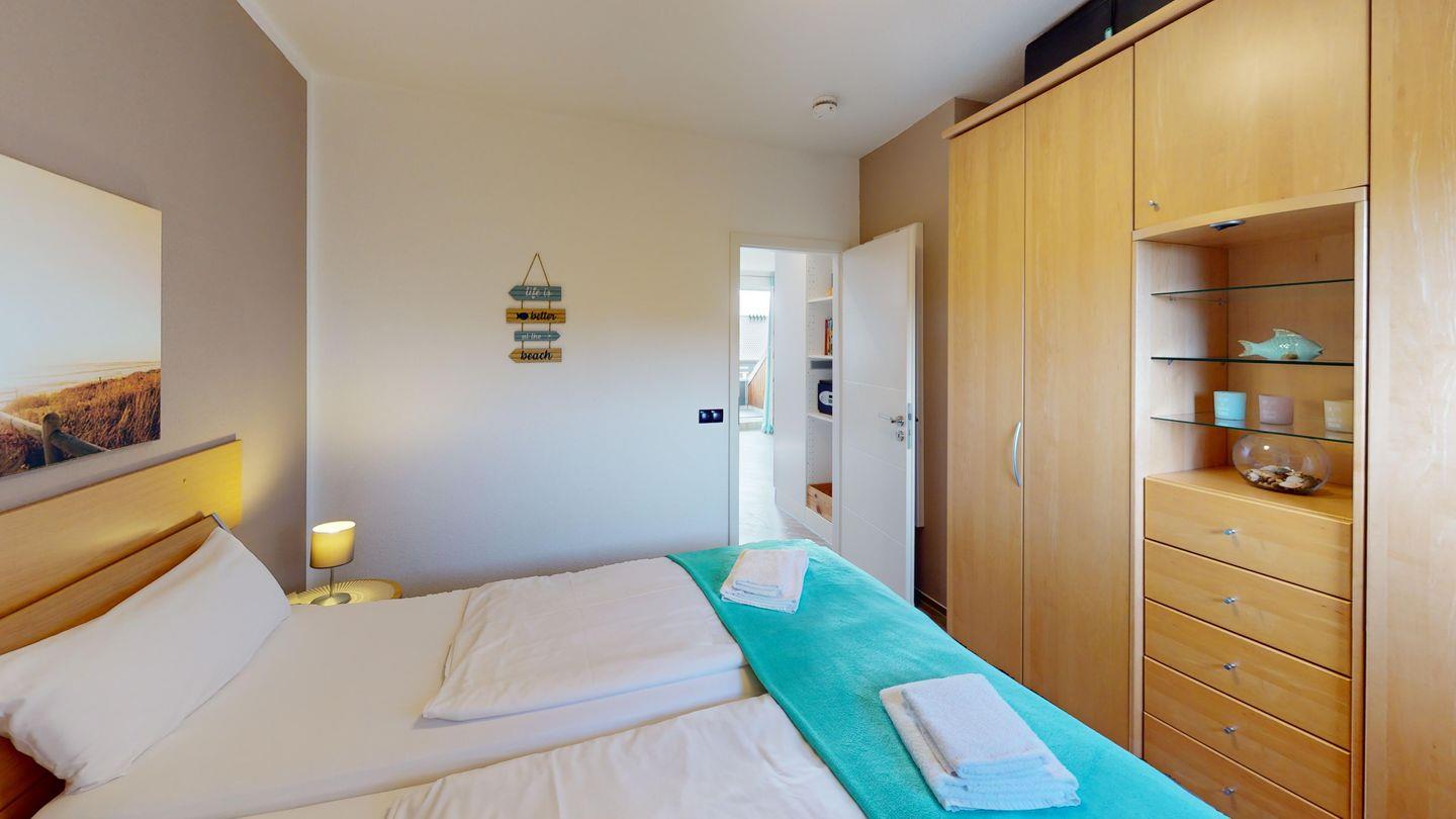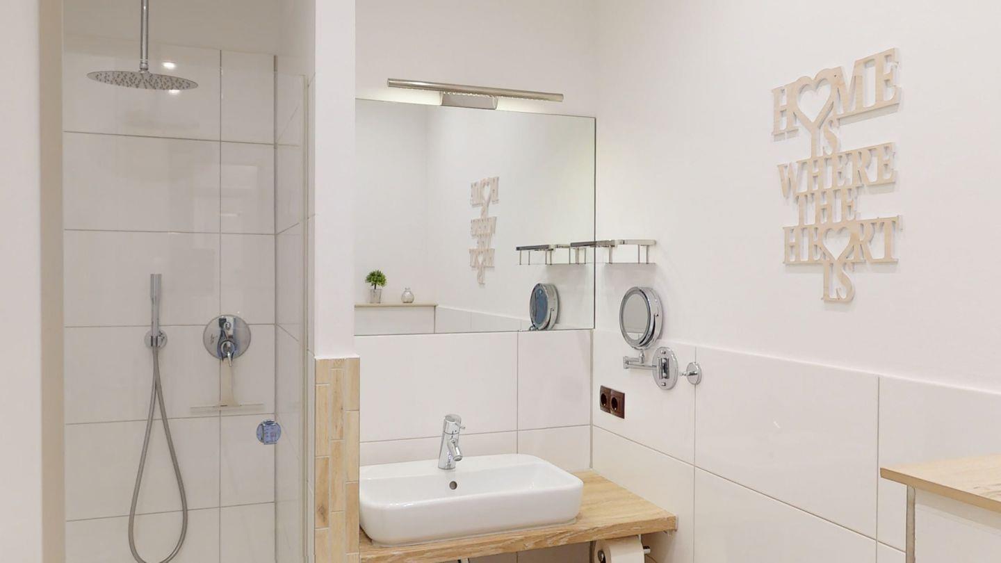In der Wohnung gibt es ein modernes Bad mit Dusche. Die erste Schlafmöglichkeit ist ein Doppelbett im separaten Schlafzimmer. Die andere Schlafmöglichkeit bietet das großzügige, ausziehbare Ecksofa im Wohnbereich, jeweils für zwei Personen.