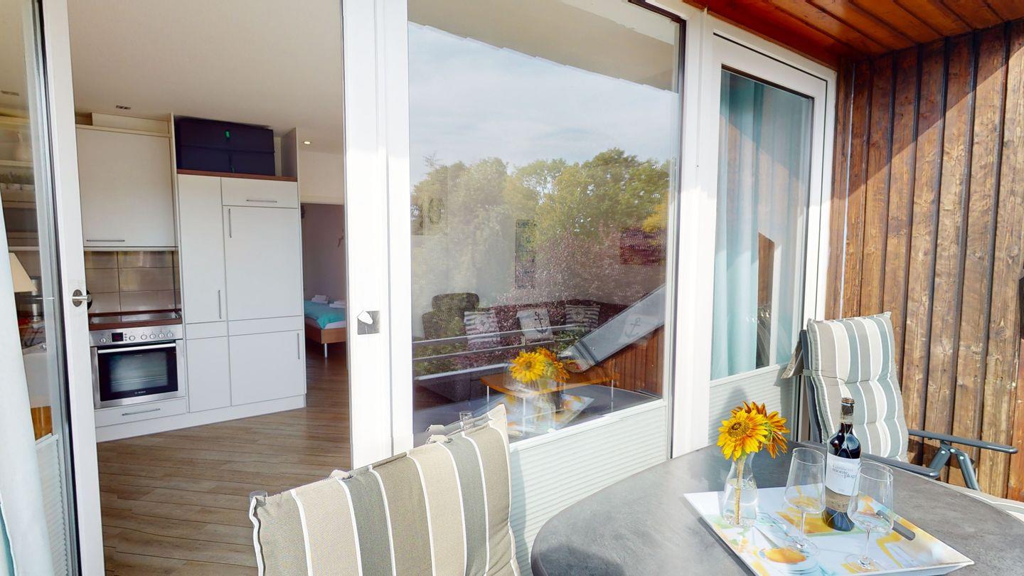 In dieser Ferienunterkunft erwartet Sie ein gemütlicher, einladender Wohn-/Essbereich mit einer schicken Küchenzeile und einem Zugang zum möblierten Balkon, der zum Verweilen einlädt.