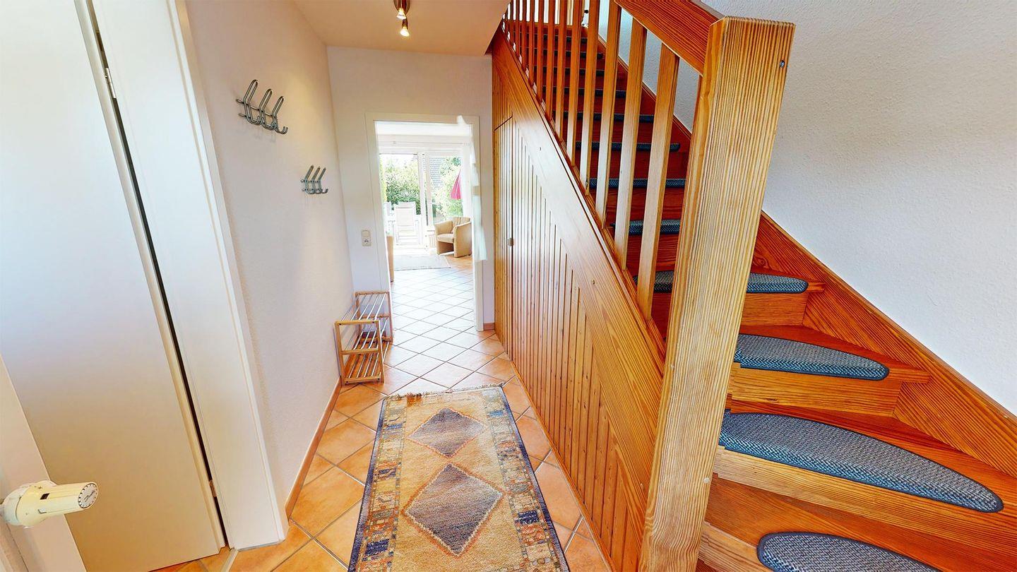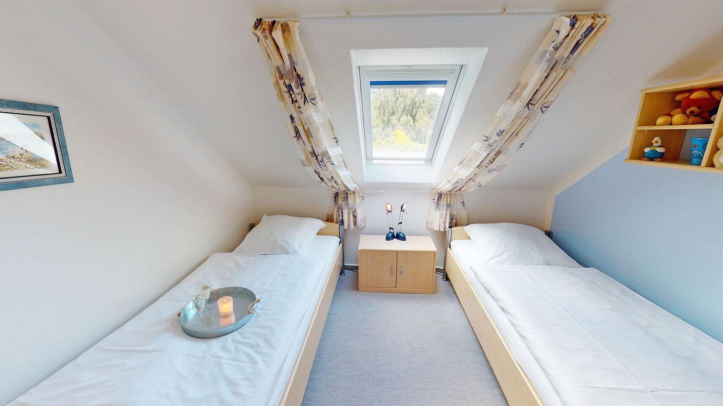 Im Erdgeschoss befinden sich das gemütliche Wohnzimmer mit einem offenen Essbereich und angrenzender Küchenzeile sowie ein Duschbad mit WC. Über die Treppe gelangt man in das Obergeschoss. Hier stehen zwei Schlafzimmer zu Ihrer Verfügung. Eines mit einem großem Doppelbett. Das Zweite mit zwei bequemen Einzelbetten.