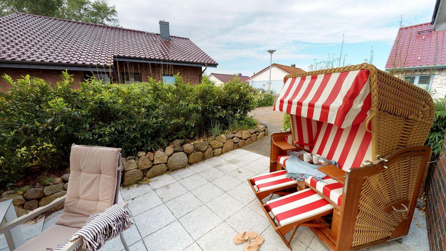 Zum Haus gehört eine möblierte Terrasse mit Strandkorb und Kamingrill sowie ein Garten mit Liegewiese und Kinderspielgerüst - ideal für sonnige Stunden.