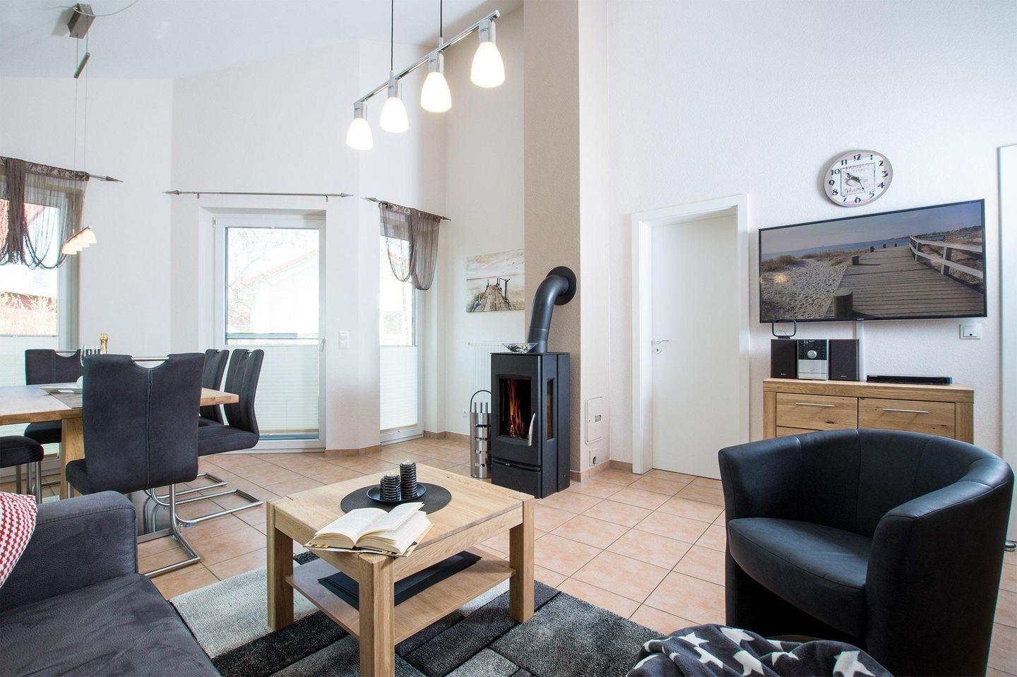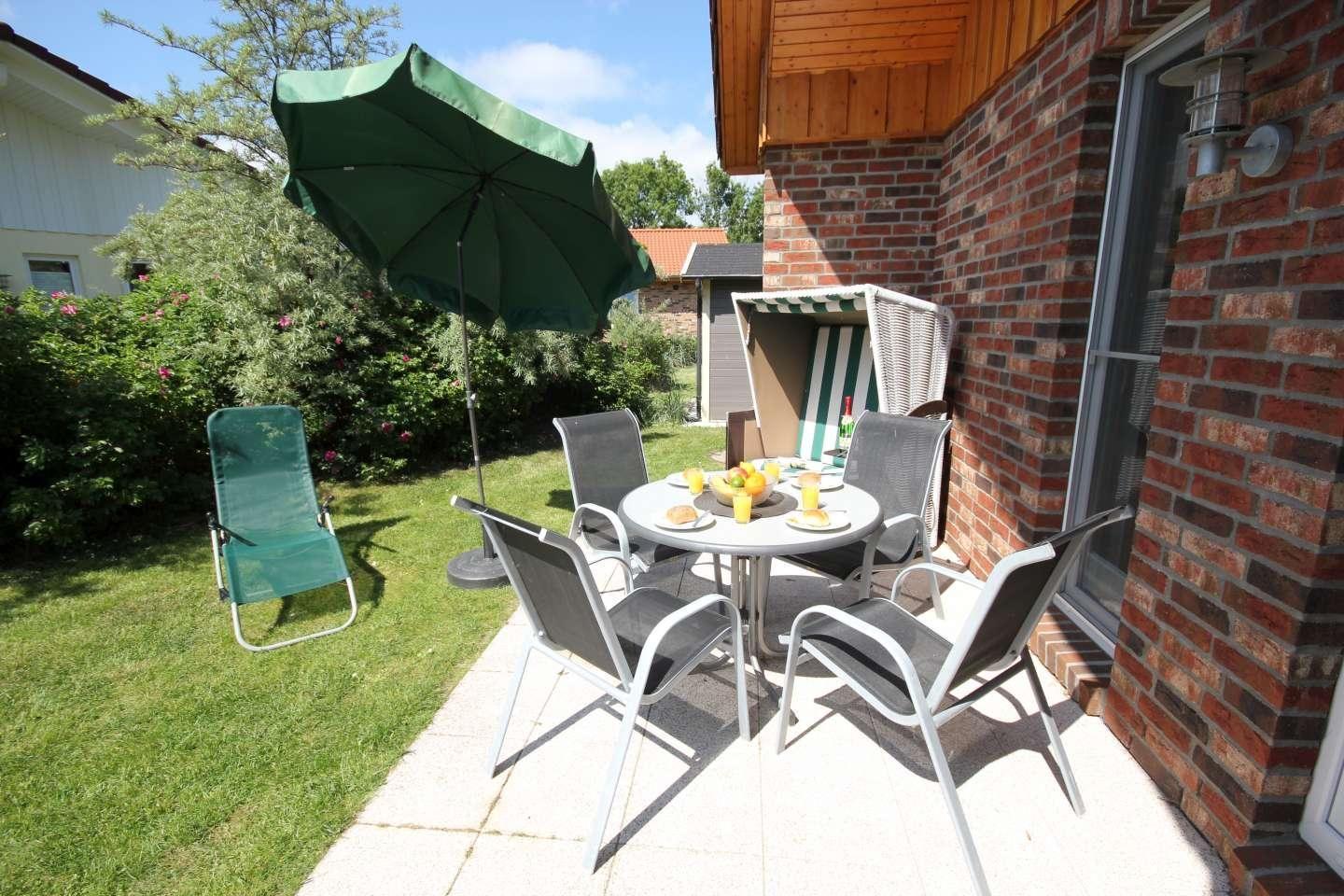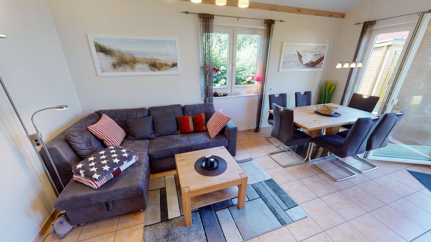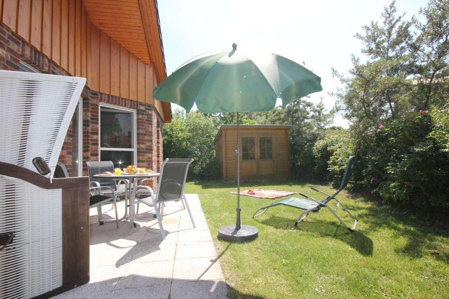 Ein heller, schöner Wohn-/Essbereich mit Kaminofen, zwei Schlafzimmer - eins mit Doppelbett und eins mit zwei komfortablen Einzelbetten - sowie der Garten und die möblierte Terrasse mit Strandkorb und Grill laden zum Urlaub machen ein. In Ihrem Duschbad haben Sie zusätzlich Ihre eigene Sauna. Den Abschluss den Hauses bildet die moderne, gut ausgestattete Küche.