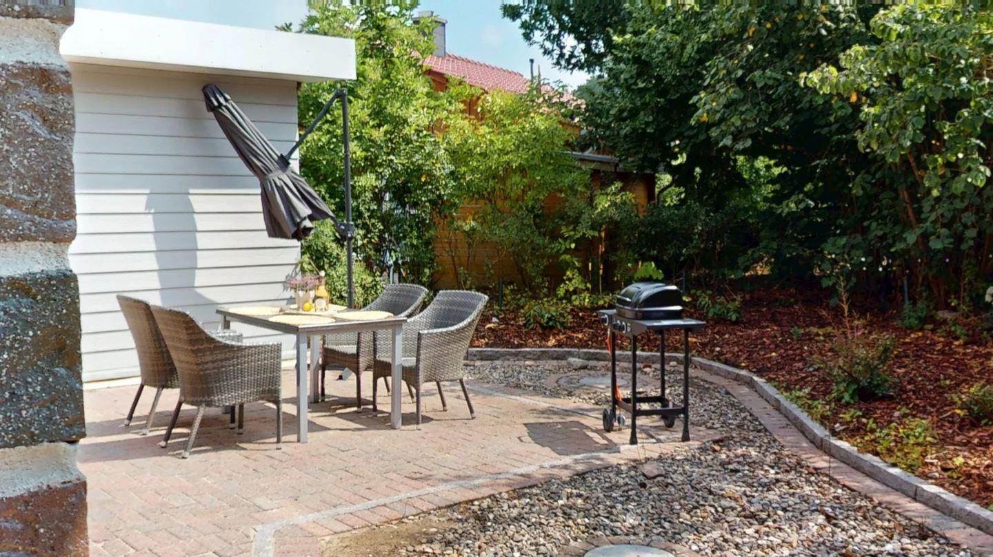 Herzstück des Hauses ist der offene Wohn-Essbereich mit direktem Zugang zur Terrasse mit Grill (Gas) - hier genießen Sie Ihr Frühstück in der Morgensonne, lassen den Tag entspannt mit einem Buch im Grünen ausklingen oder verbringen laue Abende bei einem Glas Wein. Die moderne, voll ausgestattete Küchenzeile lässt keine Wünsche offen – ob Spülmaschine, Herd, Backofen, Kaffeemaschine oder reichlich Stauraum – hier macht das Kochen auch im Urlaub Freude. Der angrenzende Esstisch bietet Platz für gesellige Runden bei gutem Essen und langen Gesprächen.