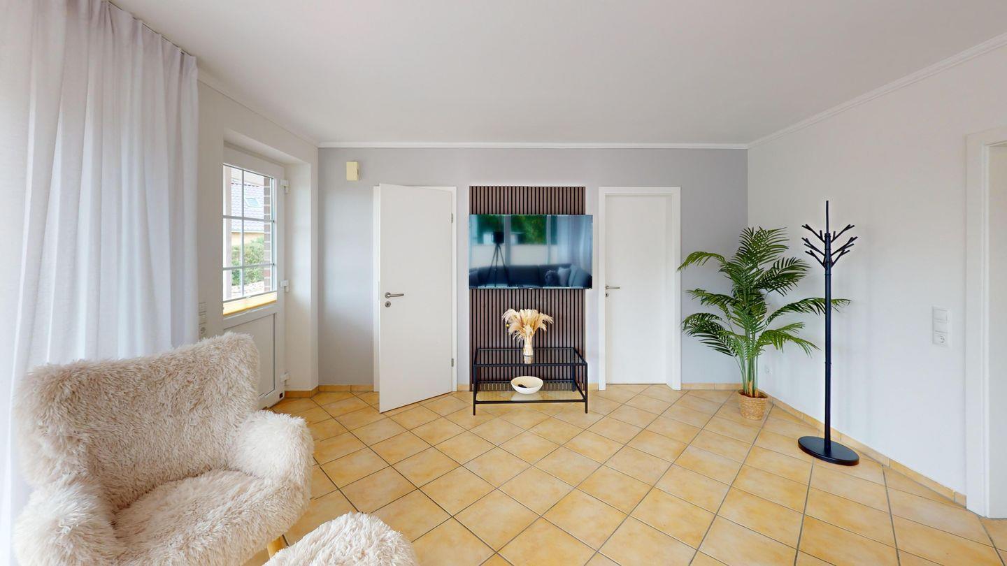 Schon beim Betreten des Hauses eröffnet sich Ihnen ein lichtdurchfluteter Wohnbereich mit stilvoller Sofaecke, bequemen Sesseln, einem Couchtisch und einem großen Flatscreen-TV – der ideale Ort für entspannte Abende mit einem Glas Wein oder spannenden Filmabenden.