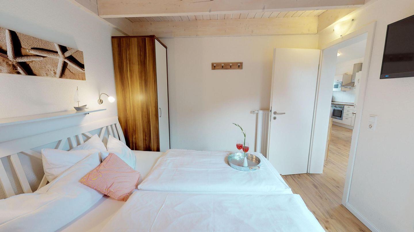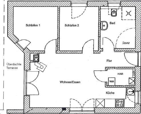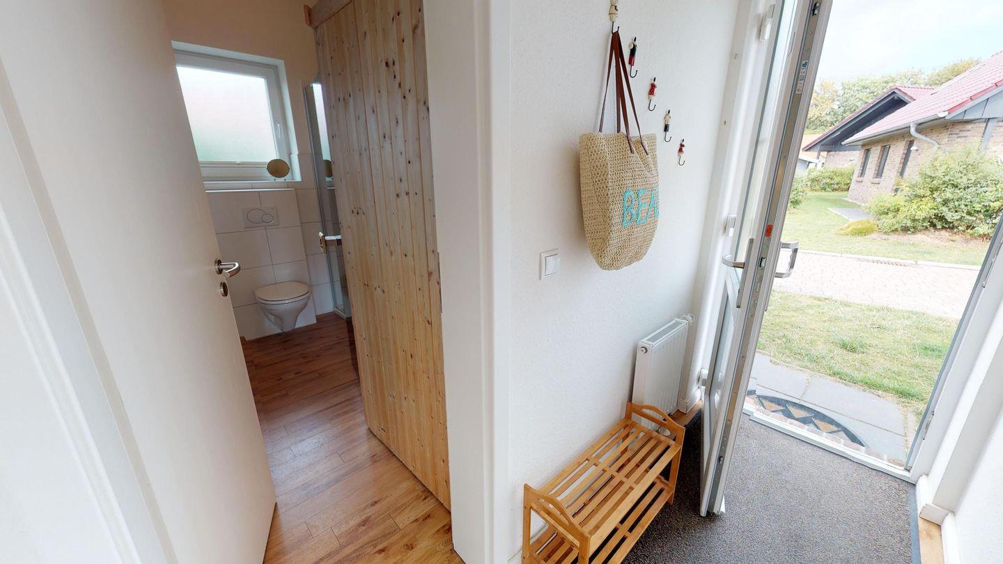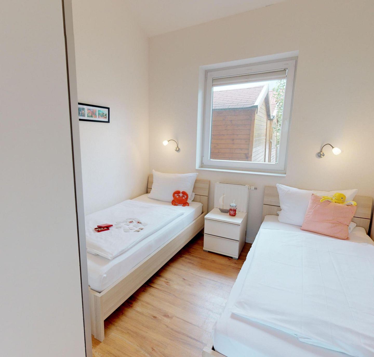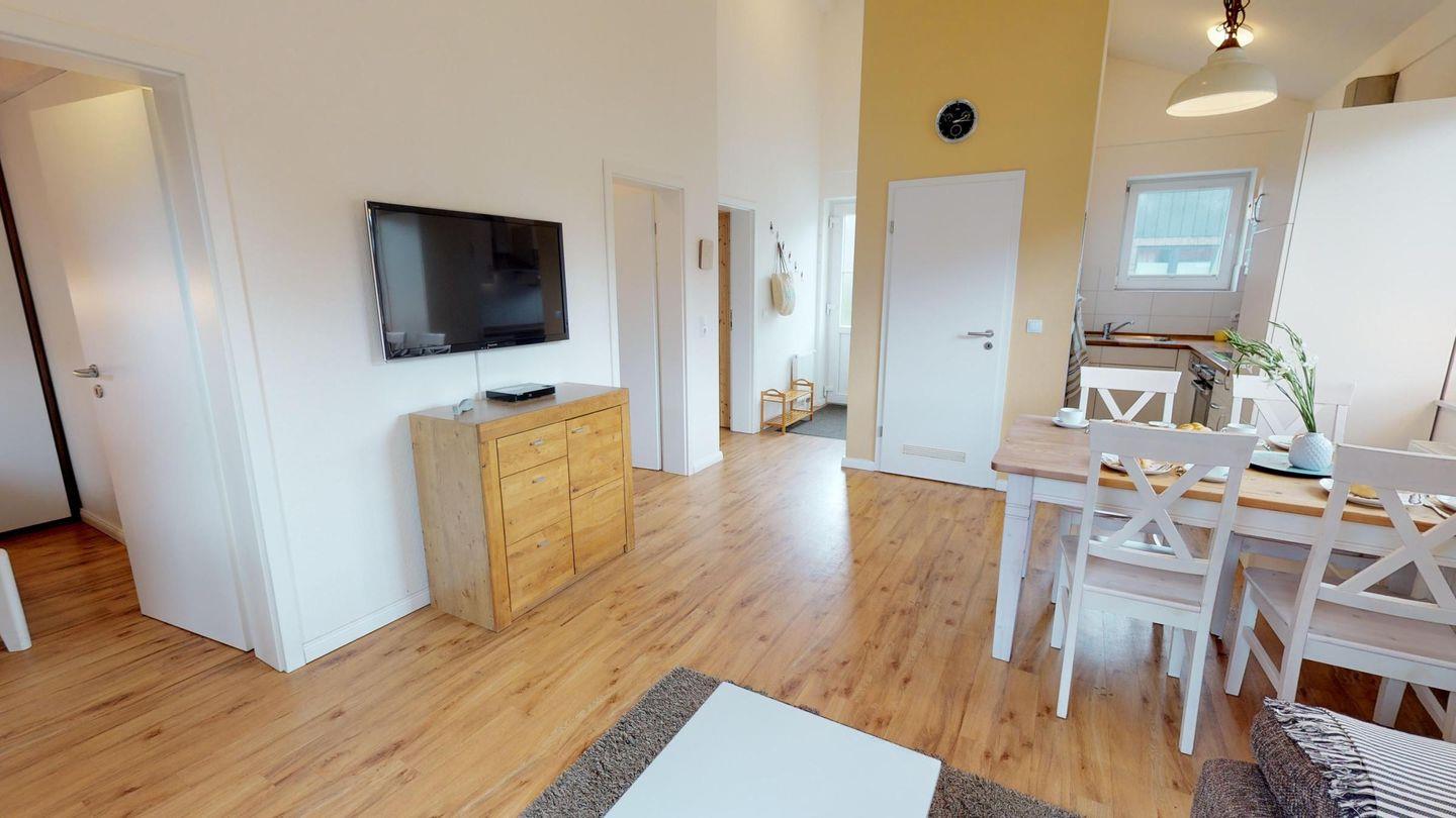 Das Haus bietet einen hellen Wohn-/ Essbereich mit einem Kaminofen für gemütliche Stunden. Daran angrenzend liegt die moderne, gut ausgestattete Küche. Ein Schlafzimmer verfügt über ein Doppelbett, das andere über zwei gemütliche Einzelbetten. Eine weitere Schlafmöglichkeit für zwei Personen bietet die gemütliche Couch im Wohnzimmer (140 x200 cm). Den Abschluss bildet das Duschbad mit WC, Fußbodenheizung und eigener Sauna.