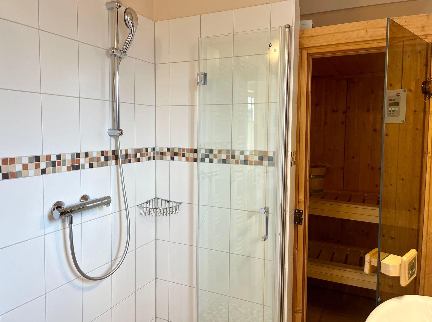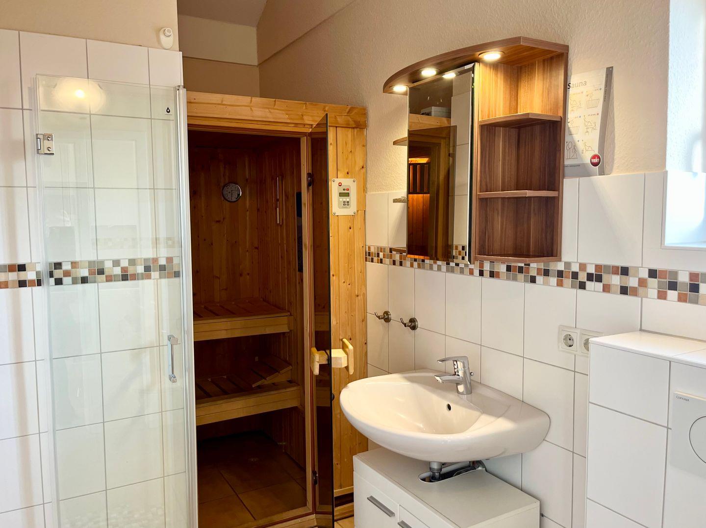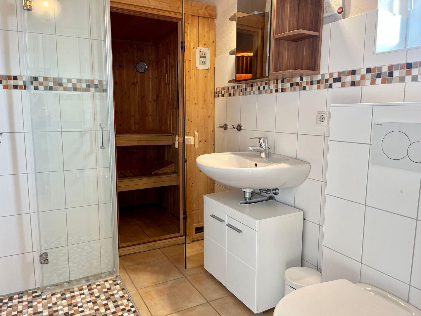 Eins der Schlafzimmer verfügt über ein Doppelbett, das zweite über zwei Einzelbetten. Eine weitere Schlafmöglichkeit bietet das gemütliche Schlafsofa im Wohnzimmer für zwei Personen. Im hellen Duschbad befindet sich eine Sauna.