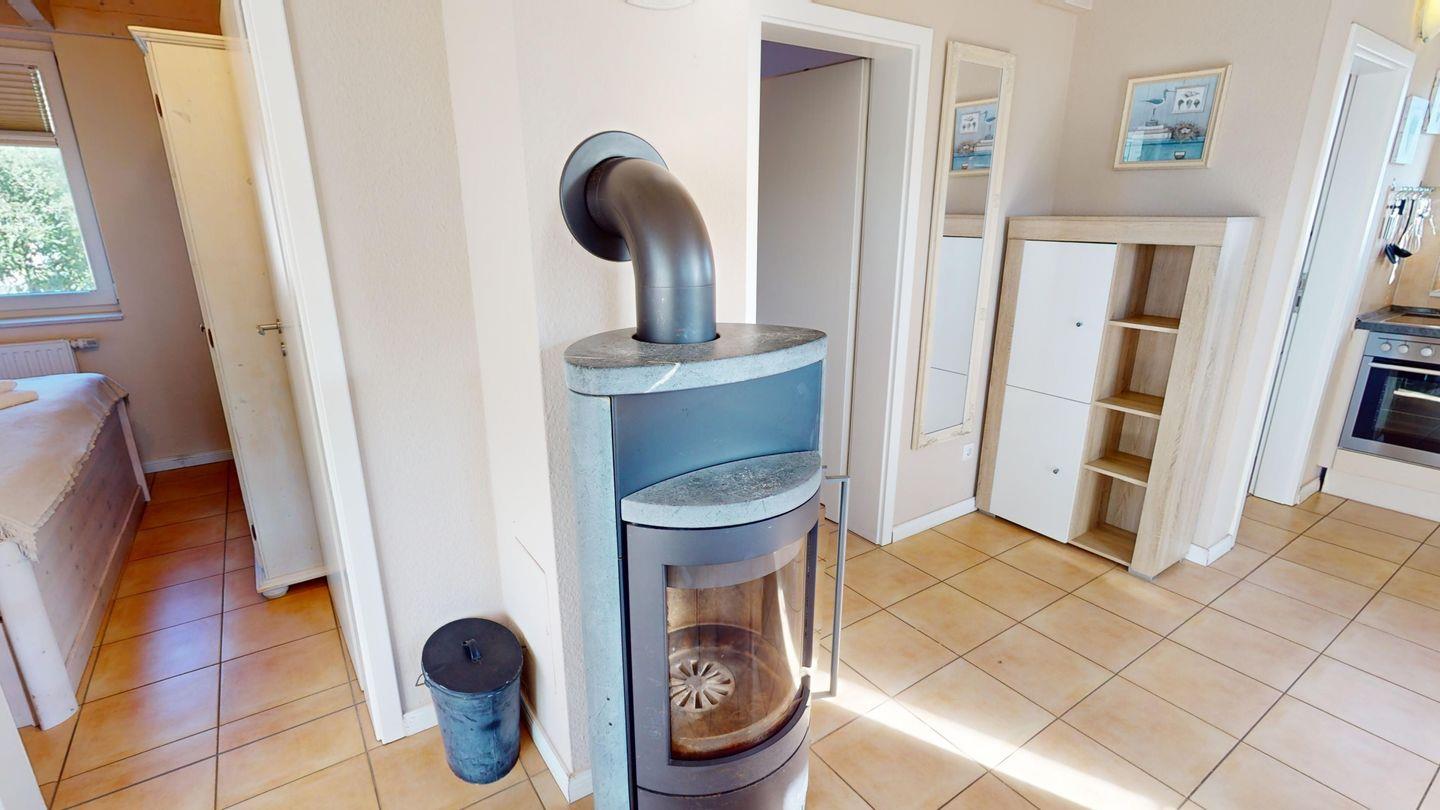 Das Haus bietet ein gemütliches Wohnzimmer mit Kaminofen sowie einen angrenzenden Essbereich im hellen Wintergarten und eine kleine, gut ausgestattete Küche. Vom Wohnbereich aus gelangen Sie auf die möblierte Terrasse mit Grill und Strandkorb - ein schönes Plätzchen für Stunden an der frischen Luft. Das gesamte Grundstück ist eingezäunt.