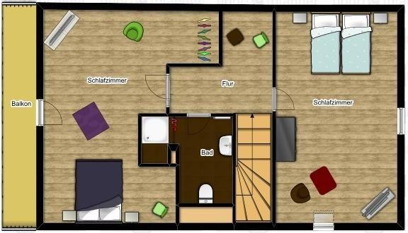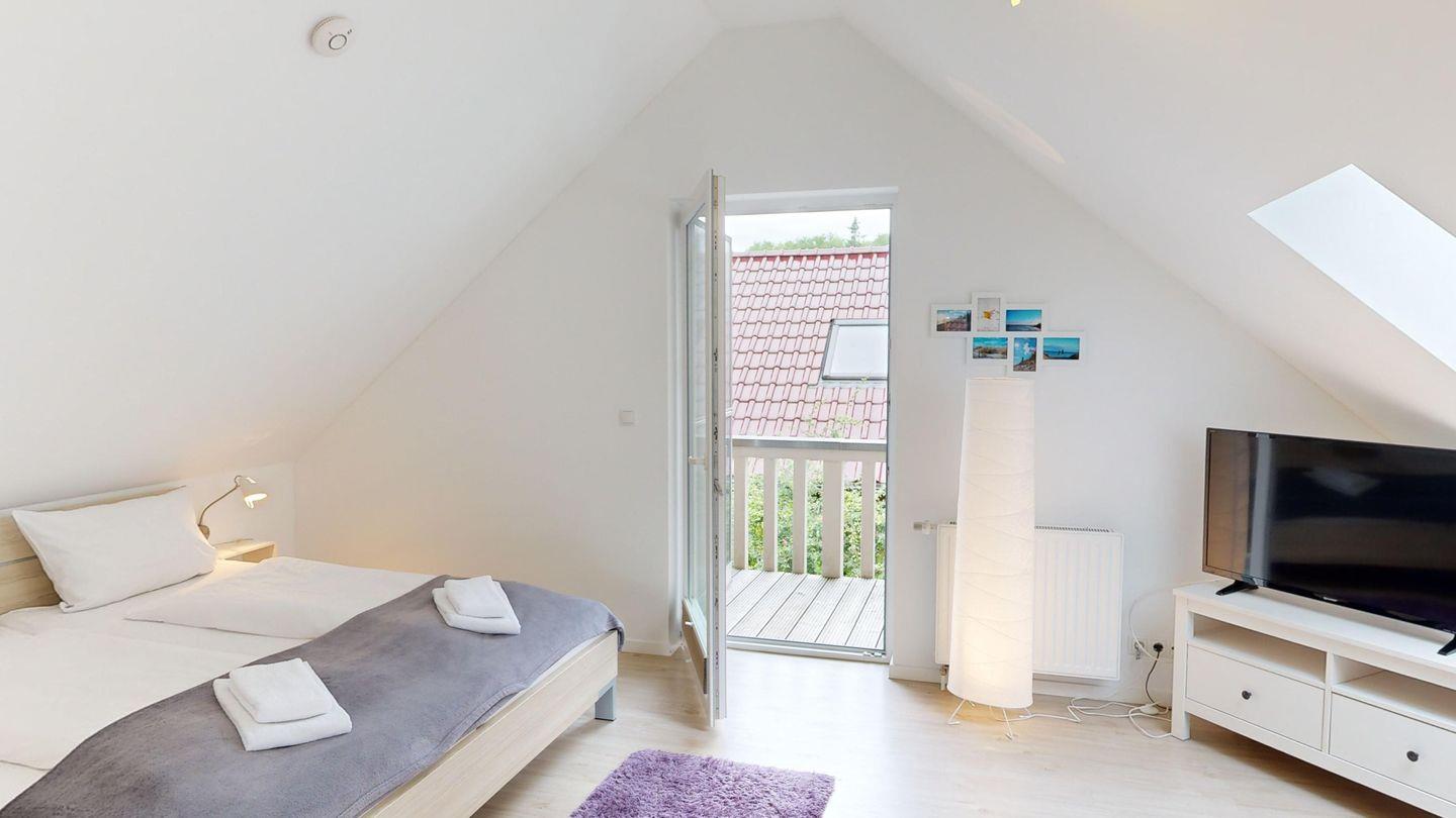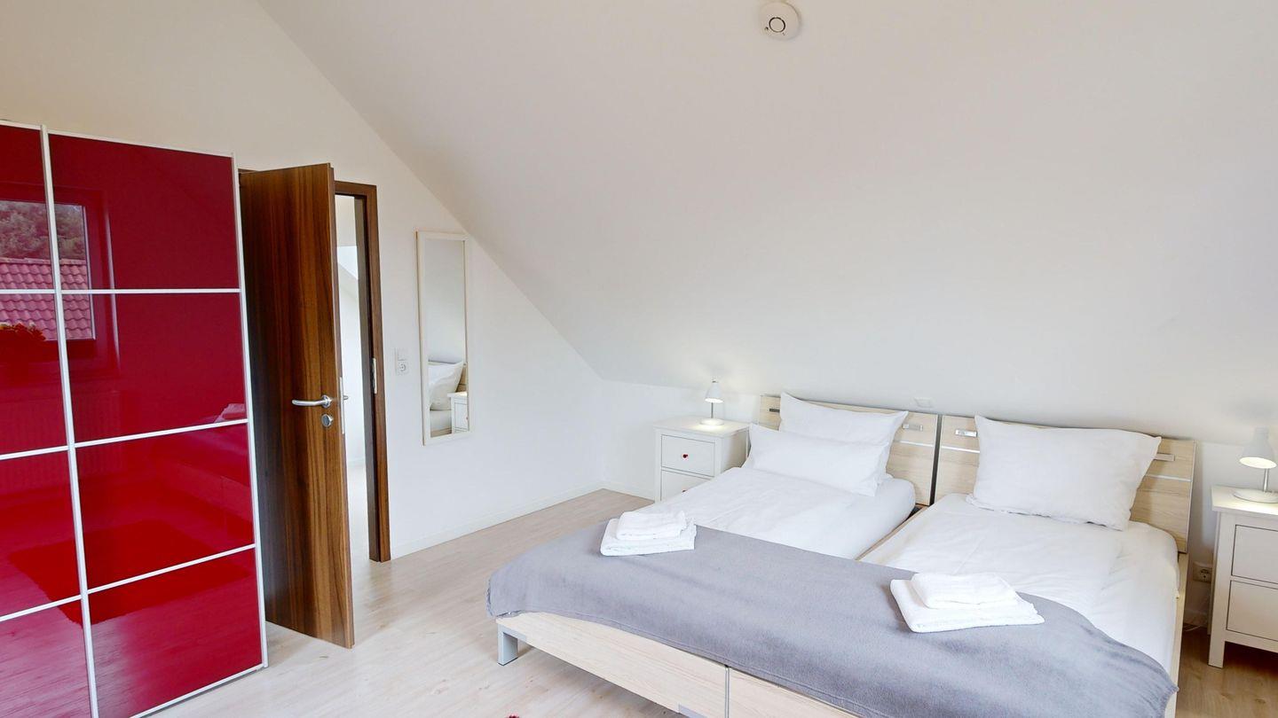 Im Erdgeschoss befindet sich ein großzügiger Wohn-/Essbereich mit einem Kaminofen sowie einer modernen, voll ausgestatteten Küche. Zusätzlich verfügt das Erdgeschoss über zwei Schlafzimmer mit je einem Doppelbett (1x barrierefrei), ein Gäste-WC und ein barrierefreies Badezimmer mit Dusche, WC und Sauna. Im Obergeschoss finden Sie ein weiteres Badezimmer sowie zwei weitere Schlafzimmer, beide mit Doppelbett - eines davon mit Balkon.