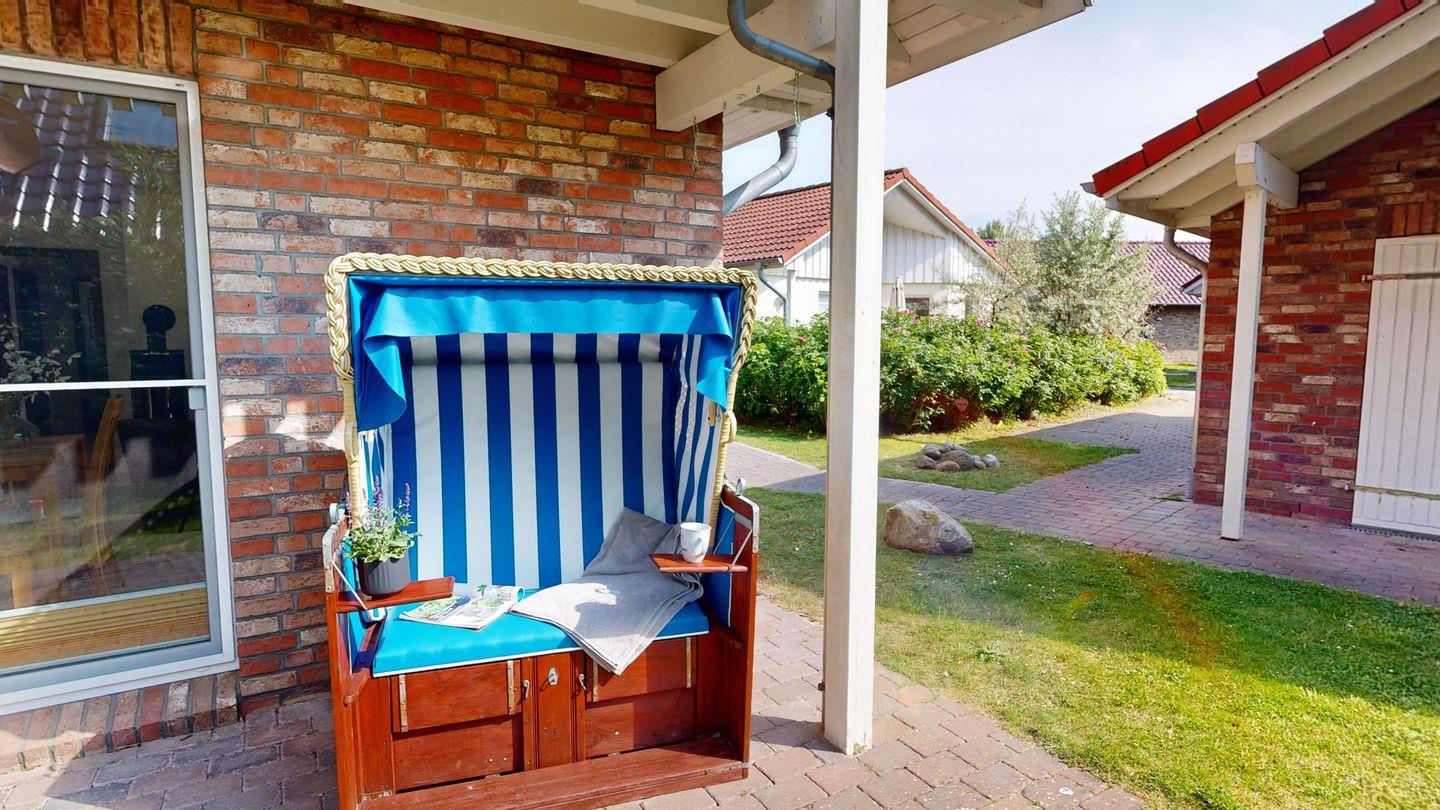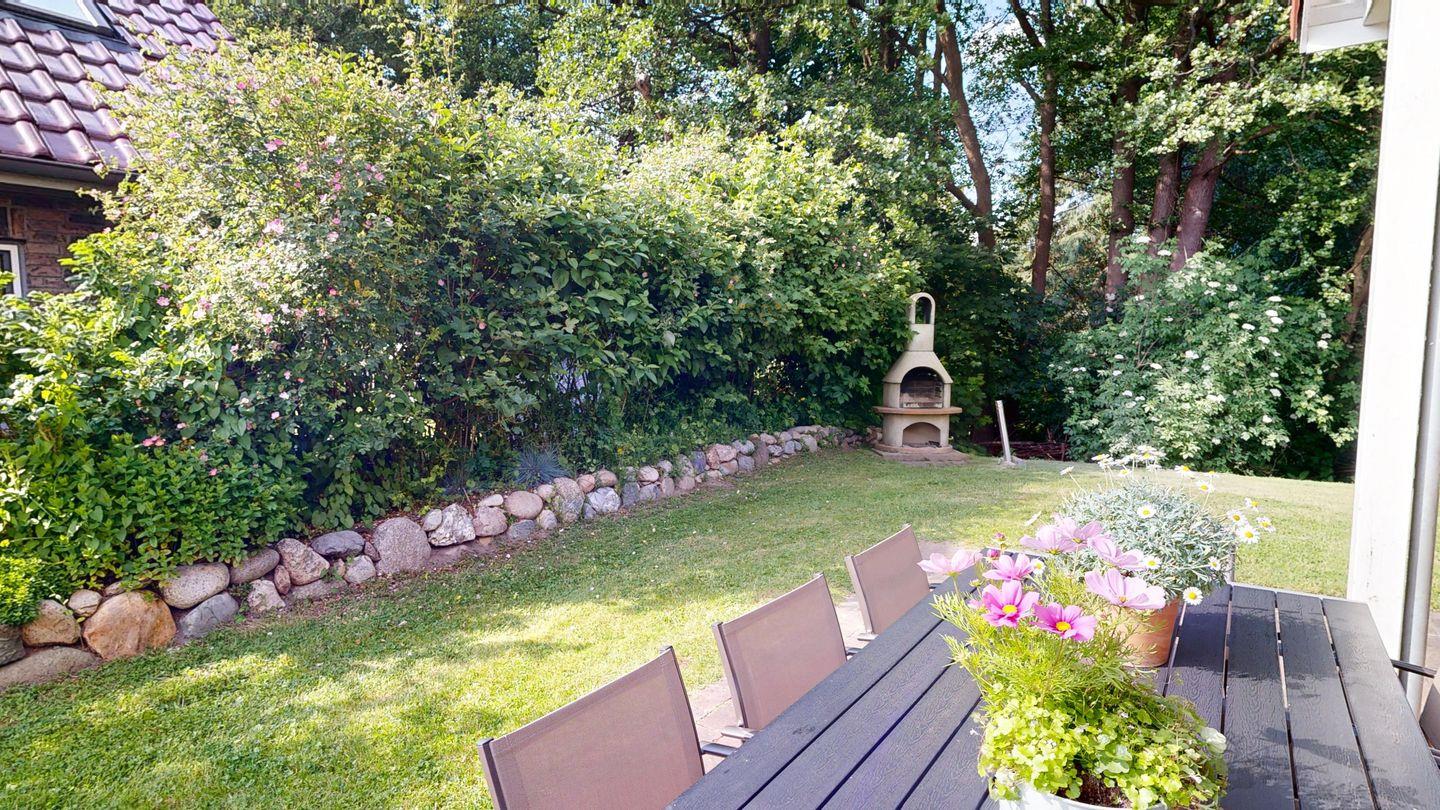 Das Haus wird durch den großen Garten direkt am Naturschutzgebiet harmonisch ergänzt. Der Garten bietet eine möblierte, teilweise überdachte Terrasse, einen Strandkorb und einen Holzkohlegrill. Ihre mitgebrachten Fahrräder und Wassersportgeräte können in der Garage untergebracht werden.