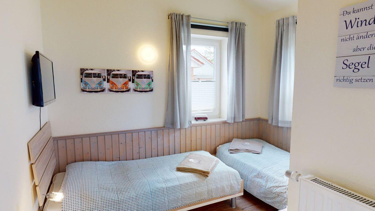 Ein Schlafzimmer verfügt über ein Doppelbett, das andere über zwei komfortable Einzelbetten. Es gibt ein helles Badezimmer mit WC und bodengleicher Dusche.