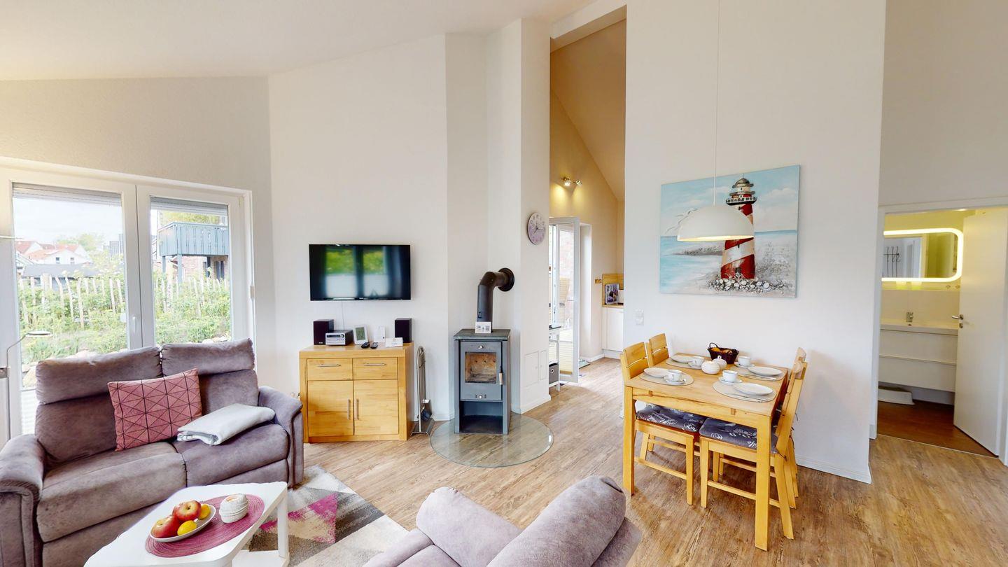 Das Haus bietet Ihnen einen gemütlichen Wohnbereich mit Kaminofen sowie einen offenen Essbereich, der direkt an die voll ausgestattete Küche angrenzt. Von hier aus gelangen Sie auf die möblierte Terrasse mit Strandkorb und Grill sowie einen eingezäunten Garten. Im Gartenhaus können Sie Ihre mitgebrachten Fahrräder unterstellen.