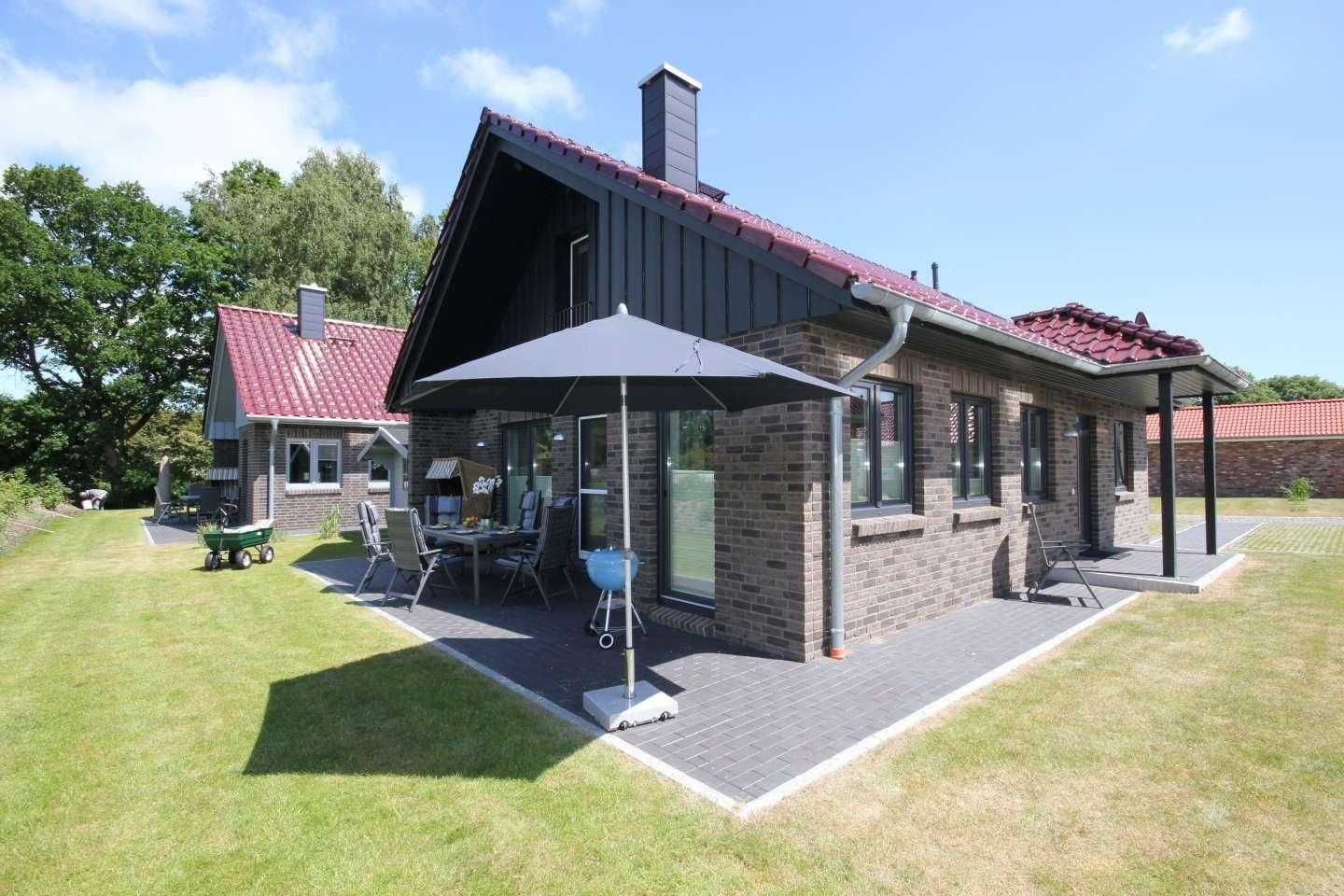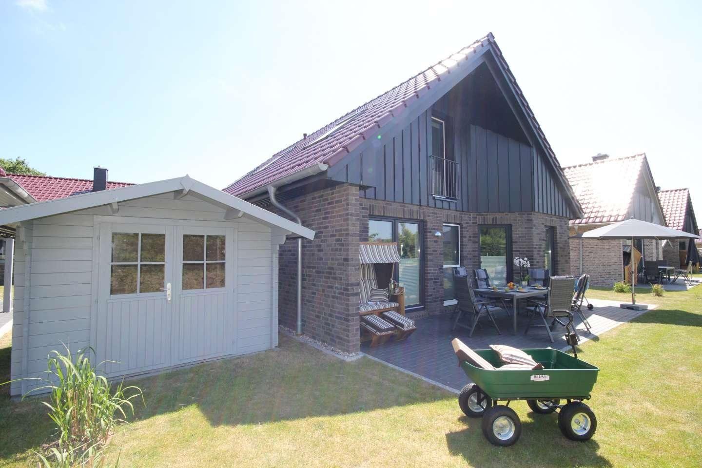 Der große Garten mit der möblierten Terrasse, dem Strandkorb (zwischen April und Oktober) und dem Grill lädt Sie ein, sonnige Stunden im Freien zu verbringen. Außerdem steht ein Gartenhaus zur Mitbenutzung für Ihre mitgebrachten Fahrräder bereit.