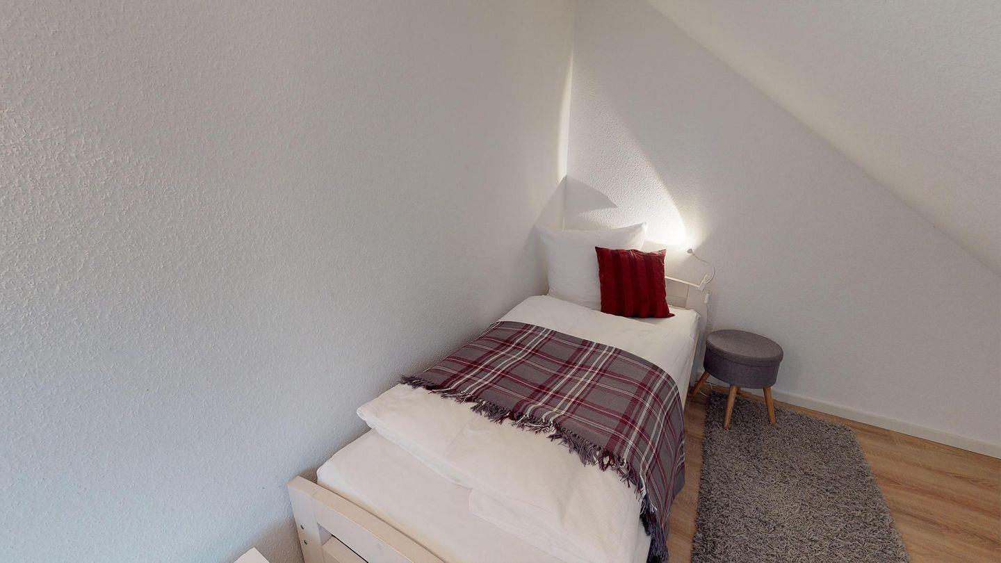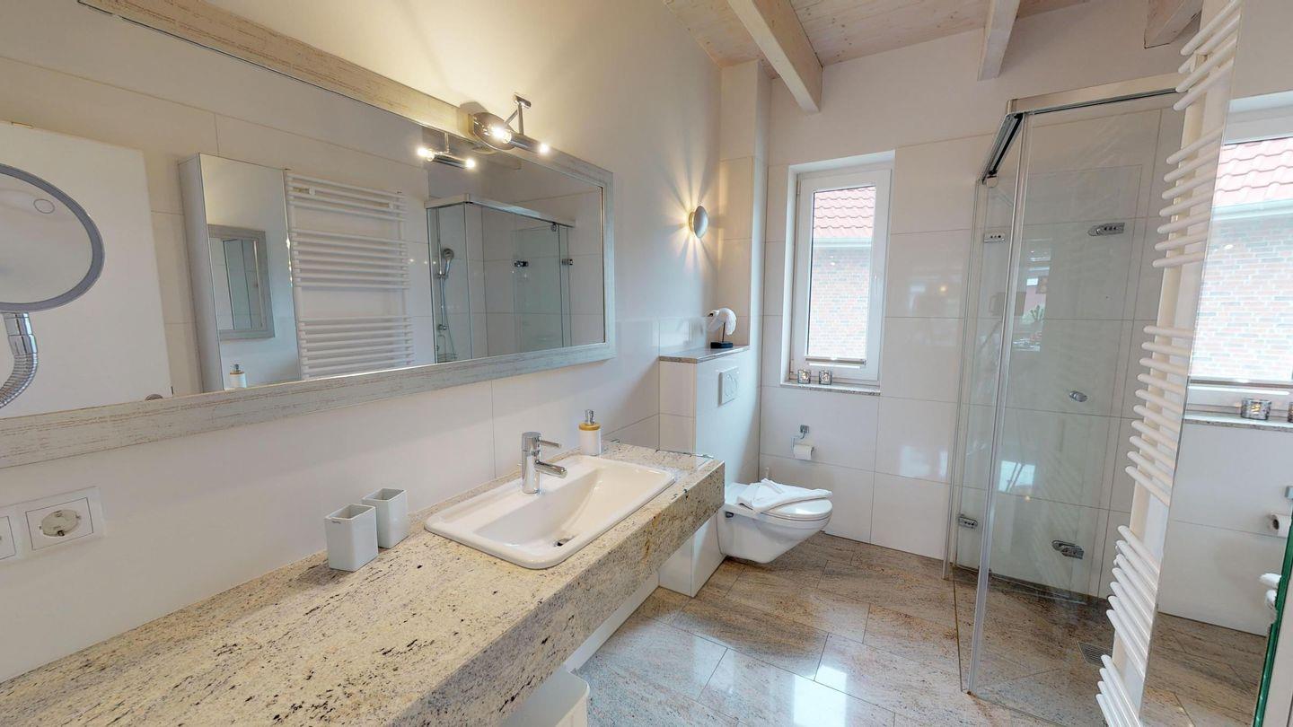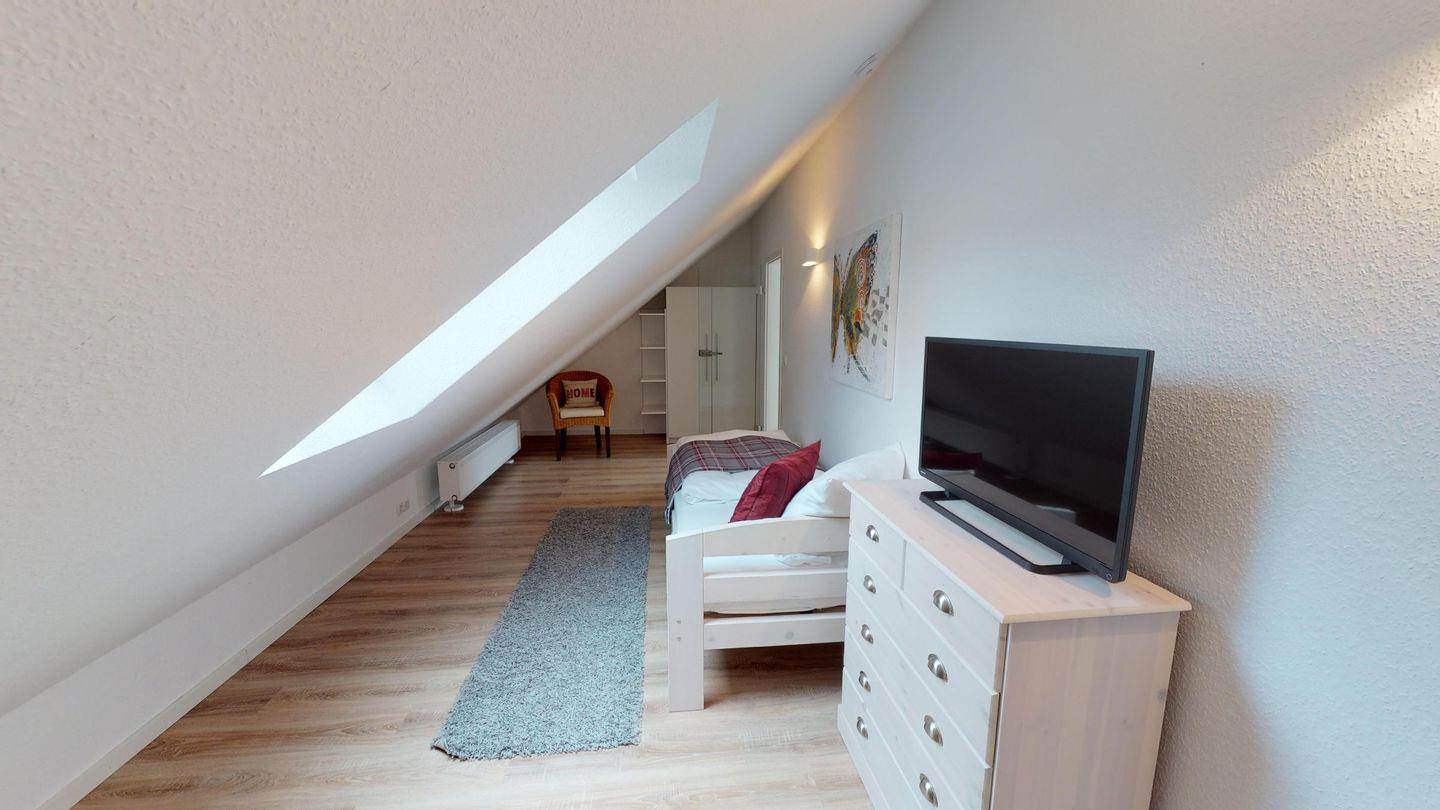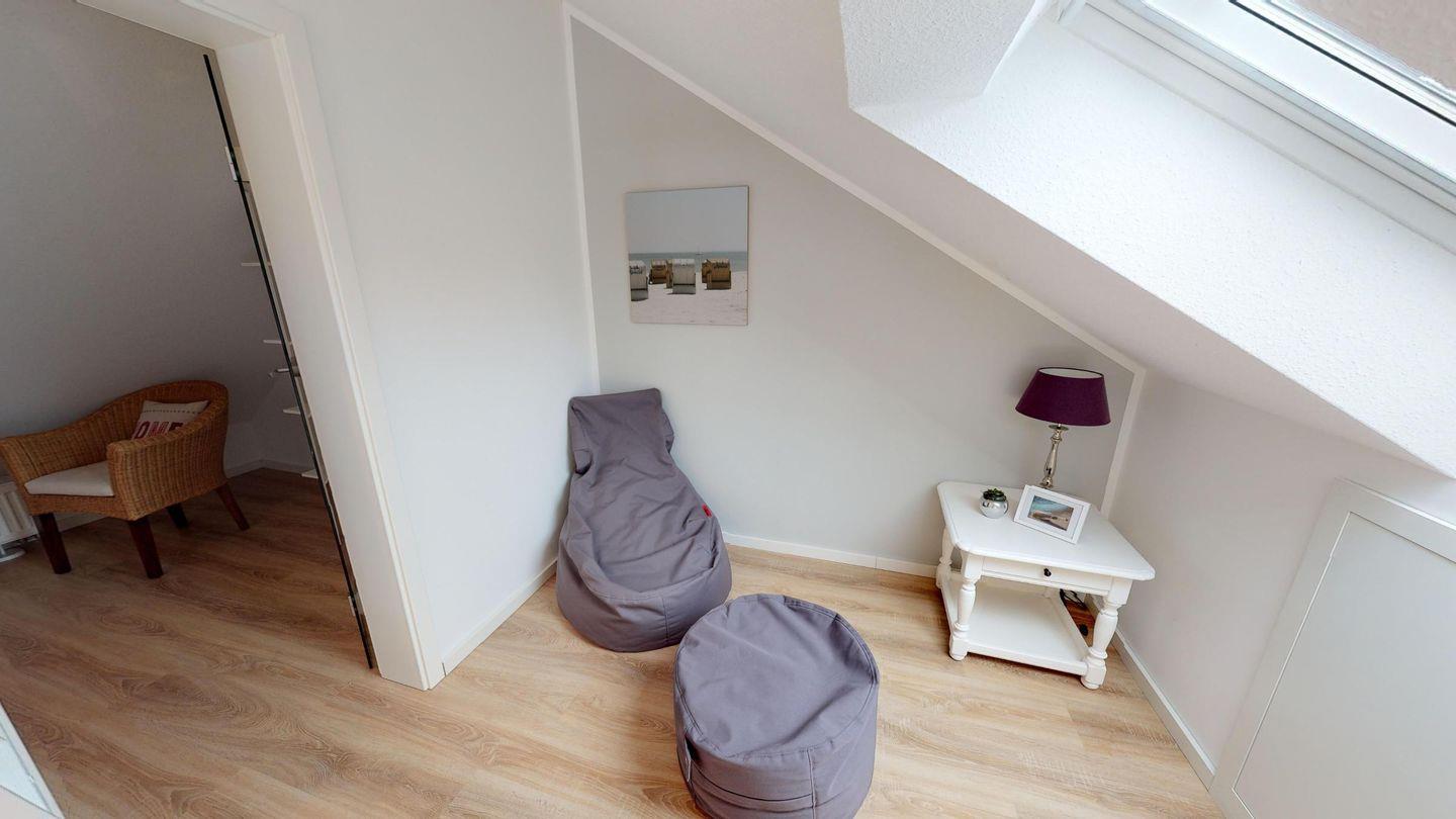 Das Erdgeschoss teilt sich in den Ess- und Wohnbereich mit Einbauküche, Esstisch, Sofa, TV und Kaminofen auf. Daran grenzen zwei Schlafzimmer (einmal mit Doppelbett, einmal mit zwei Einzelbetten) und ein Duschbad. Ein Gäste-WC ist ebenfalls vorhanden. Auf der Empore des Dachgeschosses finden Sie vor dem Kinderzimmer mit zwei Einzelbetten, Babybett und TV eine kleine, gemütliche Leseecke.