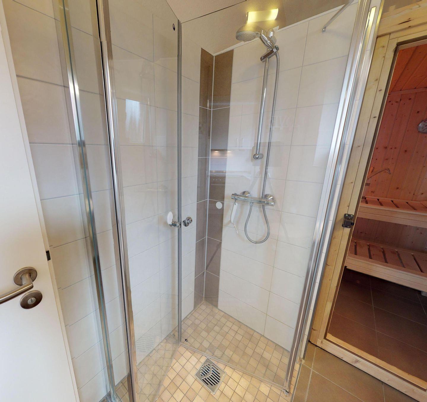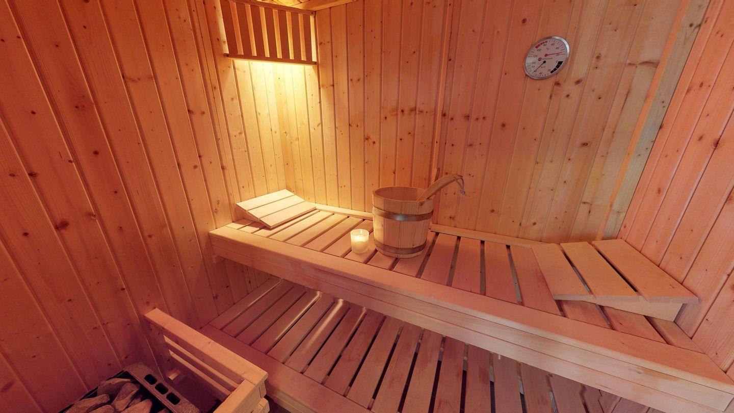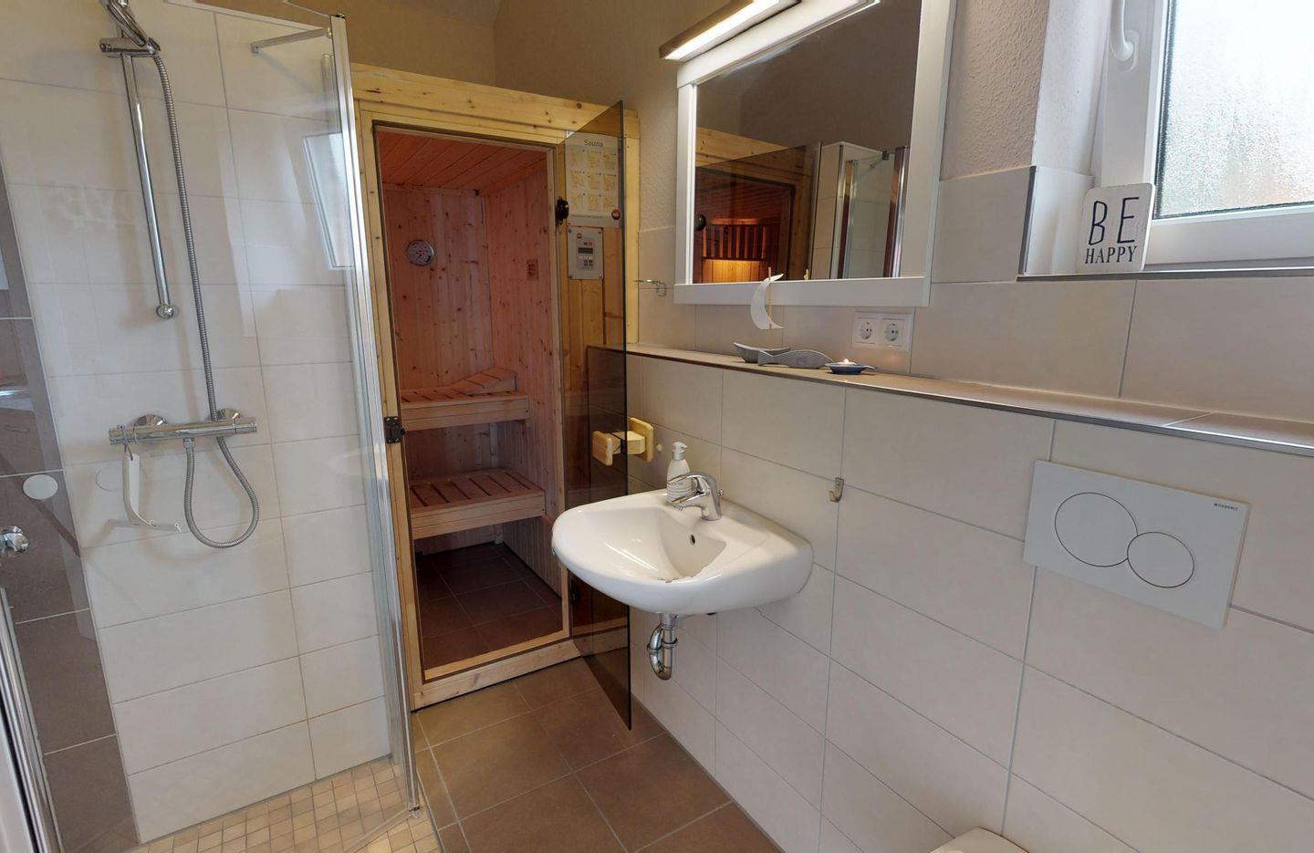 Es gibt eine offene, gut ausgestattete Küche mit angrenzender Essecke sowie einen gemütlichen Wohnbereich mit Kamin. Im Badezimmer mit Dusche ist die eigene Sauna ein Highlight. Zwei Schlafzimmer, eines mit einem Doppelbett (Größe 1,60/2,00 m) und das zweite mit zwei Einzelbetten sowie die gemütliche Schlafcouch im Wohnzimmer, die zusätzlich zwei Schlafplätze für Kinder bietet, runden das Gesamtbild ab.