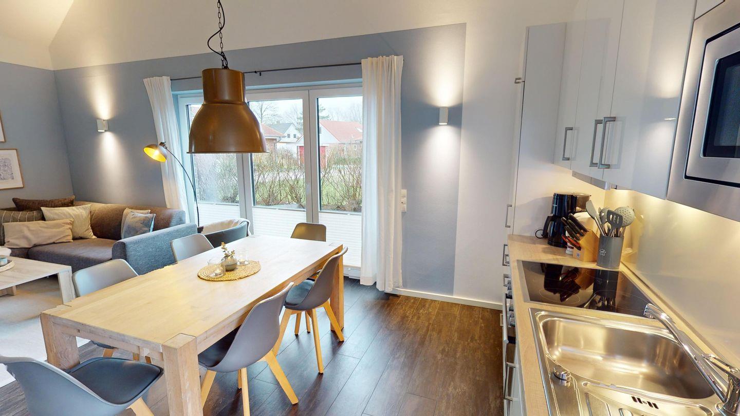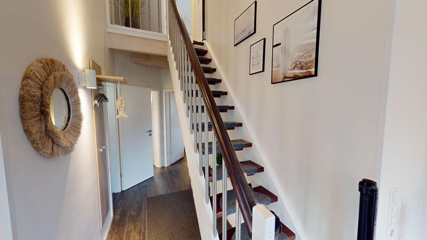 Im Erdgeschoss erwartet Sie ein lichtdurchfluteter Wohn- und Essbereich mit gemütlichem Kaminofen – der perfekte Ort für entspannte Abende. Die moderne, offene Küche lädt zum gemeinsamen Kochen ein. Zwei Schlafzimmer mit Doppelbetten befinden sich im ruhigen hinteren Teil des Hauses – ebenso wie das stilvolle Duschbad mit integrierter Sauna und ein zusätzliches Gäste-WC.