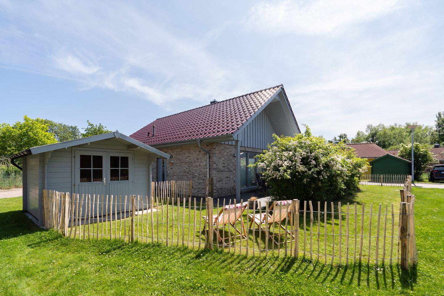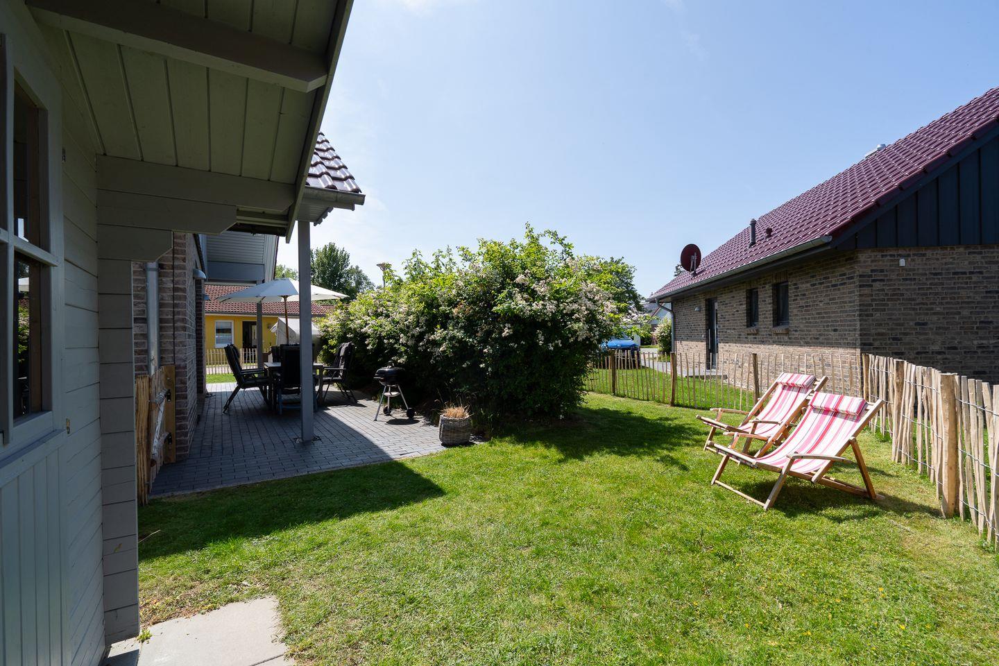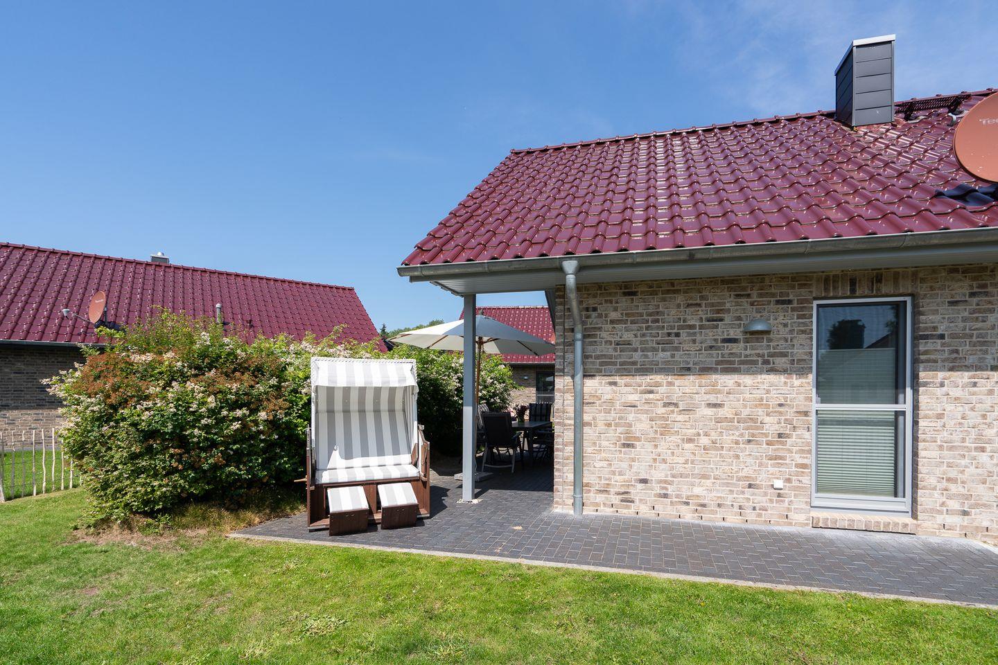 Das eingezäunte Grundstück bietet viel Platz zum Spielen, Toben und Entspannen. Auf der möblierten Terrasse mit Grill und Strandkorb (zwischen ca. April und Oktober) können Sie sonnige Stunden genießen oder den Abend stimmungsvoll ausklingen lassen. Ein praktischer Schuppen bietet Stauraum für Fahrräder oder Strandzubehör.