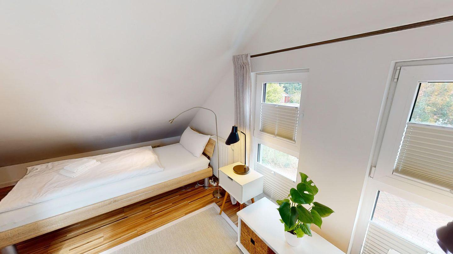 Im Erdgeschoss befindet sich das Wohnzimmer mit Kaminofen, Esszimmer und offener, voll ausgestatteter Einbauküche. Im hinteren Bereich liegen zwei Schlafzimmer mit jeweils einem Doppelbett. Abgerundet wird das Erdgeschoss durch das Duschbad mit Sauna sowie ein Gäste-WC. In der zweiten Etage steht ein großzügiger Raum mit zwei Einzelbetten zur Verfügung.