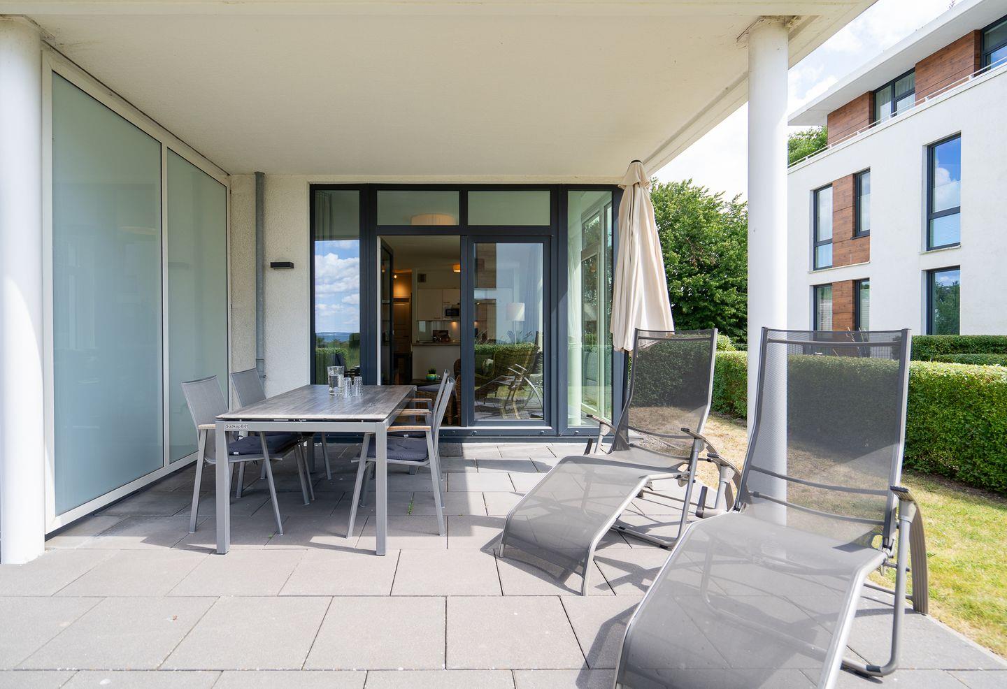 Die herrliche, möblierte Süd-Terrasse verspricht viel Licht und Sonne, ideal für gemütliche Stunden im Freien. Der Strand ist nur wenige Meter entfernt.