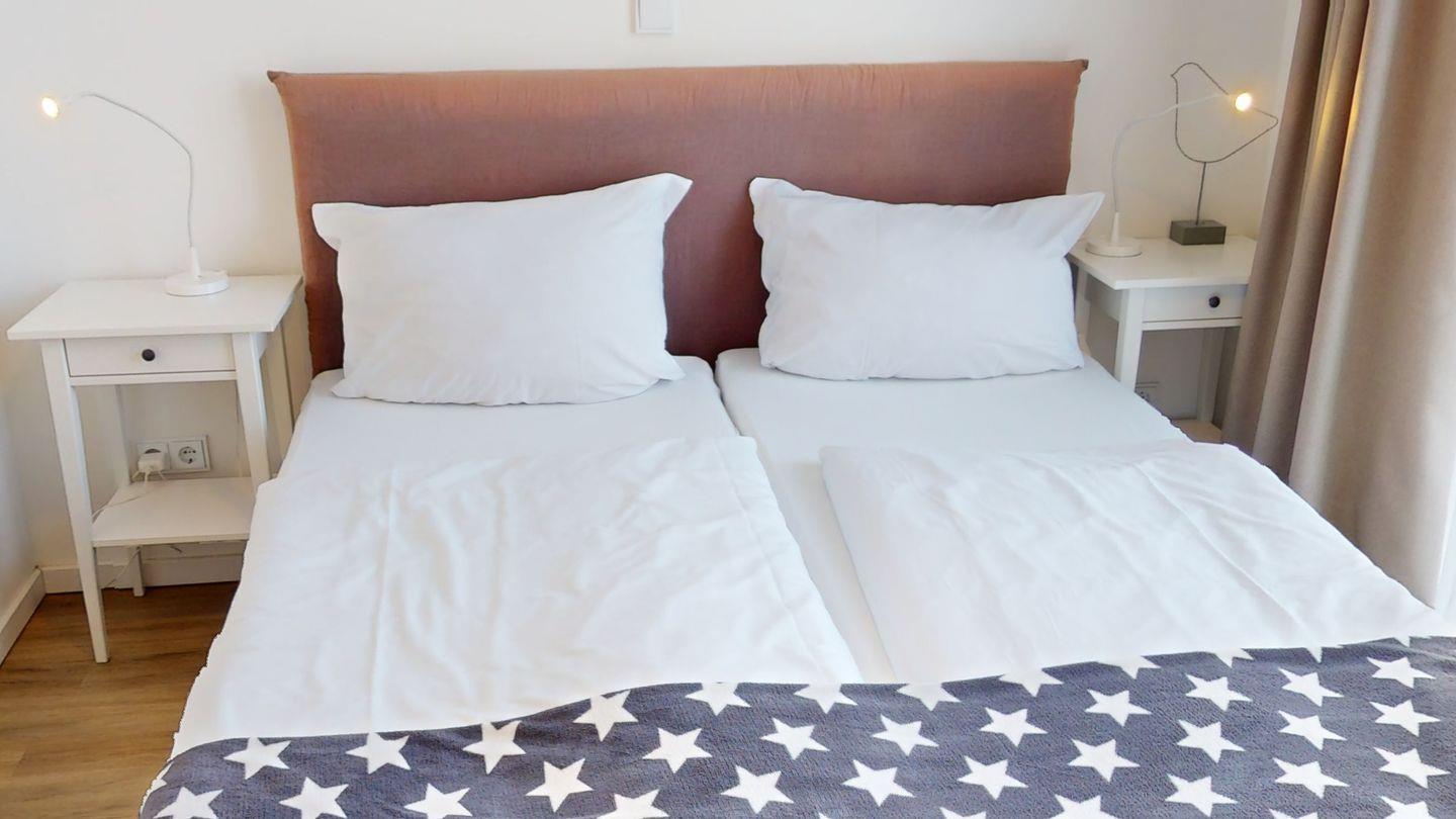 Die 77 m² Wohnfläche sind aufgeteilt in ein helles Wohnzimmer mit einer voll ausgestatteten Küchenzeile und zwei Schlafzimmern, jeweils mit einem Boxspring-Doppelbett. Die zwei Badezimmer bieten großen Komfort, eines mit einer Badewanne und das andere mit einer Dusche.