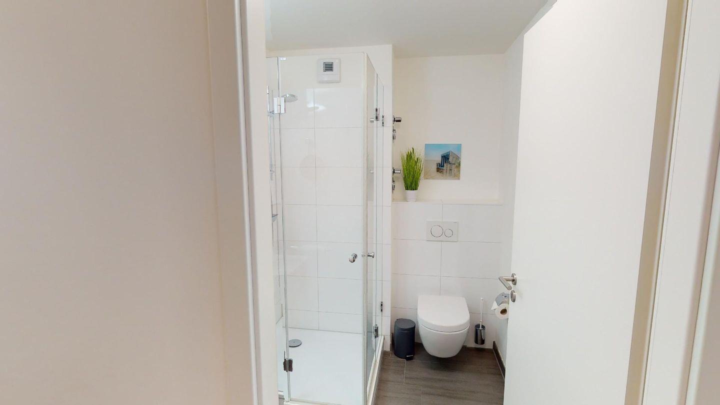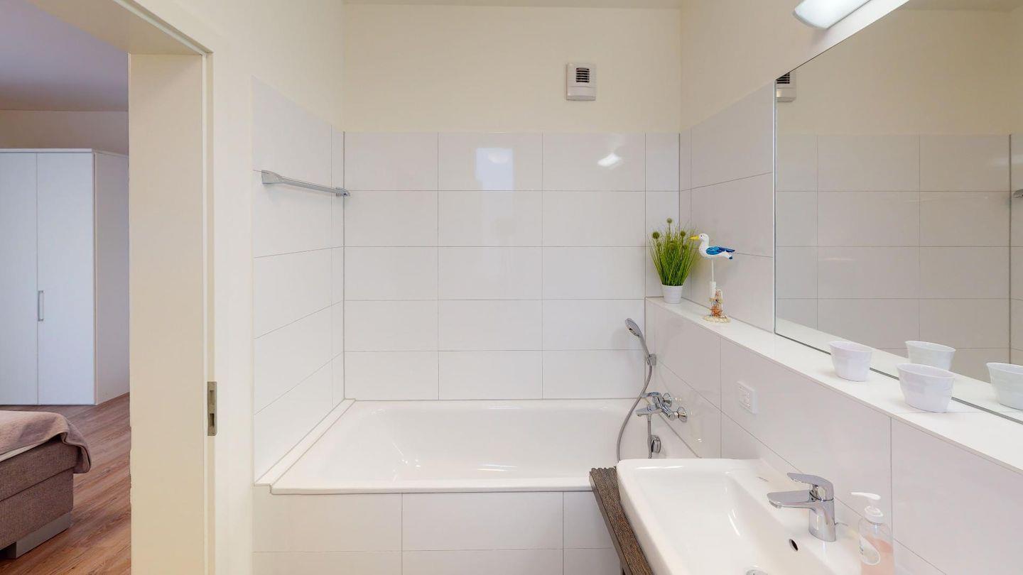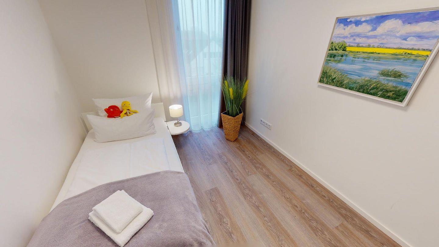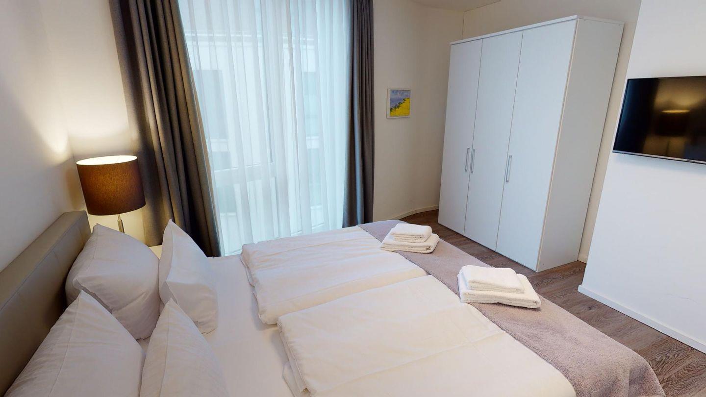 Durch die zwei Schlafzimmer können bis zu vier Personen hier einen entspannten Urlaub verbringen. Eines der Schlafzimmer ist mit einem komfortablen Boxspringbett-Doppelbett, einem großen Kleiderschrank und einem Flat-TV eingerichtet und hat ein eigenes Bad mit Badewanne. Das zweite Schlafzimmer verfügt über ein Einzelbett mit ausziehbarem "Kojenbett" sowie einem großen Kleiderschrank. Ein zusätzliches Duschbad bietet großen Komfort.