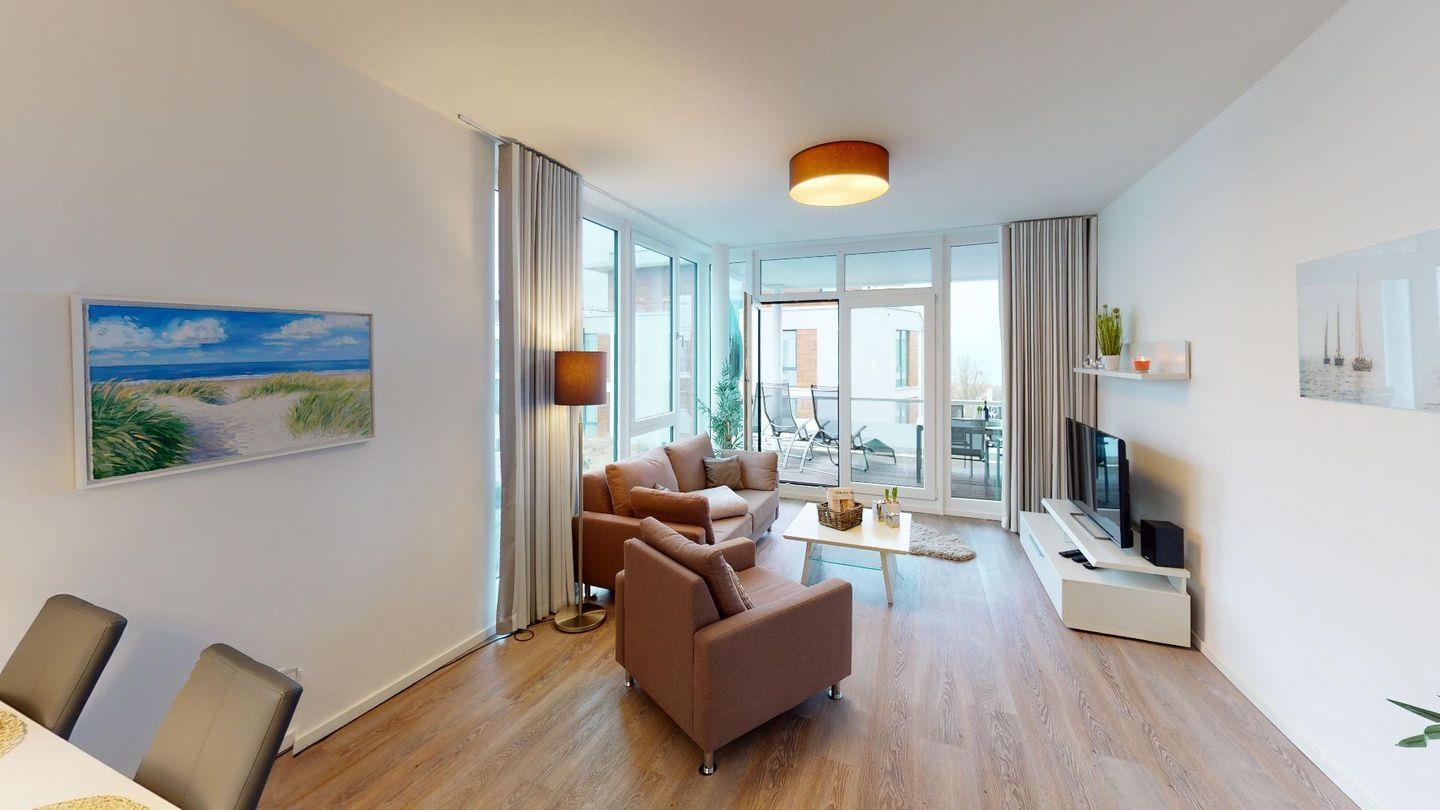 Modernes 3-Zimmer-Ferienapartment für 4 Personen und Hund mit Balkon, 2 SZ und Meerblick in Pelzerhaken an der Ostsee - Strandnah