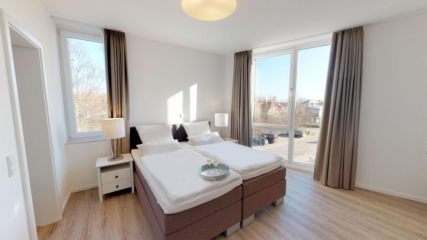 Dieses 85 m² große 3-Zimmer-Apartment befindet sich im 2. OG des Hauses C. Es ist für eine Belegung mit 4 Personen ausgelegt, und auch ein Hund ist hier willkommen.