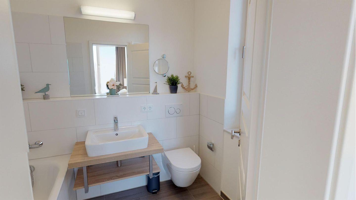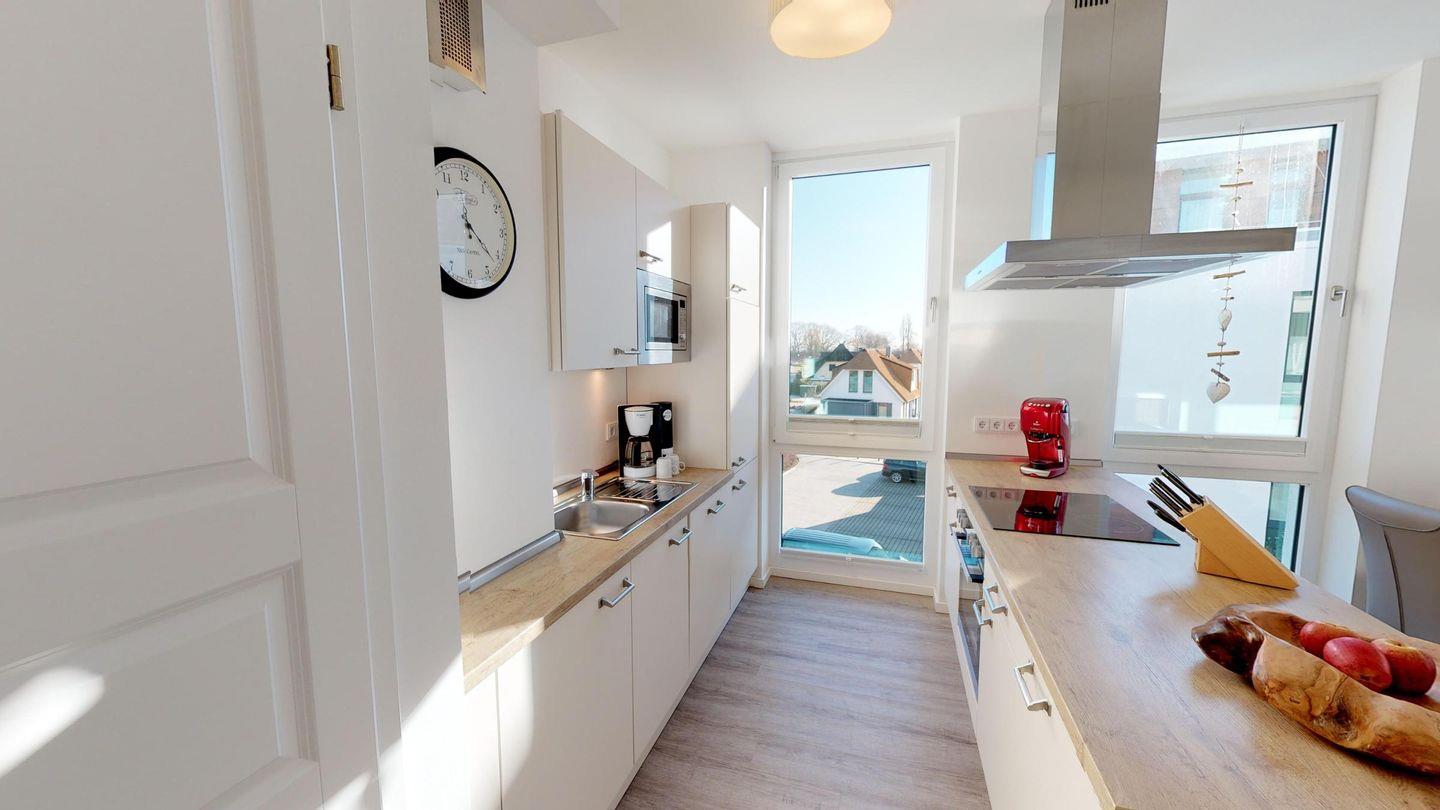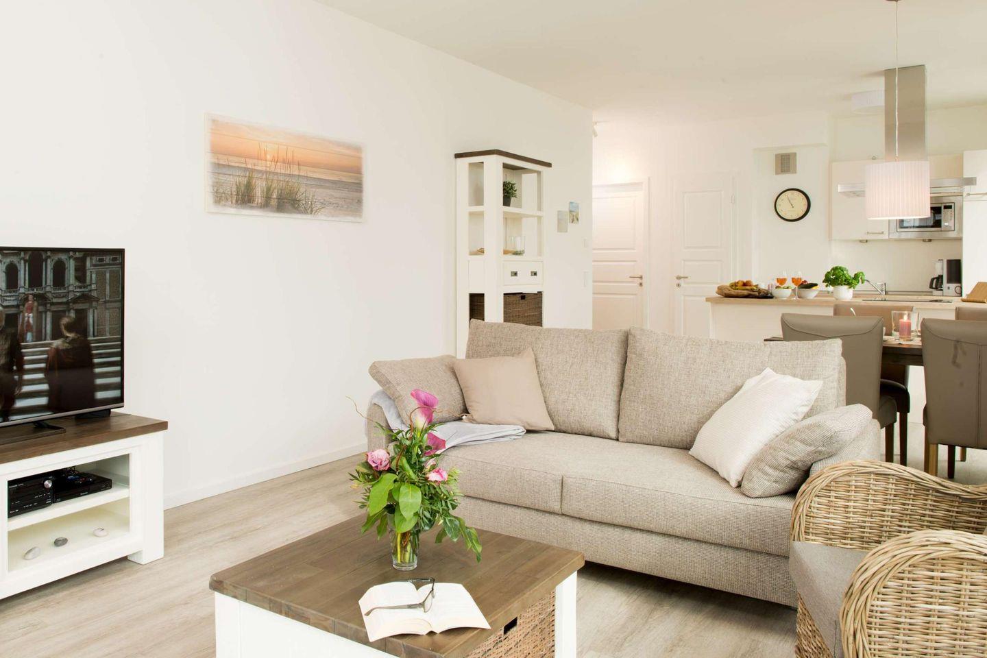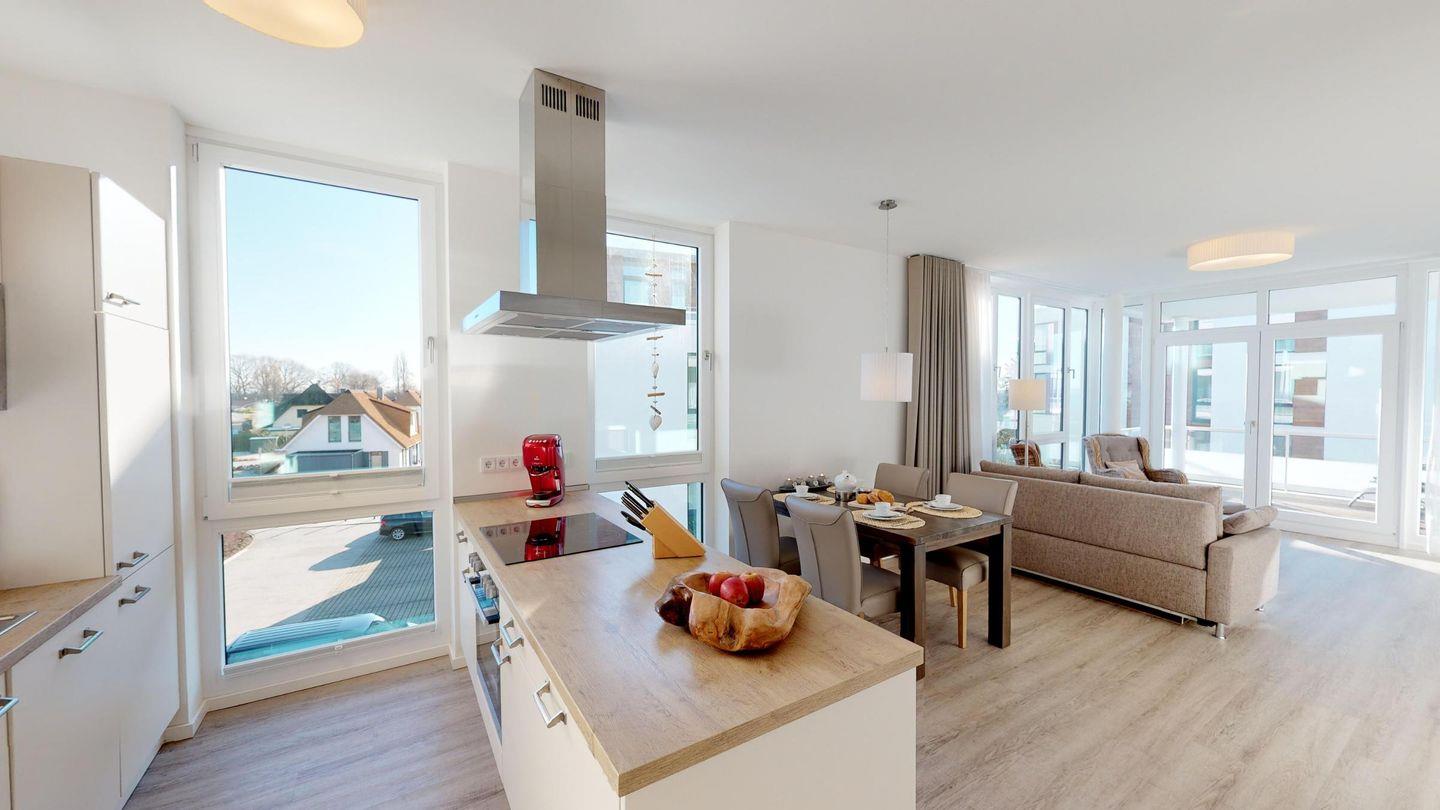 Der einladende Flur leitet Sie direkt in das Herzstück der Wohnung - das lichtdurchflutete Wohnzimmer mit Essbereich und einer offenen, hervorragend ausgestatteten Küche. Durch die große Fensterfront genießen Sie einen Blick auf die Ostsee. Weiterhin gibt es zwei Schlafzimmer mit jeweils einem Boxspring-Doppelbett - eines davon verfügt über ein angrenzendes eigenes Bad mit Badewanne. Ein weiteres Duschbad mit Dusche ist ebenfalls vorhanden.