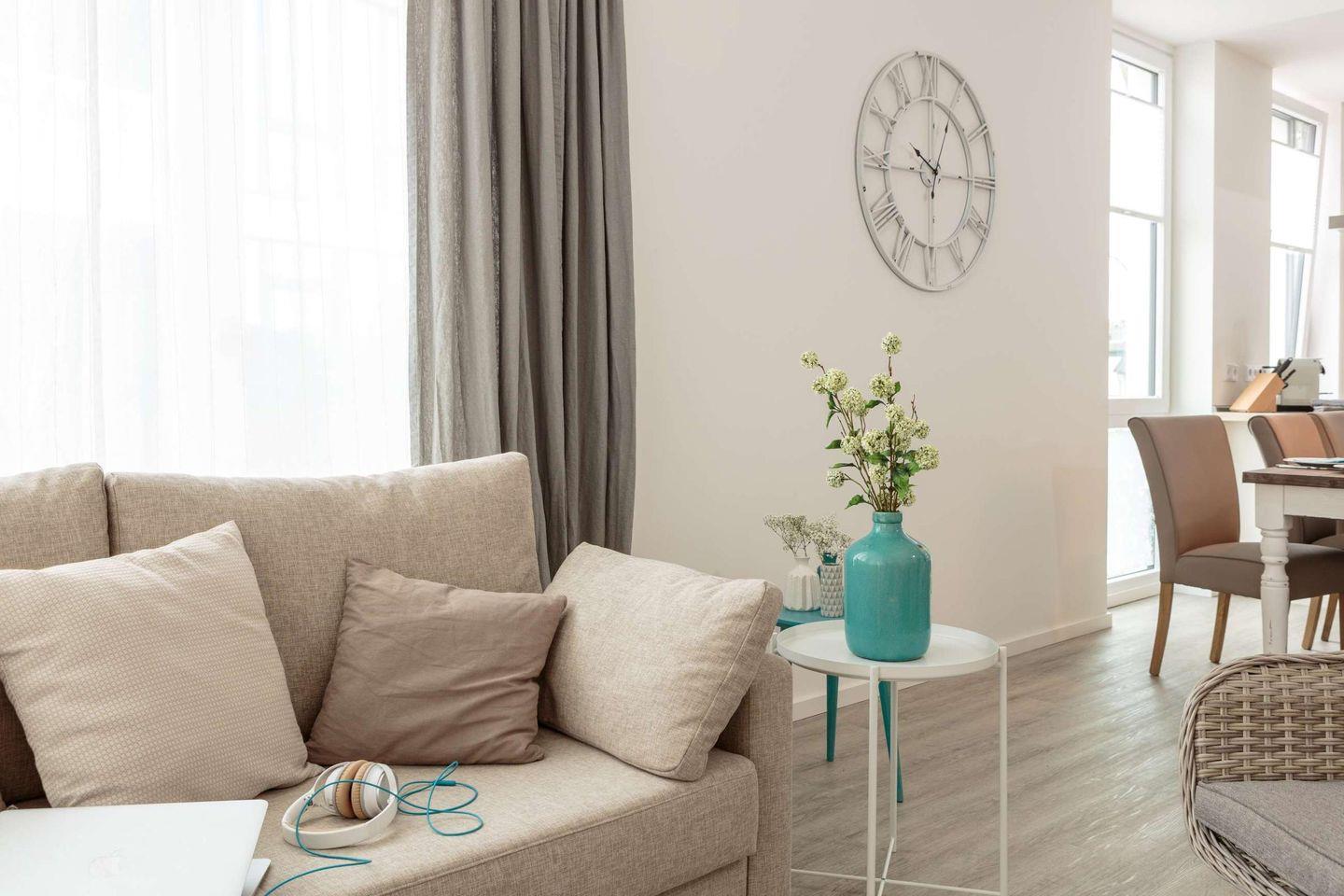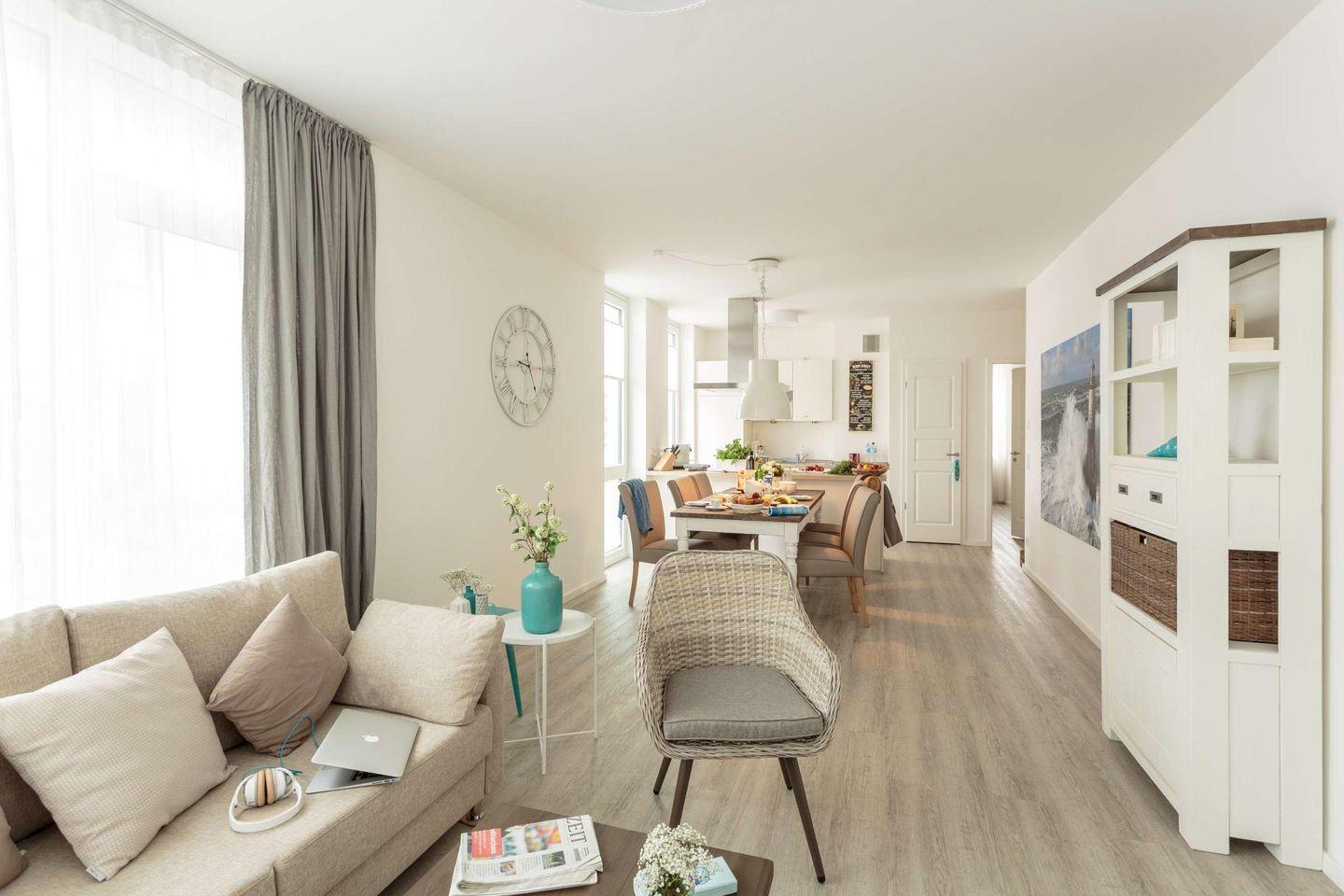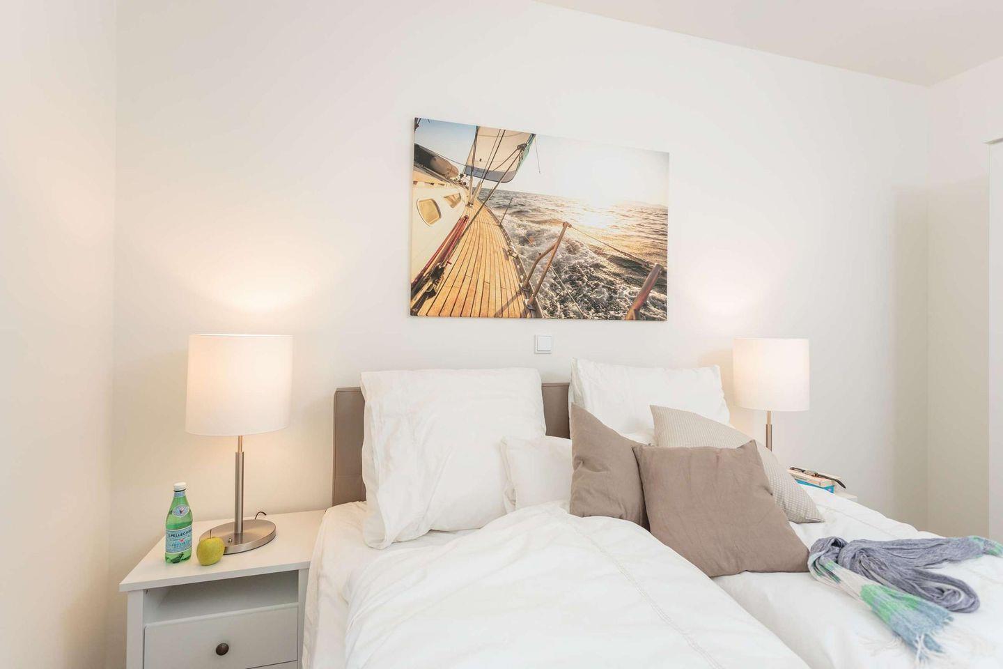 Die 85 m² Wohnfläche verteilen sich auf ein lichtdurchflutetes Wohnzimmer mit Essbereich und einer voll ausgestatteten Küche. Zusätzlich gibt es zwei Schlafzimmer, jeweils mit einem Boxspring-Doppelbett. Ein Badezimmer mit Badewanne befindet sich direkt angrenzend an einem der Schlafzimmer, während das andere Badezimmer mit Dusche separat liegt. Die Wohnung ist allergikerfreundlich.
