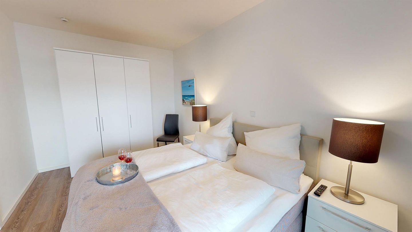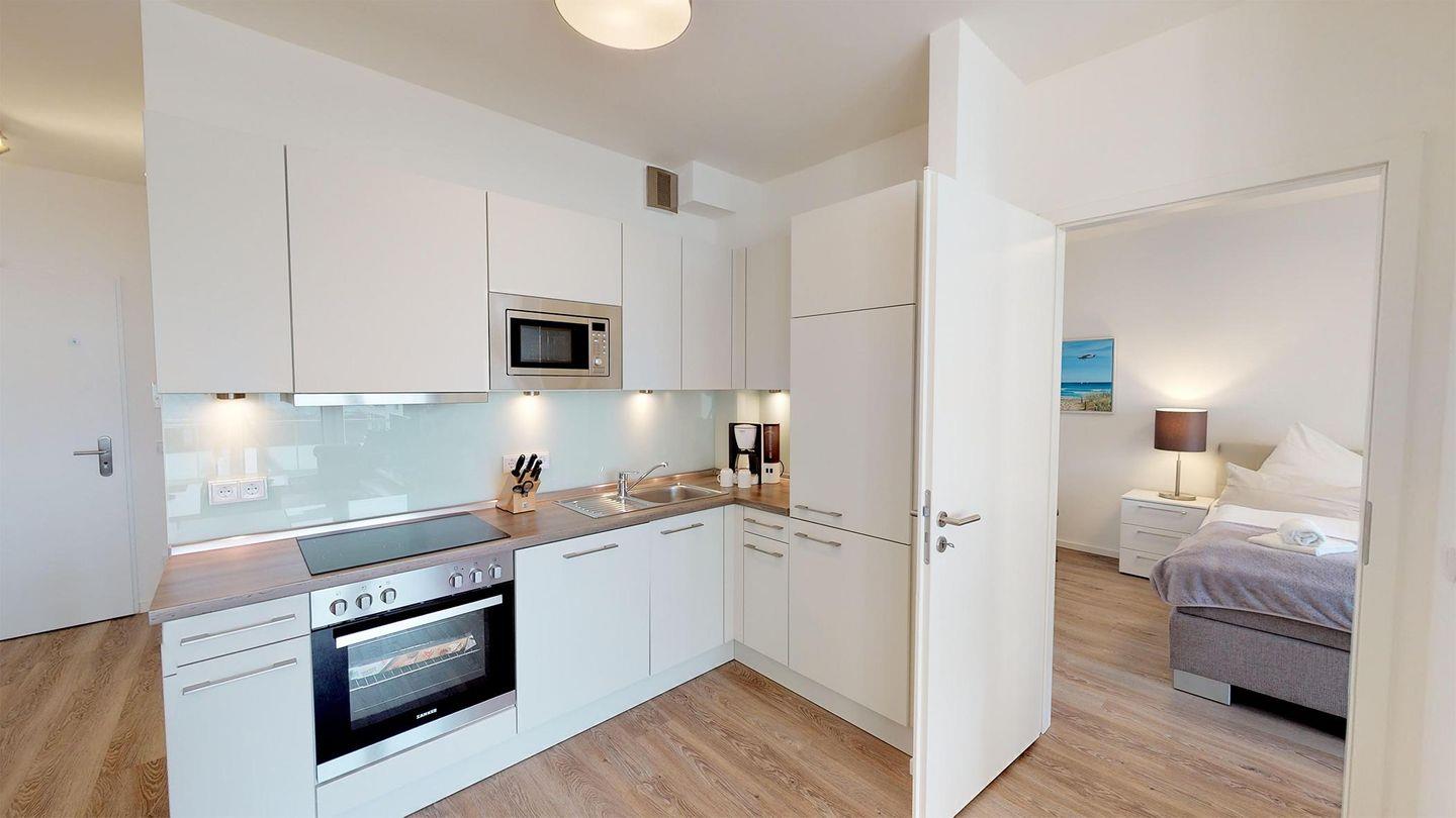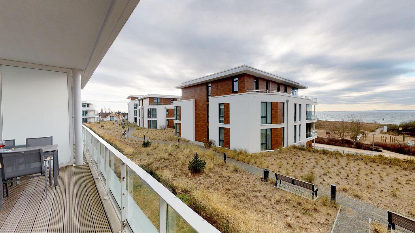 Das Apartment bietet lichtdurchflutete Räume und einen unglaublich schönen Meerblick. Über den Flur gelangen Sie linkerhand in das moderne Badezimmer mit Badewanne und Dusche. Zurück über den Flur erreichen Sie das große Wohnzimmer mit offener Küche und Essbereich. Hier können Sie den Ostseeblick vom Sofa aus genießen oder gemütliche Fernsehabende verbringen. Vom Wohnzimmer aus gelangen Sie in das Schlafzimmer mit großem Boxspringbett, Kleiderschrank und einem weiteren Fernseher. Direkt vom Schlafzimmer und auch vom Wohnzimmer aus haben Sie Zugang zum geräumigen Balkon, ausgestattet mit einem Tisch, vier Stühlen und einer Sonnenliege – perfekt, um die frische Ostseeluft zu genießen.