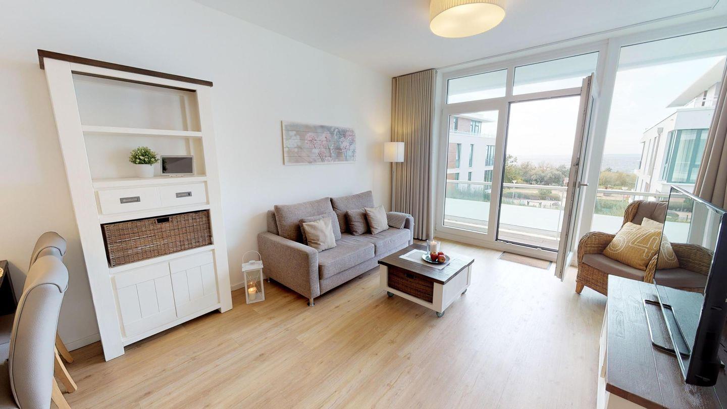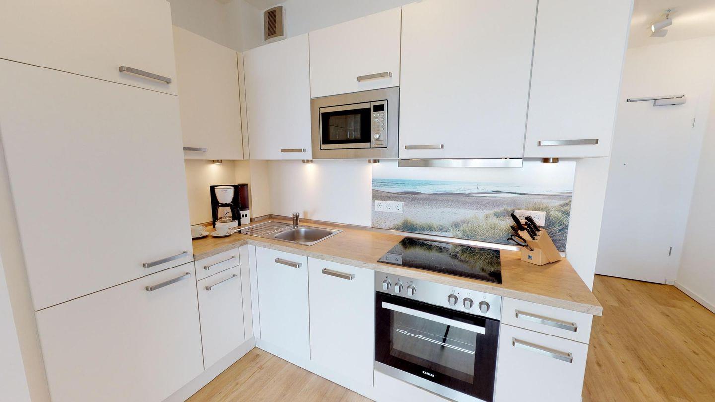 Der Flur führt Sie in das Badezimmer mit Dusche und Badewanne. Zurück auf dem Flur leitet dieser Ihren Weg direkt in das Herzstück des Apartments - den Wohnbereich. Eine offene Einbauküche, ein Essbereich sowie eine Sofaecke laden zum Verweilen ein. Die Fensterfront gibt den Blick frei auf die Ostsee.