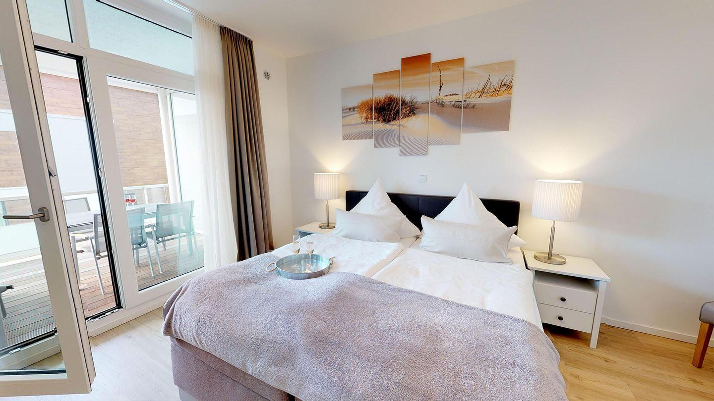 Weiterhin gibt es ein Schlafzimmer mit komfortablem Boxspring-Doppelbett. Auf den schönen Balkon gelangen Sie sowohl über das Wohnzimmer als auch über das Schlafzimmer. Zur Ausstattung gehört eine Sonnenliege sowie ein Tisch mit vier Stühlen. Außerdem gehören zur Ausstattung ein Hochstuhl sowie ein Kinderbett.