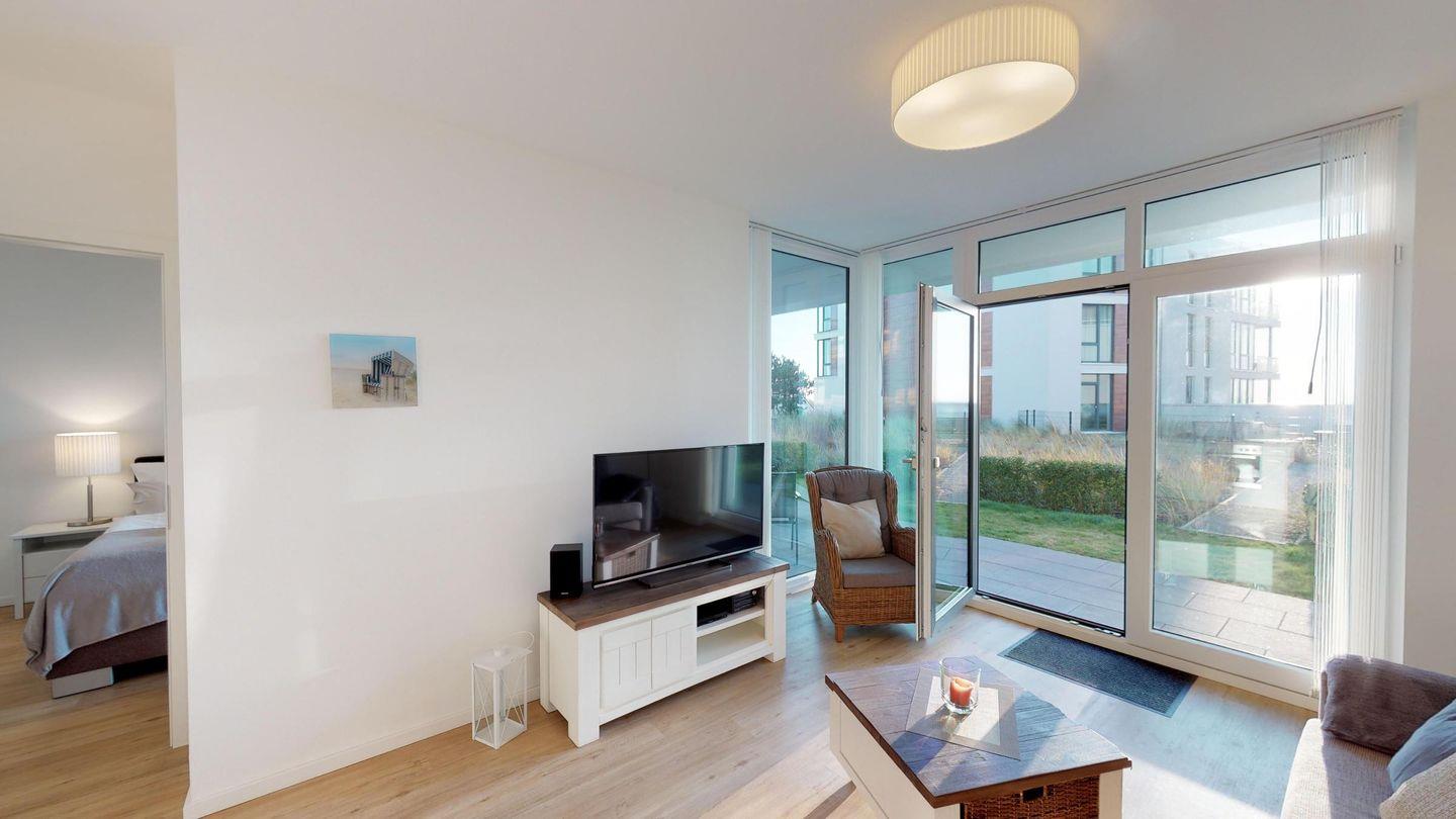 Sie werden direkt von dem hellen Wohn-/Essbereich begrüßt. Die offene, voll ausgestattete Einbauküche, eine Sofaecke und der Meerblick durch die Fensterfront machen das Urlaubsgefühl perfekt. Das Sofa bietet eine bequeme Schlafmöglichkeit für 2 Personen. Weiterhin gibt es ein modernes Badezimmer mit Badewanne und Dusche sowie ein Schlafzimmer mit einem Boxspring-Doppelbett.