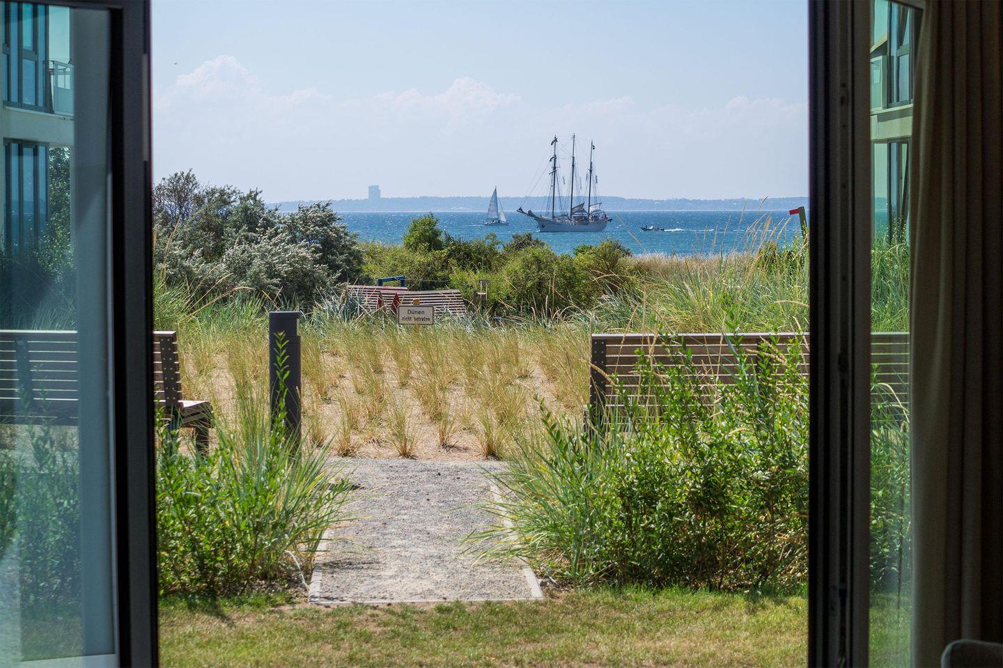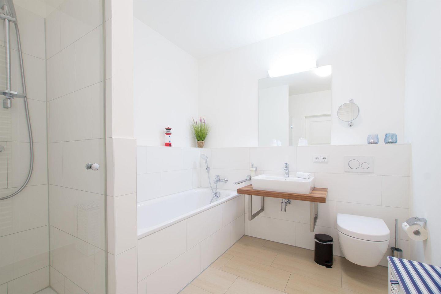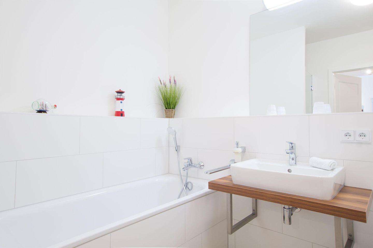 Der einladende Flur führt Sie ins schöne Badezimmer mit Badewanne und Dusche. Zurück auf dem Flur führt Sie ihr Weg direkt in das Herzstück des Apartments - den Wohnbereich. Hier erwarten Sie eine offene Einbauküche, ein einladender Essbereich und eine gemütliche Sofaecke, die zum Verweilen einladen. Genießen Sie den Blick aus dem Fenster, denn die Ostsee lacht Ihnen entgegen. Das Apartment verfügt außerdem über ein Schlafzimmer mit einem komfortablen Boxspring-Doppelbett.