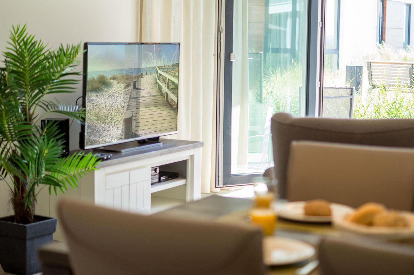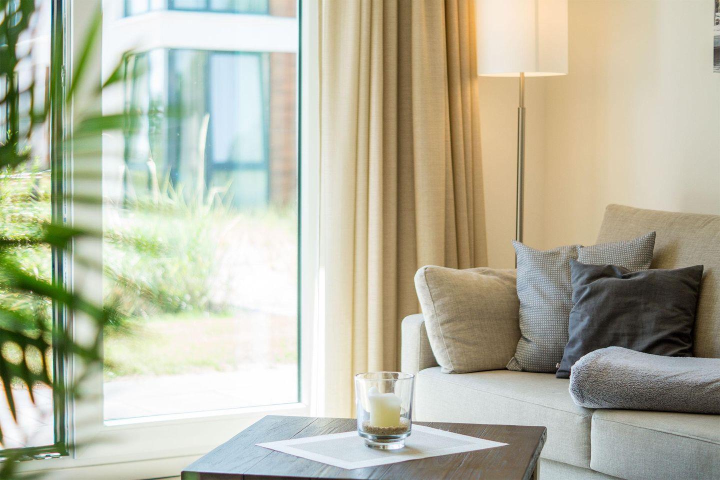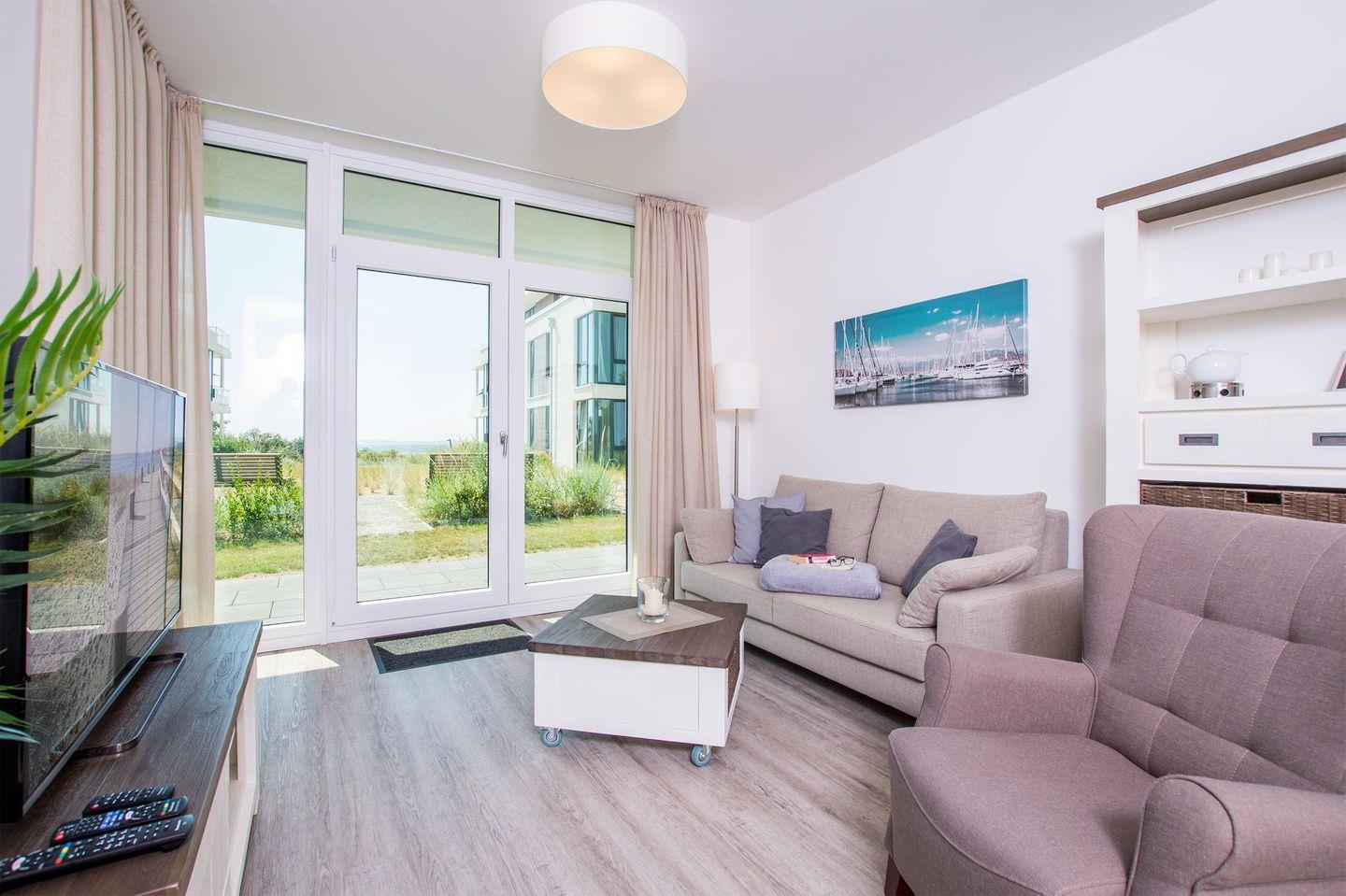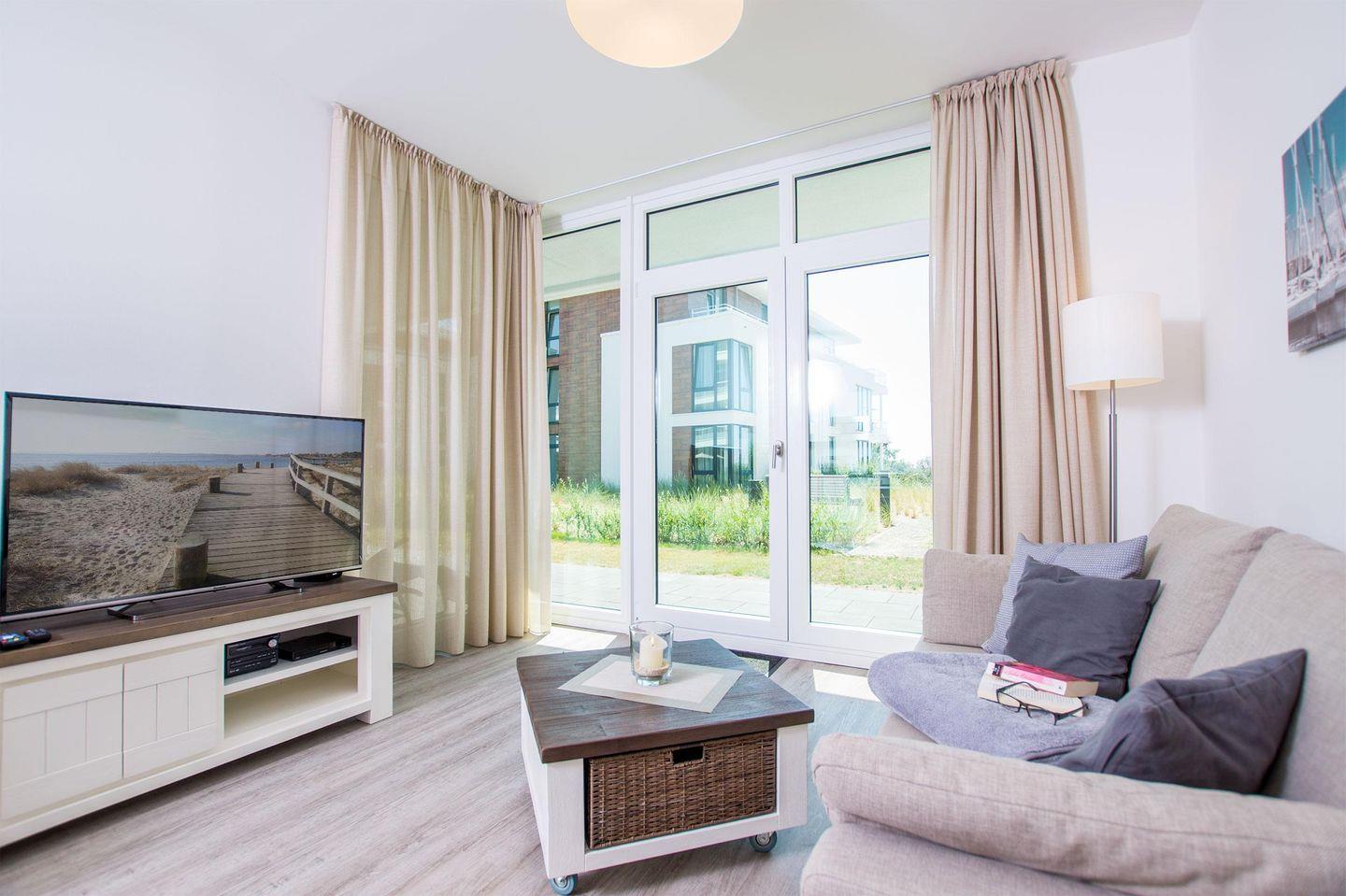 Der einladende Flur führt Sie ins schöne Badezimmer mit Badewanne und Dusche. Zurück auf dem Flur führt Sie ihr Weg direkt in das Herzstück des Apartments - den Wohnbereich. Hier erwarten Sie eine offene Einbauküche, ein einladender Essbereich und eine gemütliche Sofaecke, die zum Verweilen einladen. Genießen Sie den Blick aus dem Fenster, denn die Ostsee lacht Ihnen entgegen. Das Apartment verfügt außerdem über ein Schlafzimmer mit einem komfortablen Boxspring-Doppelbett.
