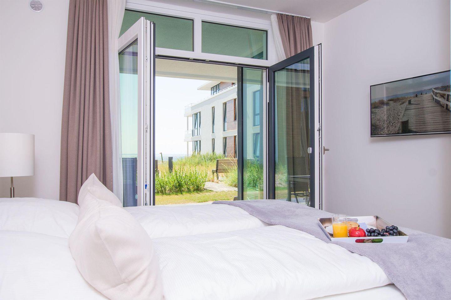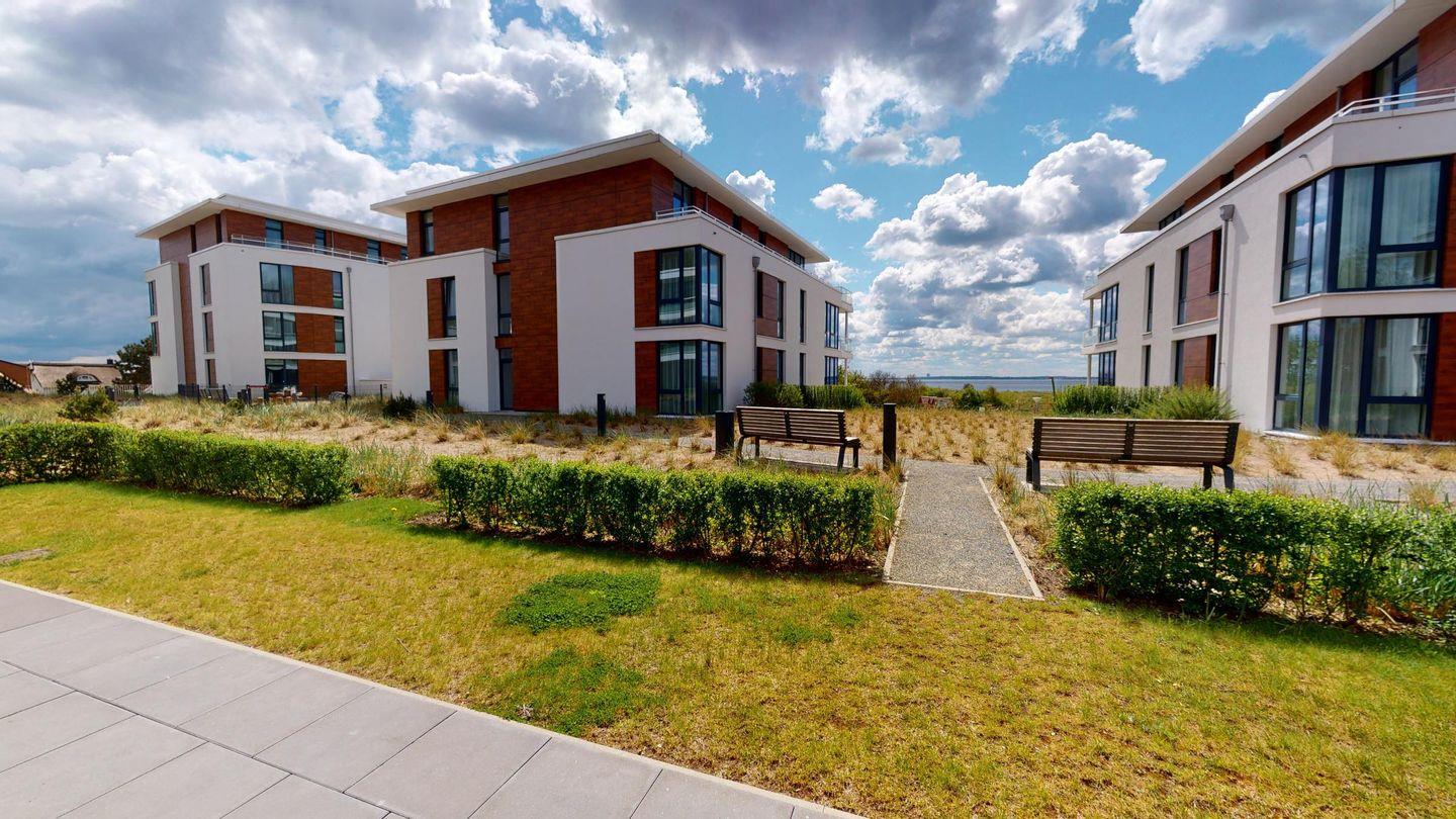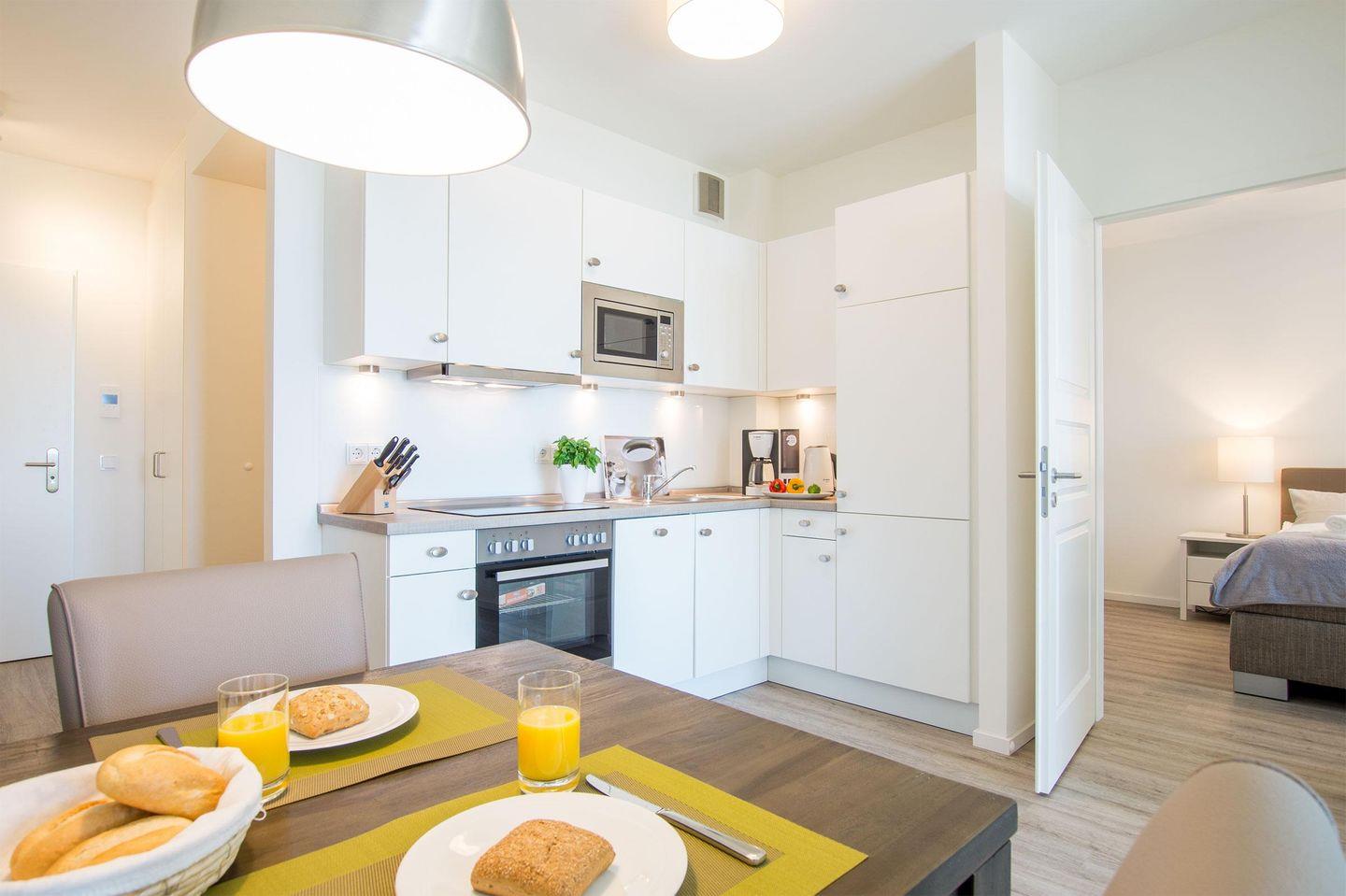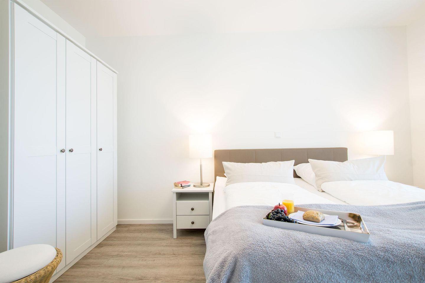 Das 60 m² große 2-Zimmer-Apartment befindet sich im 1. OG des Hauses B und ist für eine Belegung mit 2 Personen und Hund ausgelegt. Ihr Auto können Sie auf dem wohnungseigenen Tiefgaragenstellplatz parken. Mit dem Aufzug oder über die Treppe gelangen Sie zum Apartment.