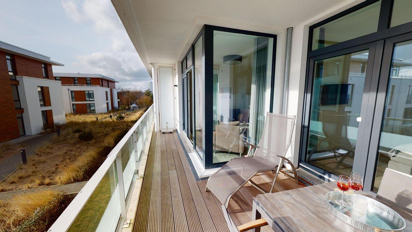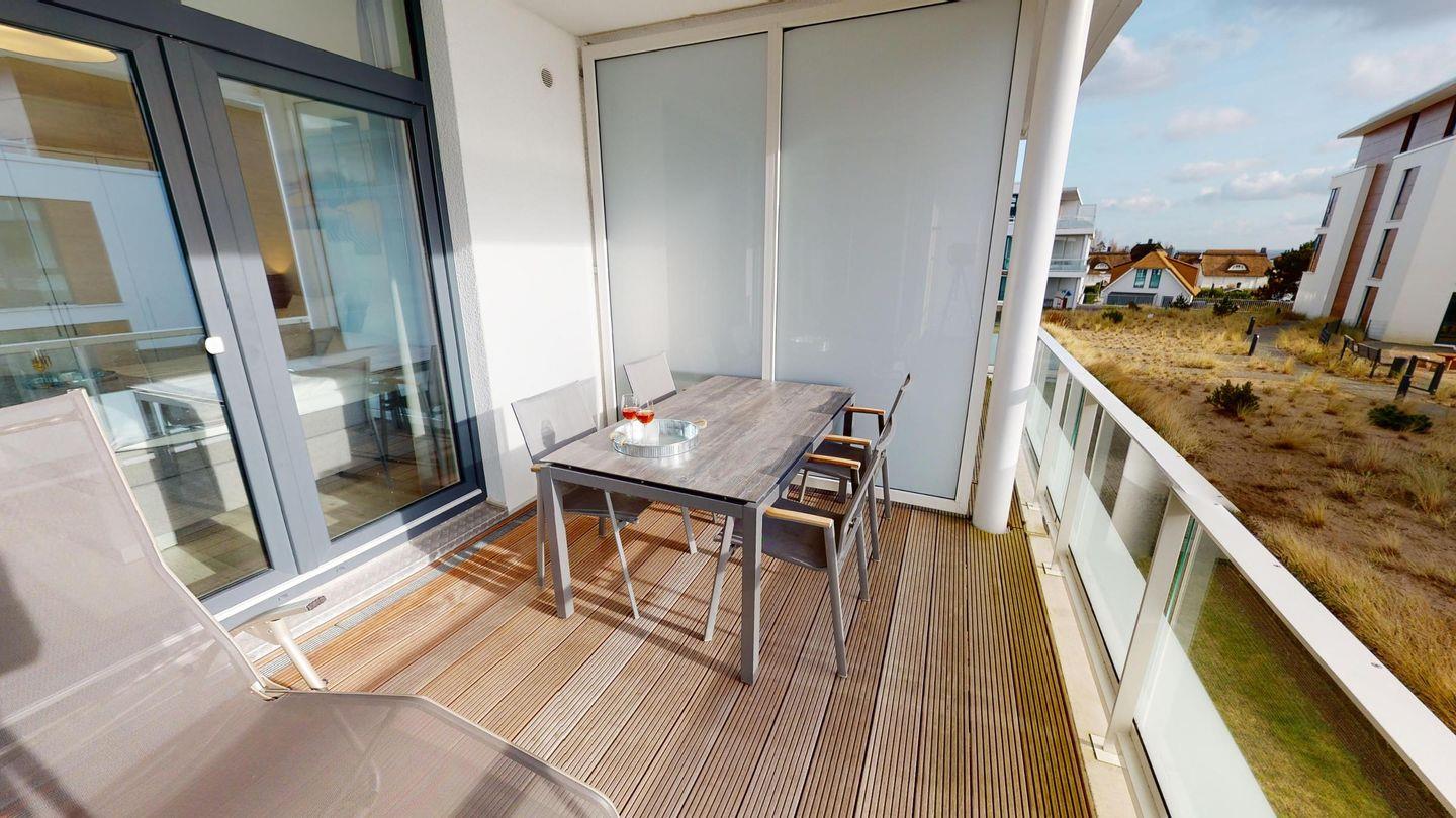 Auf den schönen Balkon gelangen Sie sowohl über das Wohnzimmer als auch über das Schlafzimmer. Zur Ausstattung gehören eine Sonnenliege sowie ein Tisch mit vier Stühlen.